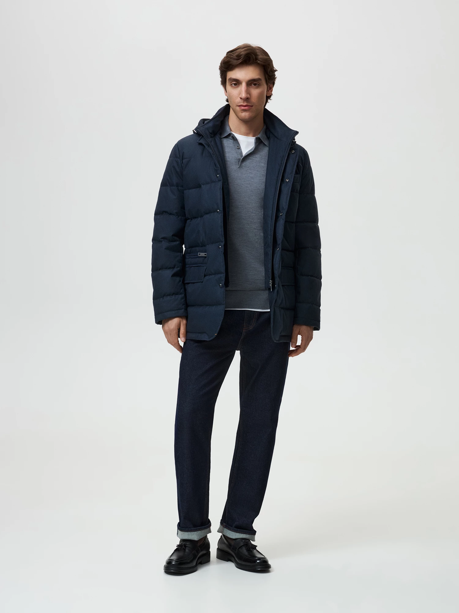Теплая стильная куртка на кнопках и молнии, из высокотехнологичной ткани с водоотталкивающей пропиткой. Модель дополнена капюшоном с современной фиксирующей корд-системой и манишкой. Для комфорта добавлены боковые карманы с клапанами и декоративный прорезной карман на молнии в рамку, также добавлены внутренние карманы, два на молнии и один накладной. В области проймы модель дополнена двумя небольшими вентиляционными отверстиями. Качественный современный гипоаллергенный наполнитель биопух Sorona делает модель теплой и ультралегкой. Sorona (рус. "сорона") - высокотехнологичный полусинтетический наполнитель, в состав которого входит до 37% возобновляемых волокон растительного происхождения. Приобретая верхнюю одежду, утепленную биопухом SORONA, Вы можете быть уверены, что такой выбор является экологически ответственным и оказывает минимальное воздействие на окружающую среду. Пуховик в строгом темно-синем универсален, подходит для офиса, прогулок, отдыха.