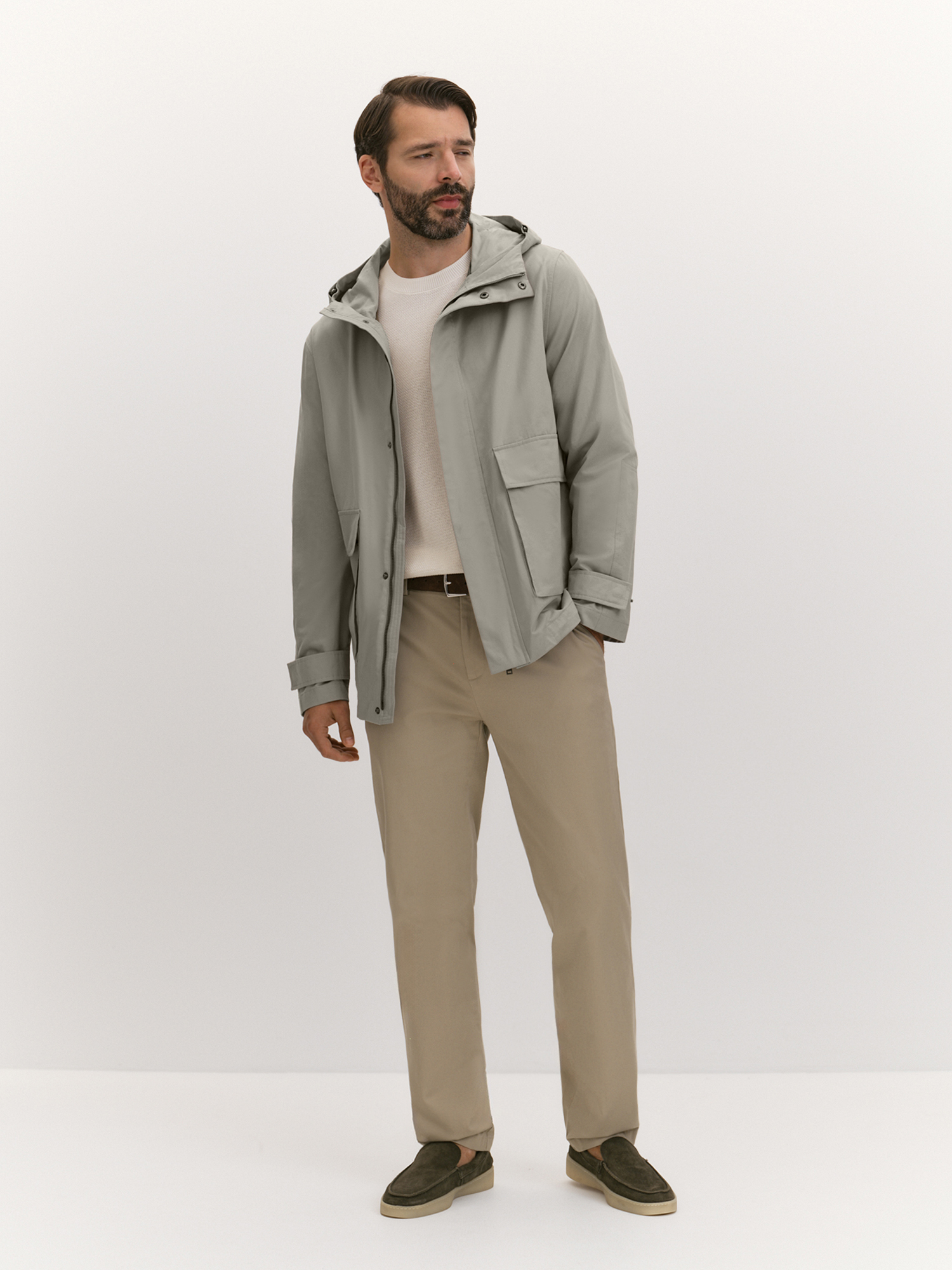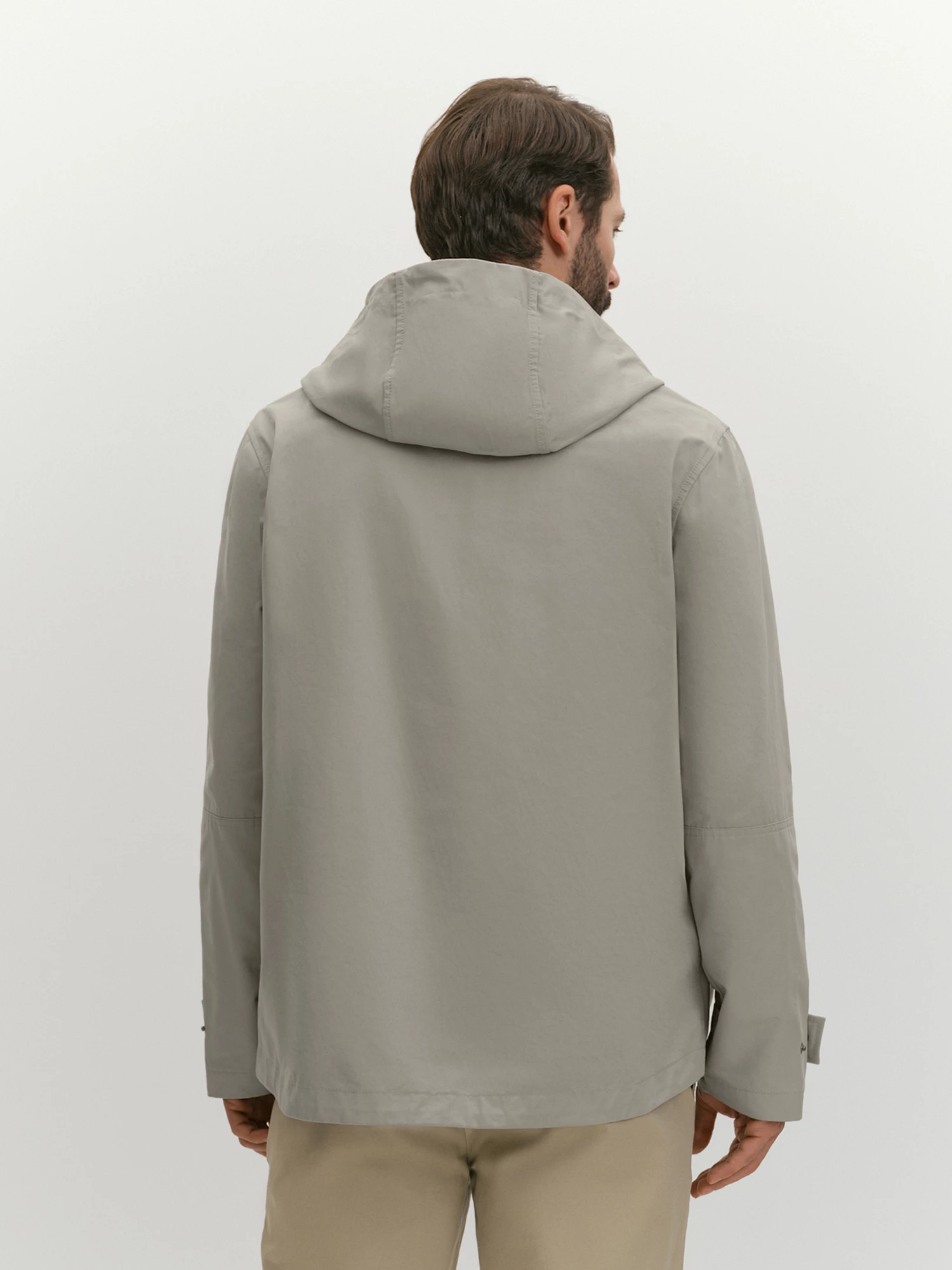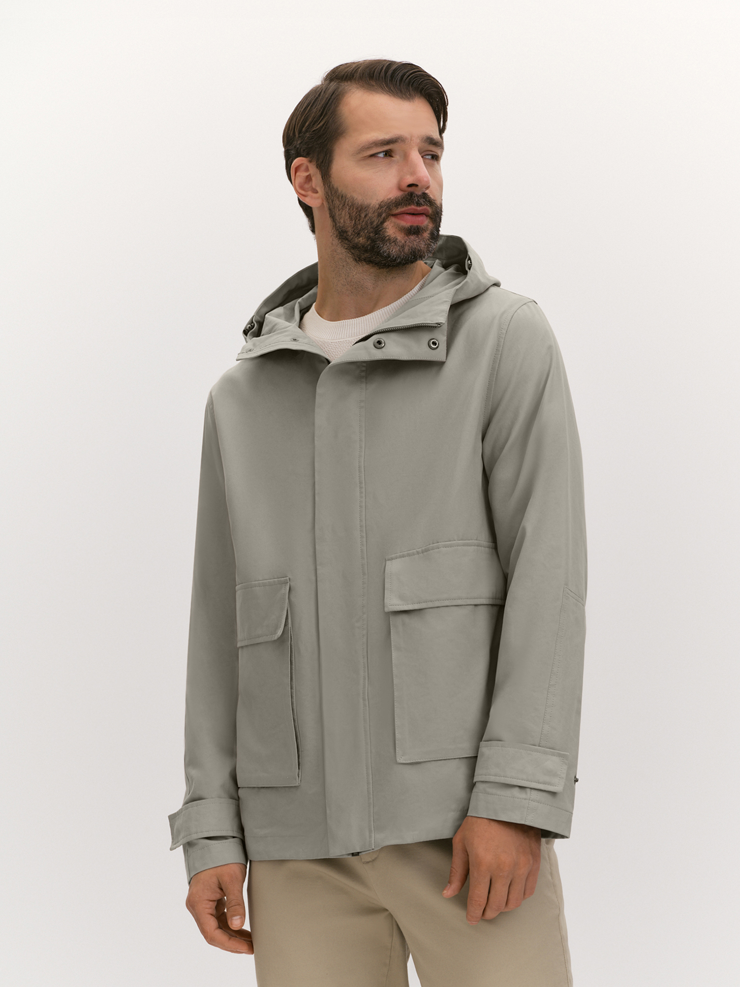 Верхняя текстильная часть куртки выполнена из ткани плотного переплетения с водоотталкивающей пропиткой и на основе хлопка. Такое полотно хорошо дышит за счет высокого содержания хлопка и тактильно приятно благодаря шелковистой поверхности. Несъемный капюшон, переходящий в стойку, дополнен современной корд-системой со скрытыми фиксаторами и хорошо защищает от ветра. Те же функции у надежной застежки на молнию, наружного ветрозащитного клапана и хлястиков на рукавах, фиксирующихся кнопками. Акцентной деталью являются накладные карманы с клапанами и боковым входом.