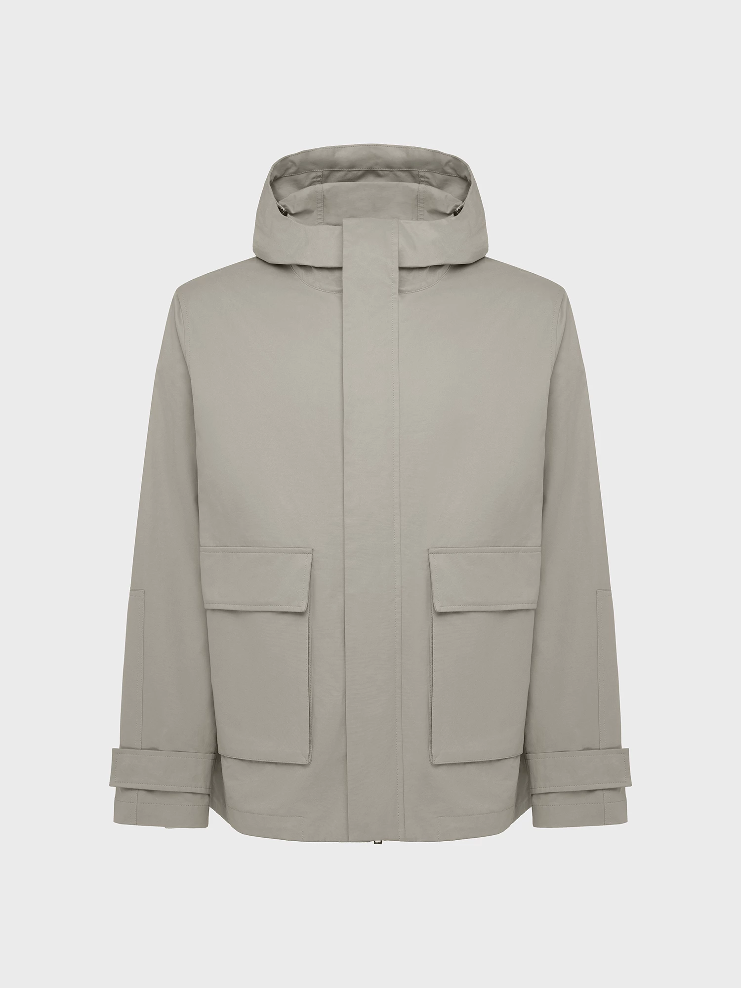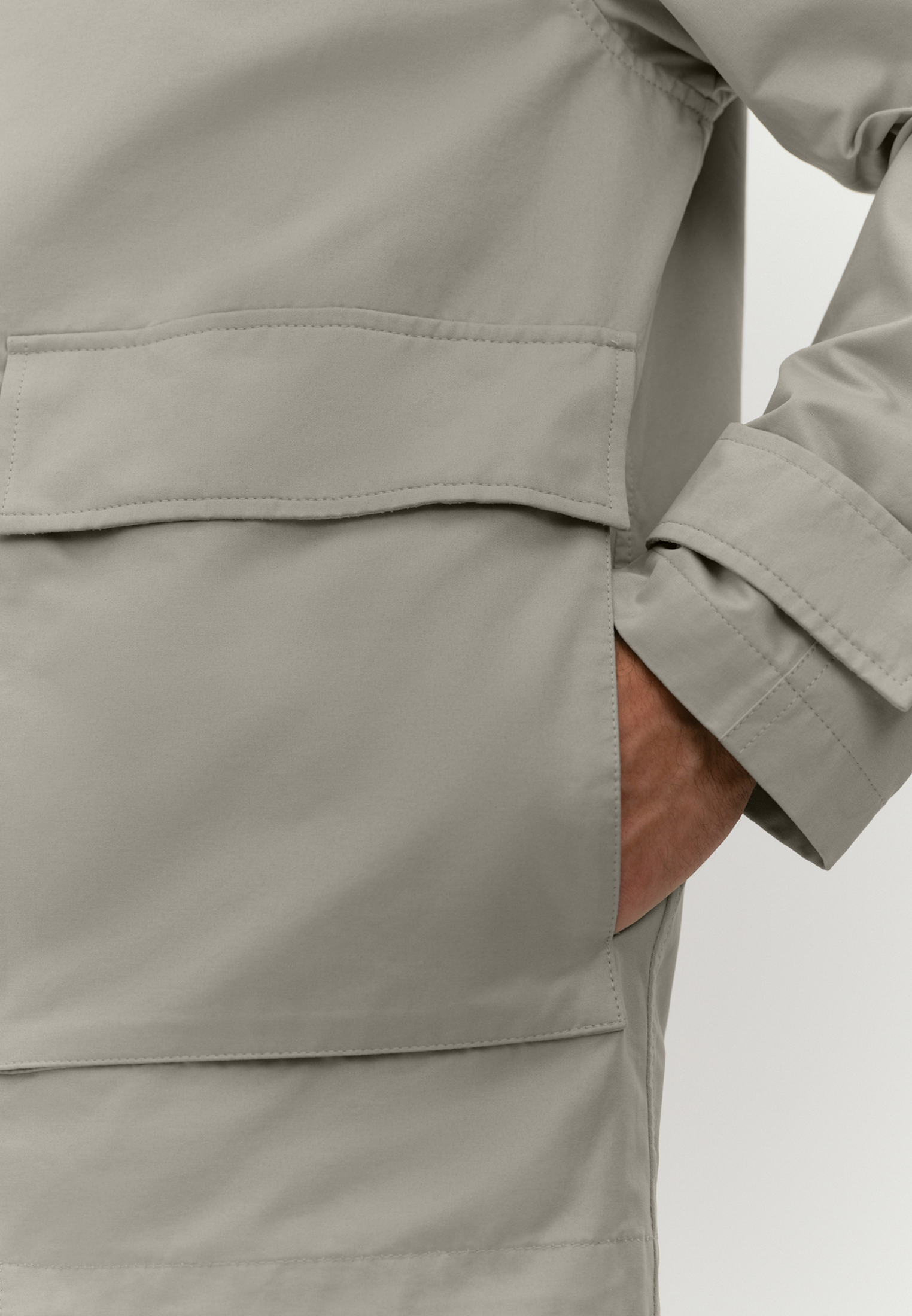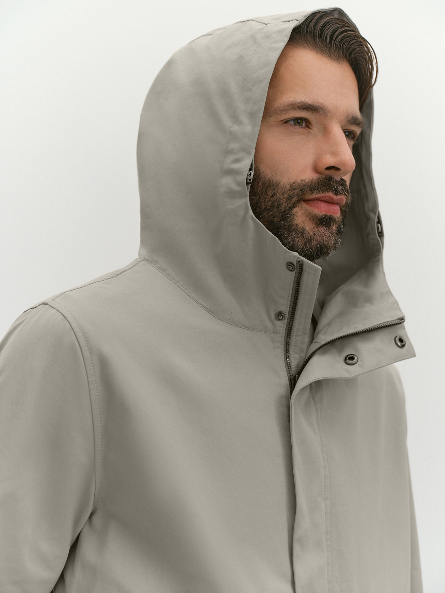Верхняя текстильная часть куртки выполнена из ткани плотного переплетения с водоотталкивающей пропиткой и на основе хлопка. Такое полотно хорошо дышит за счет высокого содержания хлопка и тактильно приятно благодаря шелковистой поверхности. Несъемный капюшон, переходящий в стойку, дополнен современной корд-системой со скрытыми фиксаторами и хорошо защищает от ветра. Те же функции у надежной застежки на молнию, наружного ветрозащитного клапана и хлястиков на рукавах, фиксирующихся кнопками. Акцентной деталью являются накладные карманы с клапанами и боковым входом.