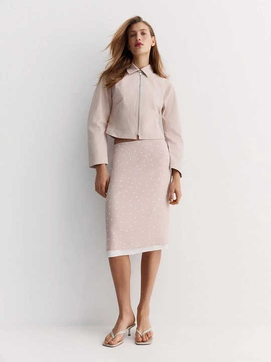 Светлый принт "полька дот" нежно смотрится на фоне цвета розовой пудры. Модель составит оригинальный образ с жакетом JC0206