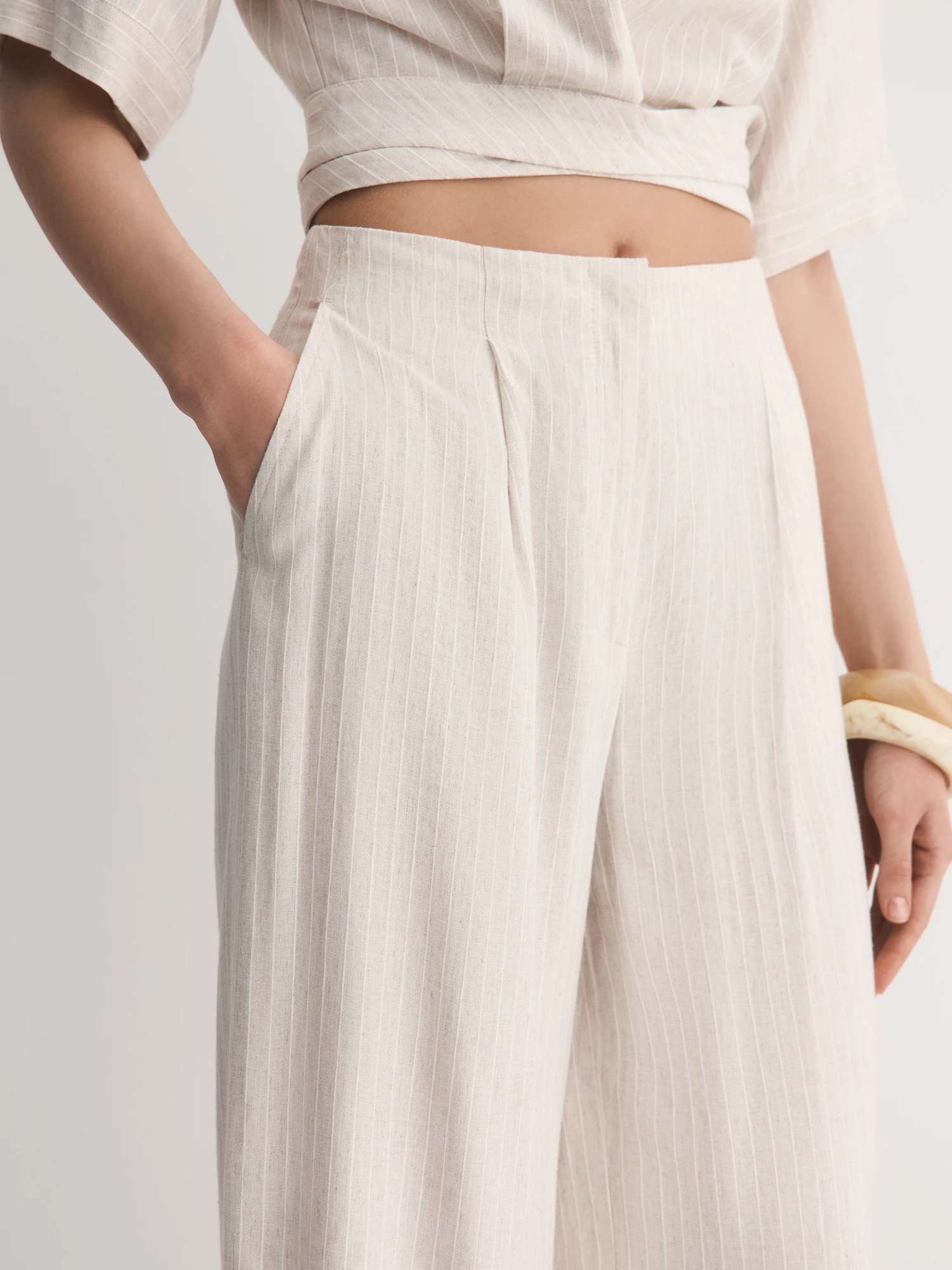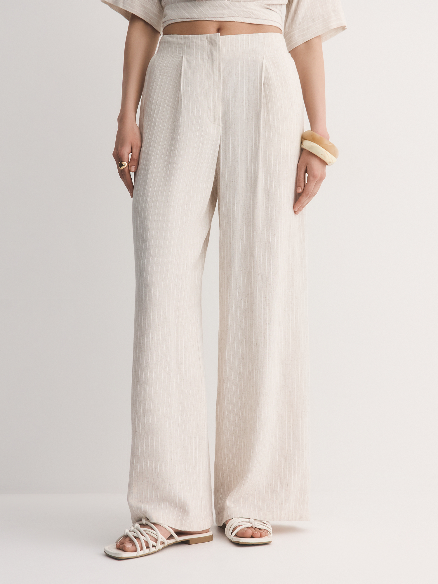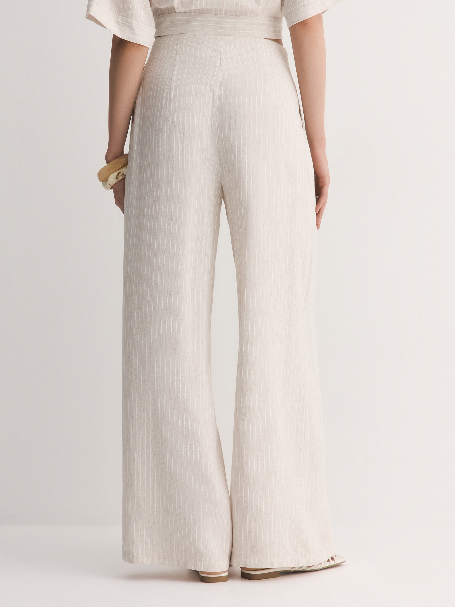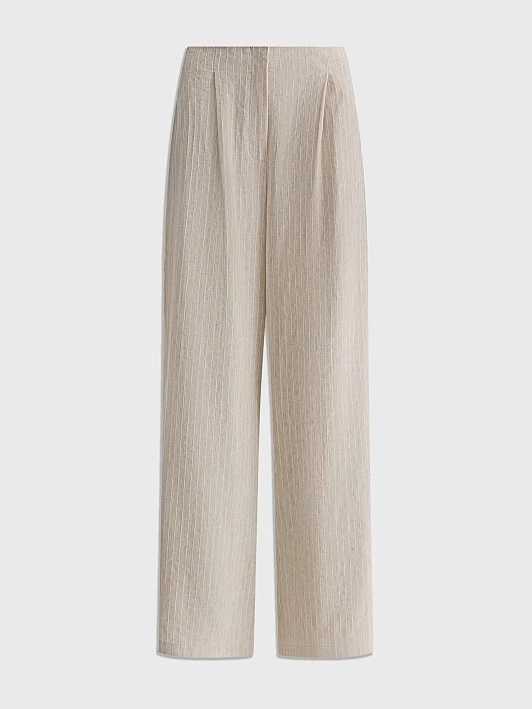 Выбрали для модели смесовую легкую ткань с шелковистой вискозой, фактурным льном и прочным полиэстером. Нежный бежевый оттенок с тонкой светлой полоской делает брюки универсальными для любого образа. Боковые карманы добавляют удобства в повседневной носке.