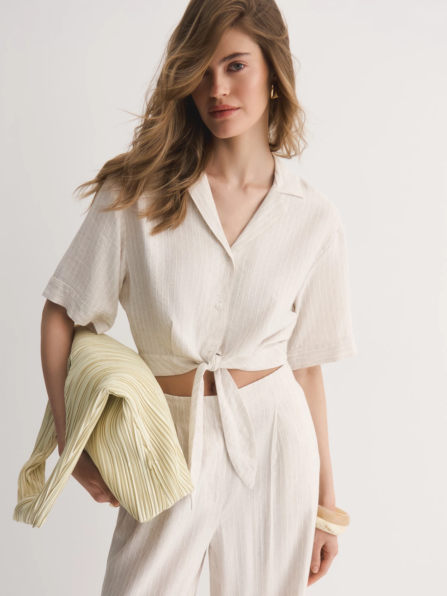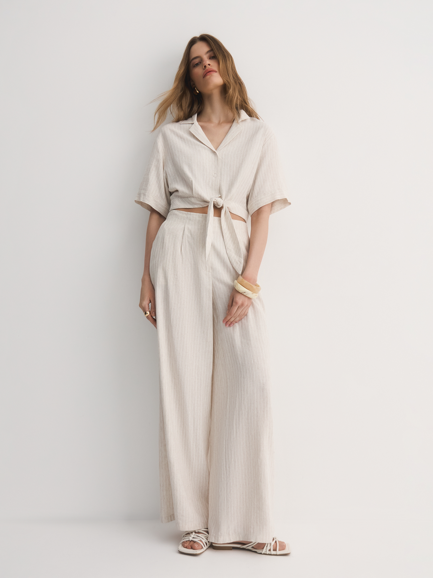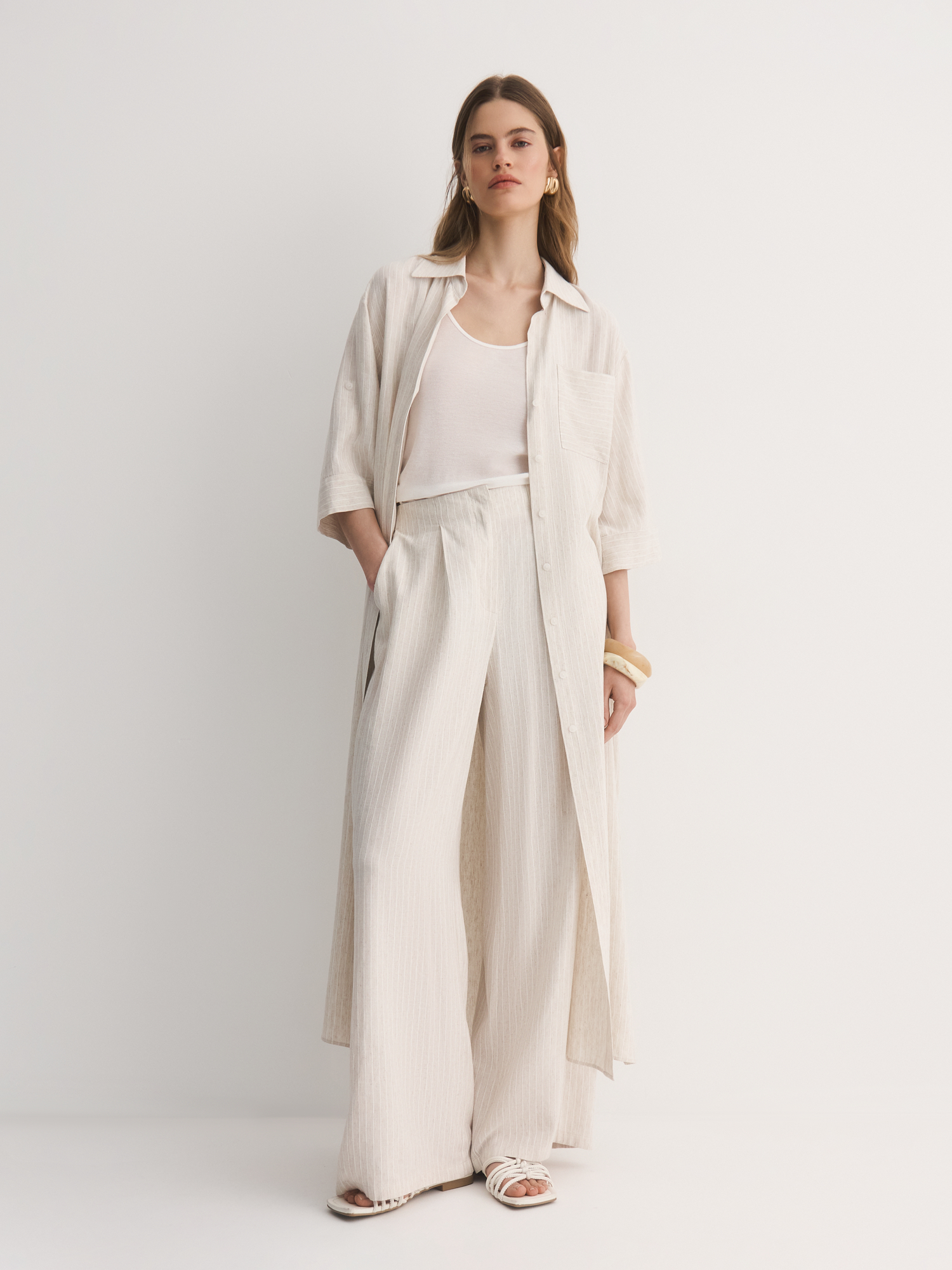 Выбрали для модели смесовую легкую ткань с шелковистой вискозой, фактурным льном и прочным полиэстером. Нежный бежевый оттенок с тонкой светлой полоской делает брюки универсальными для любого образа. Боковые карманы добавляют удобства в повседневной носке.