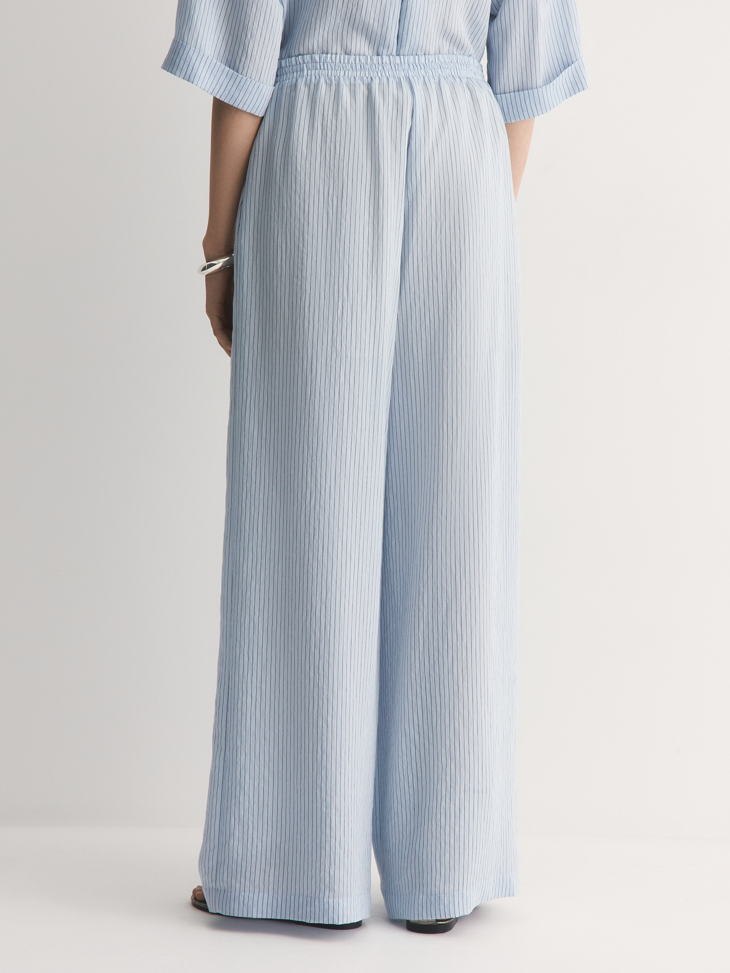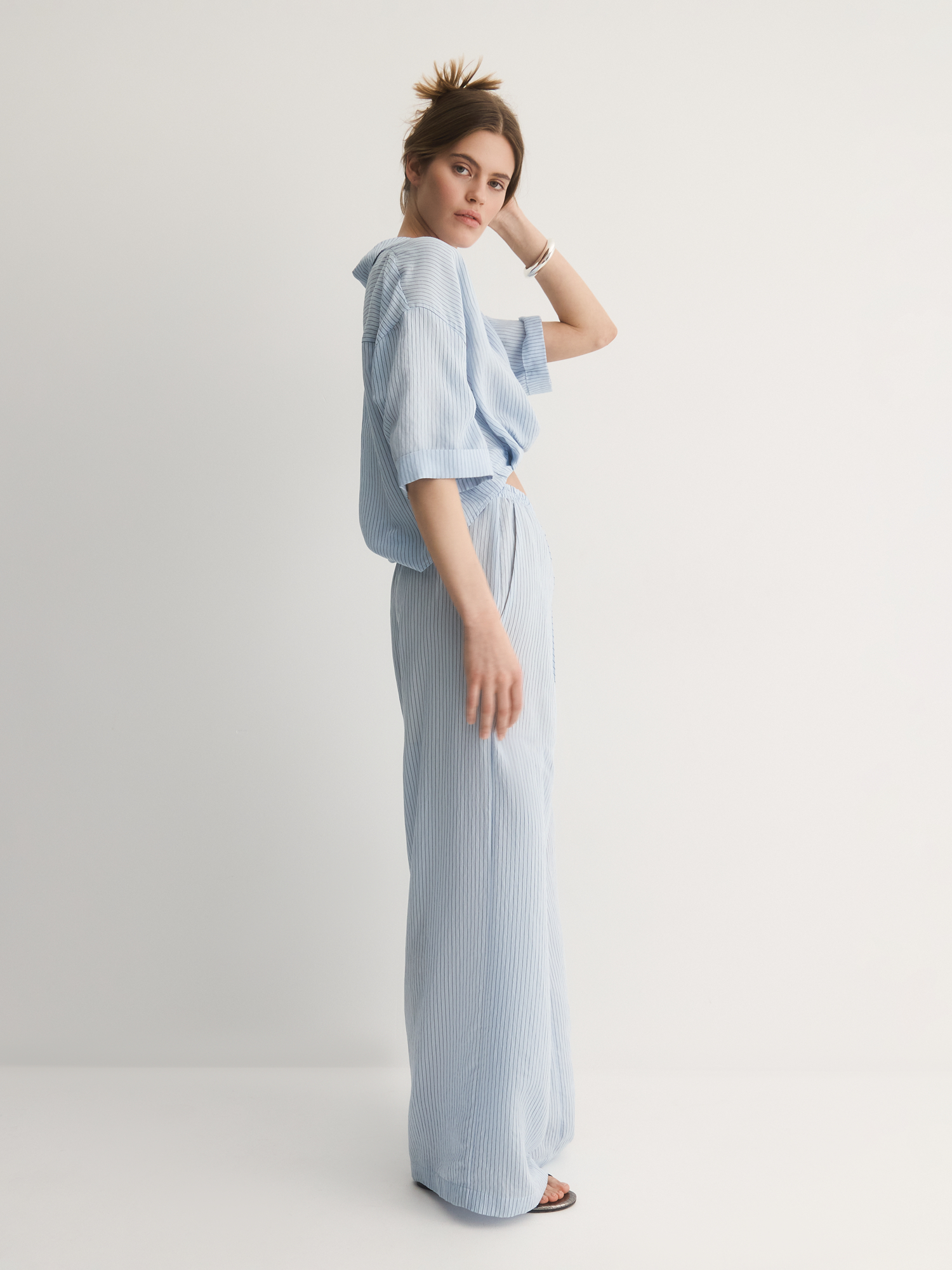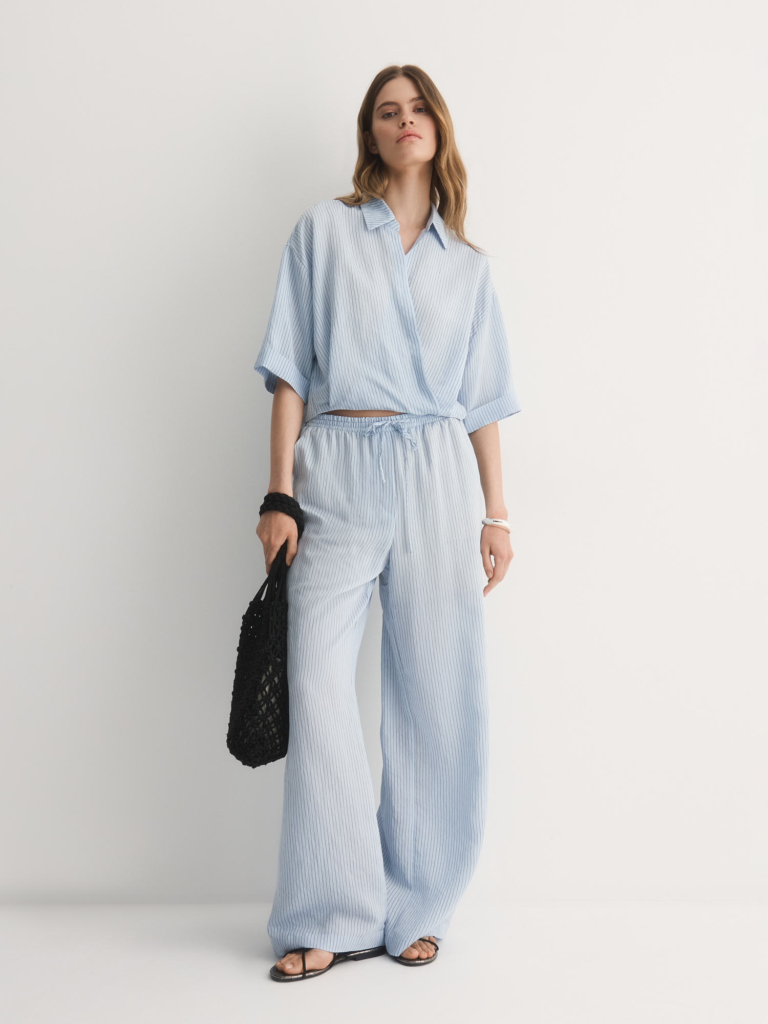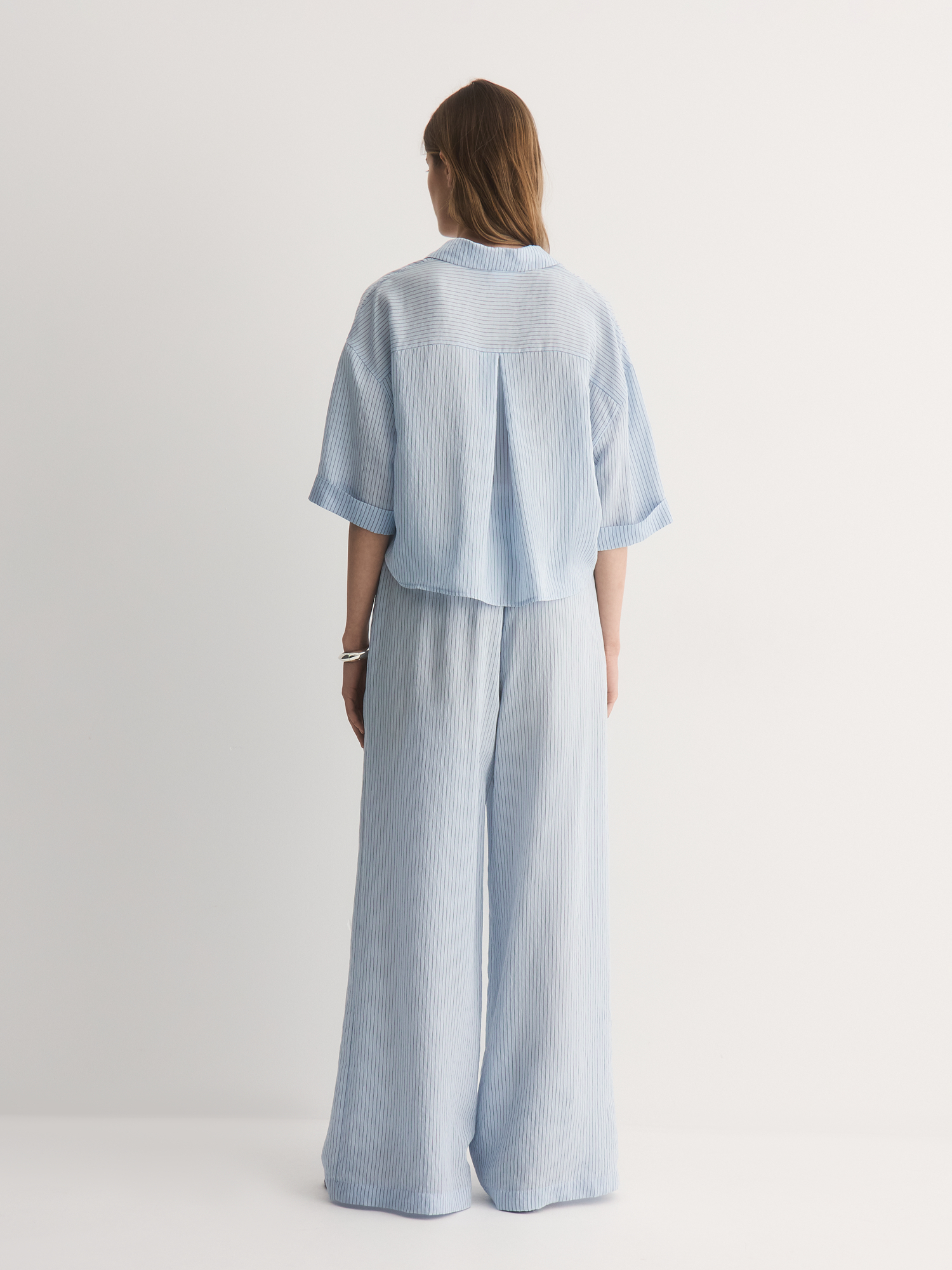 Нежно-голубые легкие брюки-бестселлер – идеальный баланс комфорта и стиля. Их прямой крой с аккуратными складками создаёт удобный силуэт, который мягко подчёркивает фигуру, не сковывая движений.