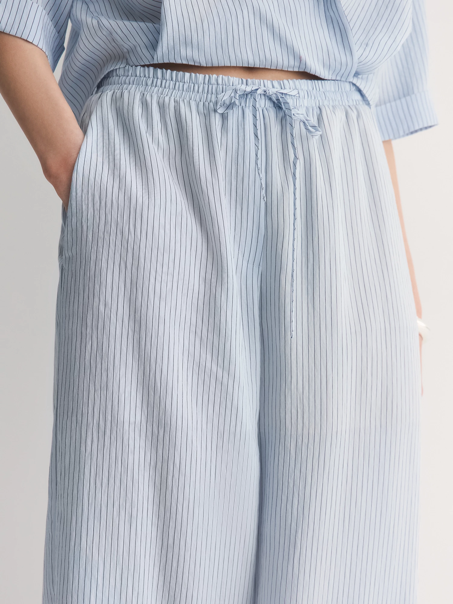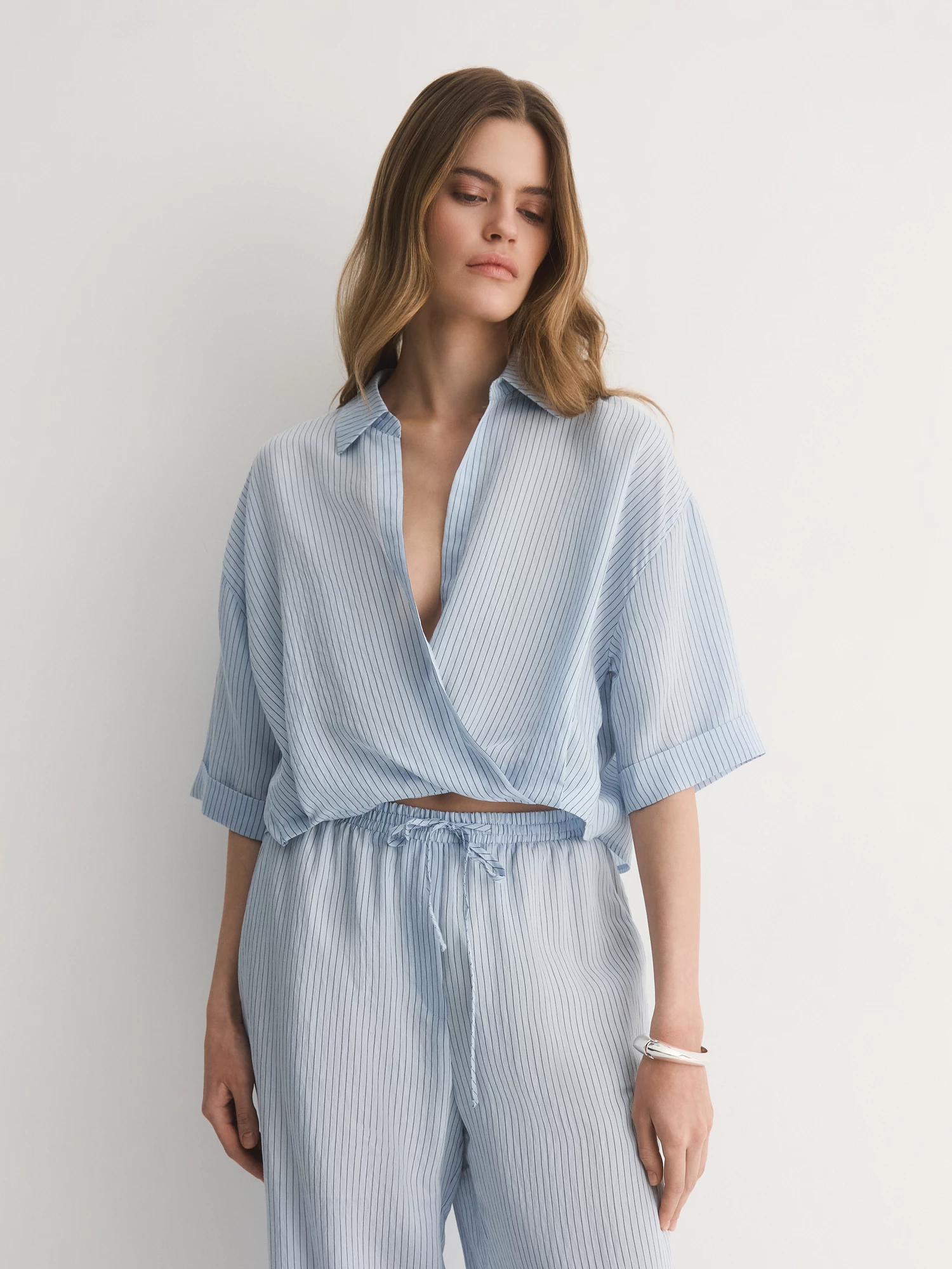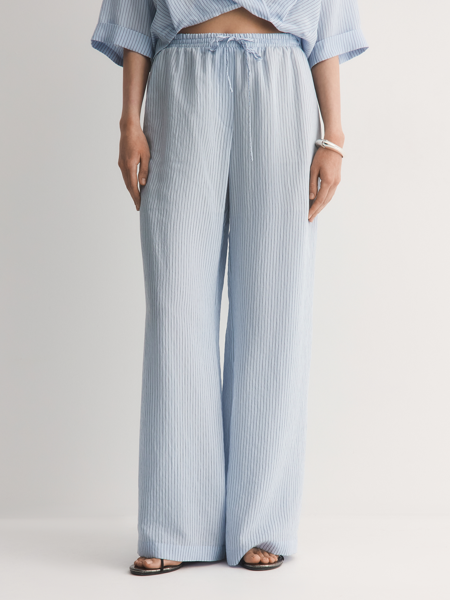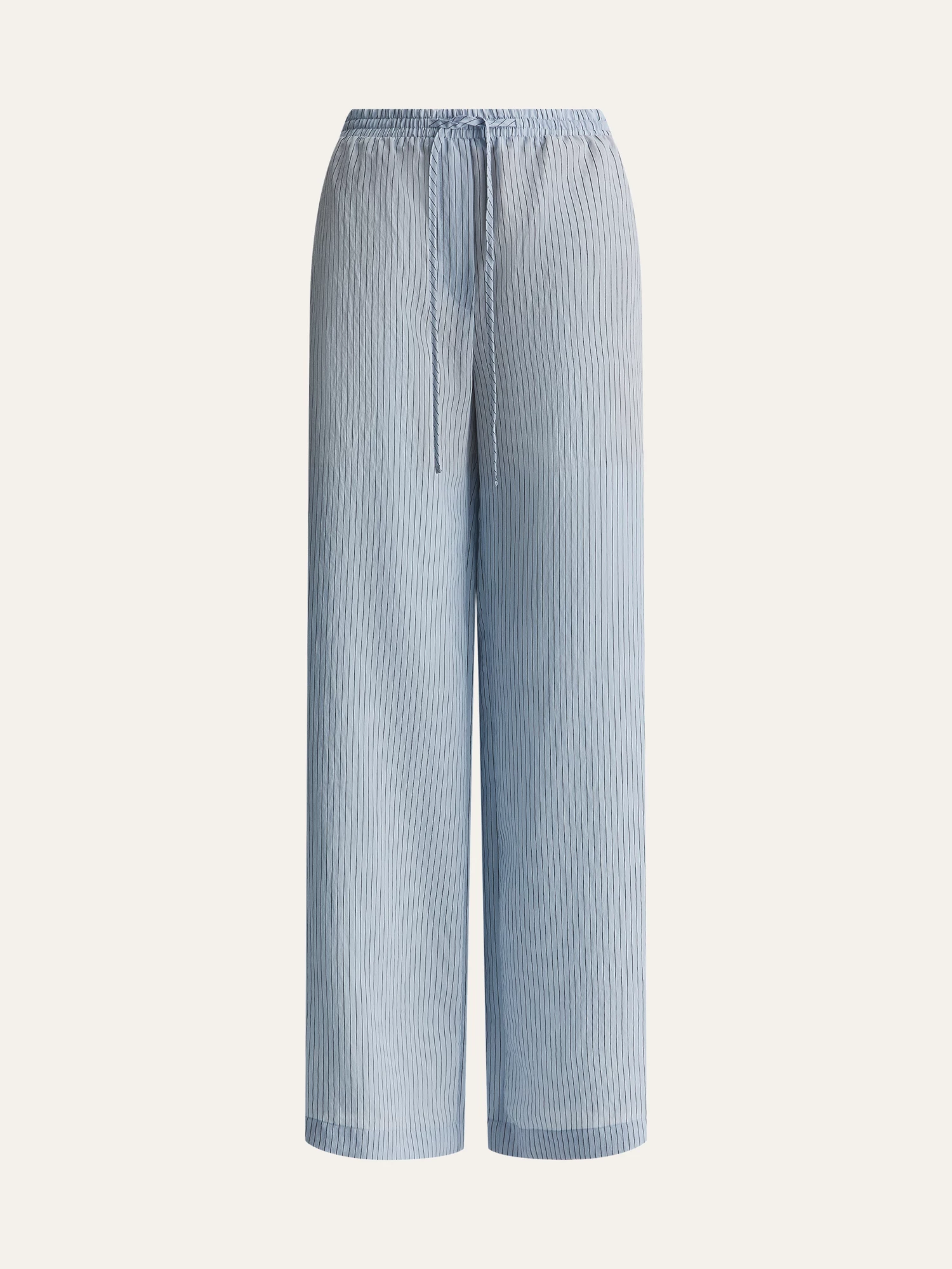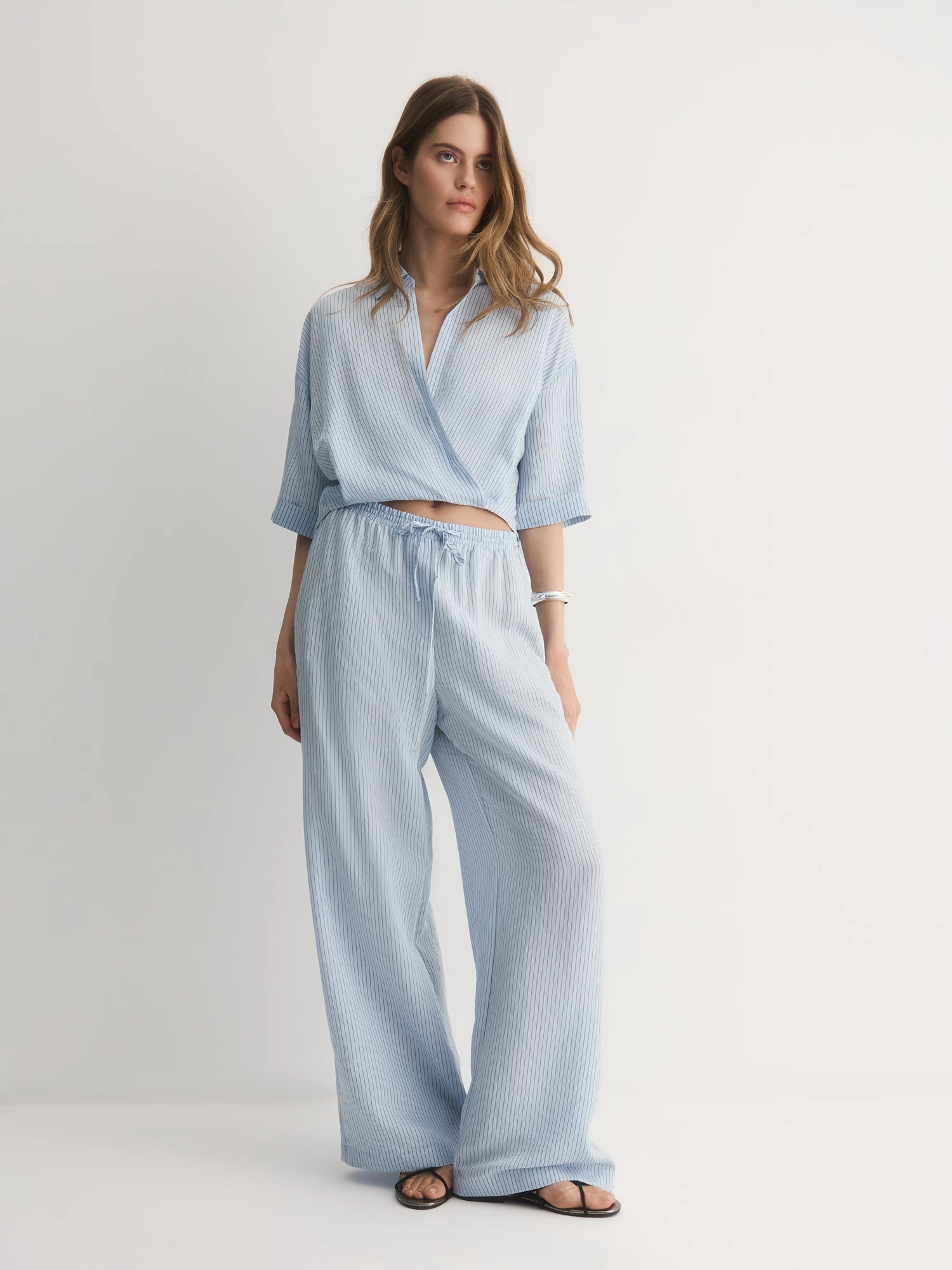 Нежно-голубые легкие брюки-бестселлер – идеальный баланс комфорта и стиля. Их прямой крой с аккуратными складками создаёт удобный силуэт, который мягко подчёркивает фигуру, не сковывая движений.
