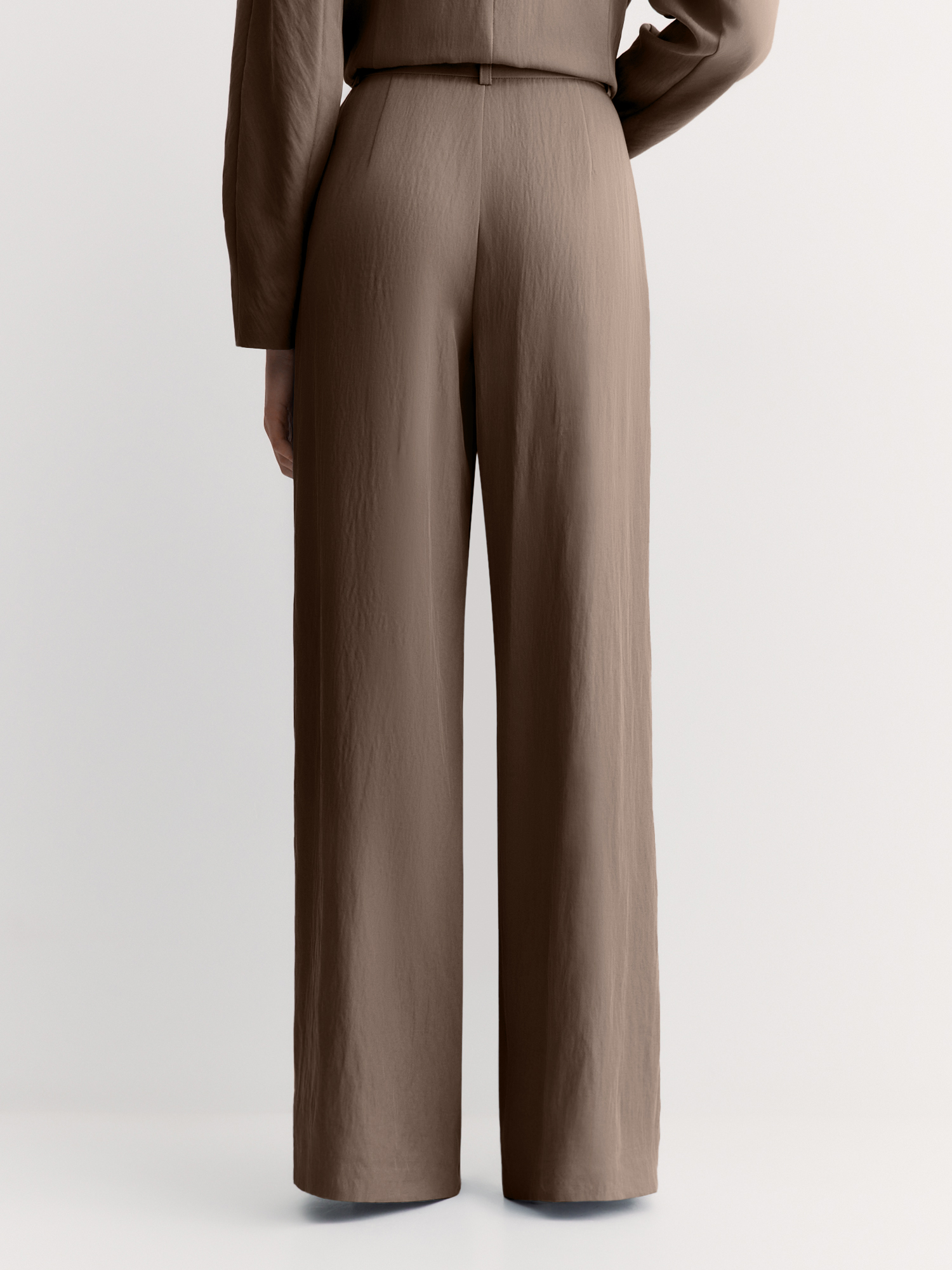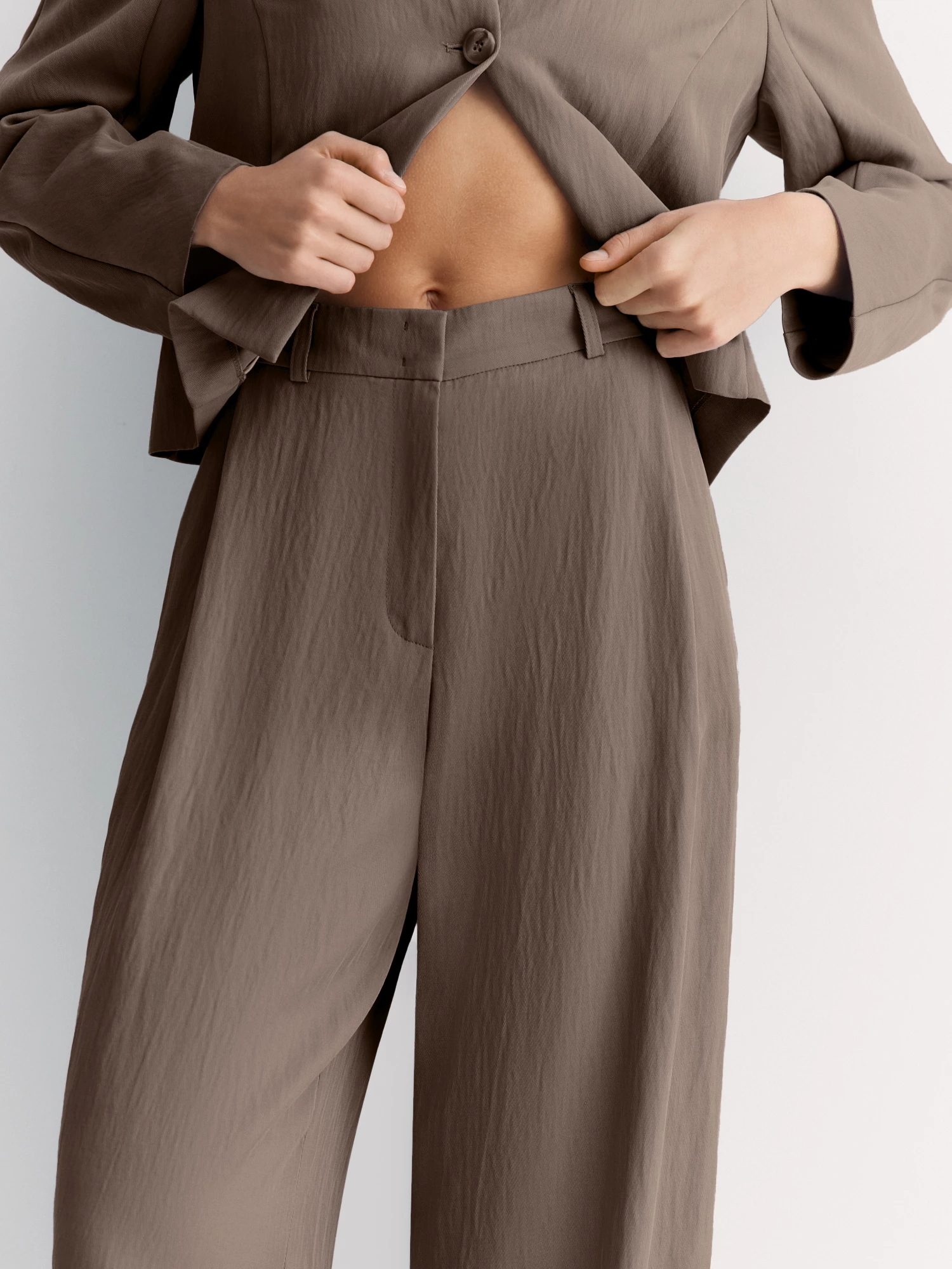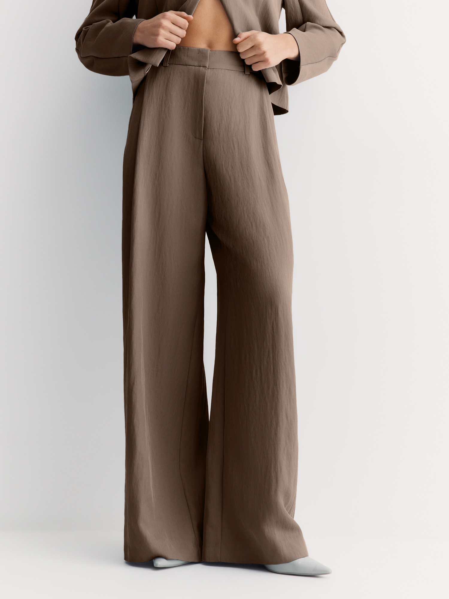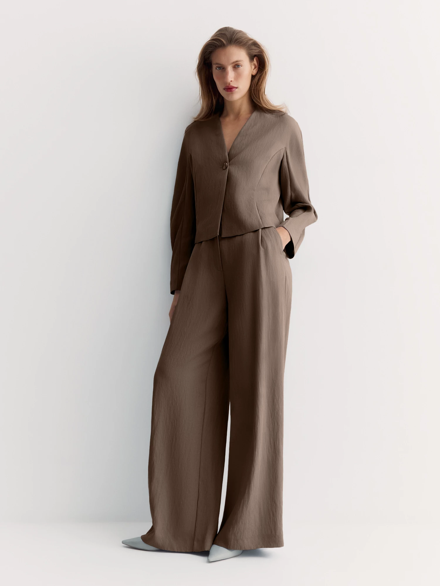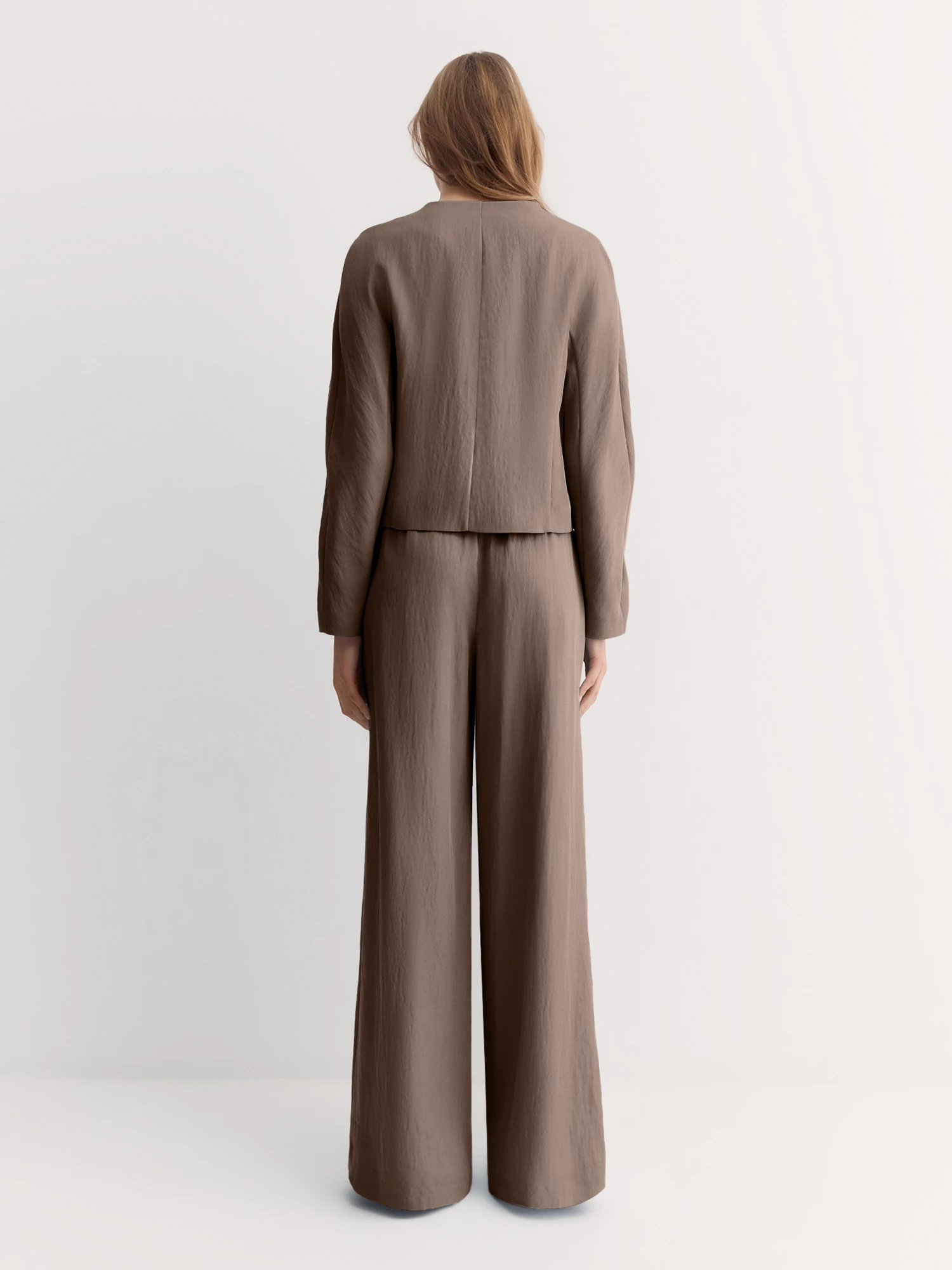 Брюки в благородном коричневом оттенке прекрасно сочетается с жакетом в стиле кимоно JC0198.