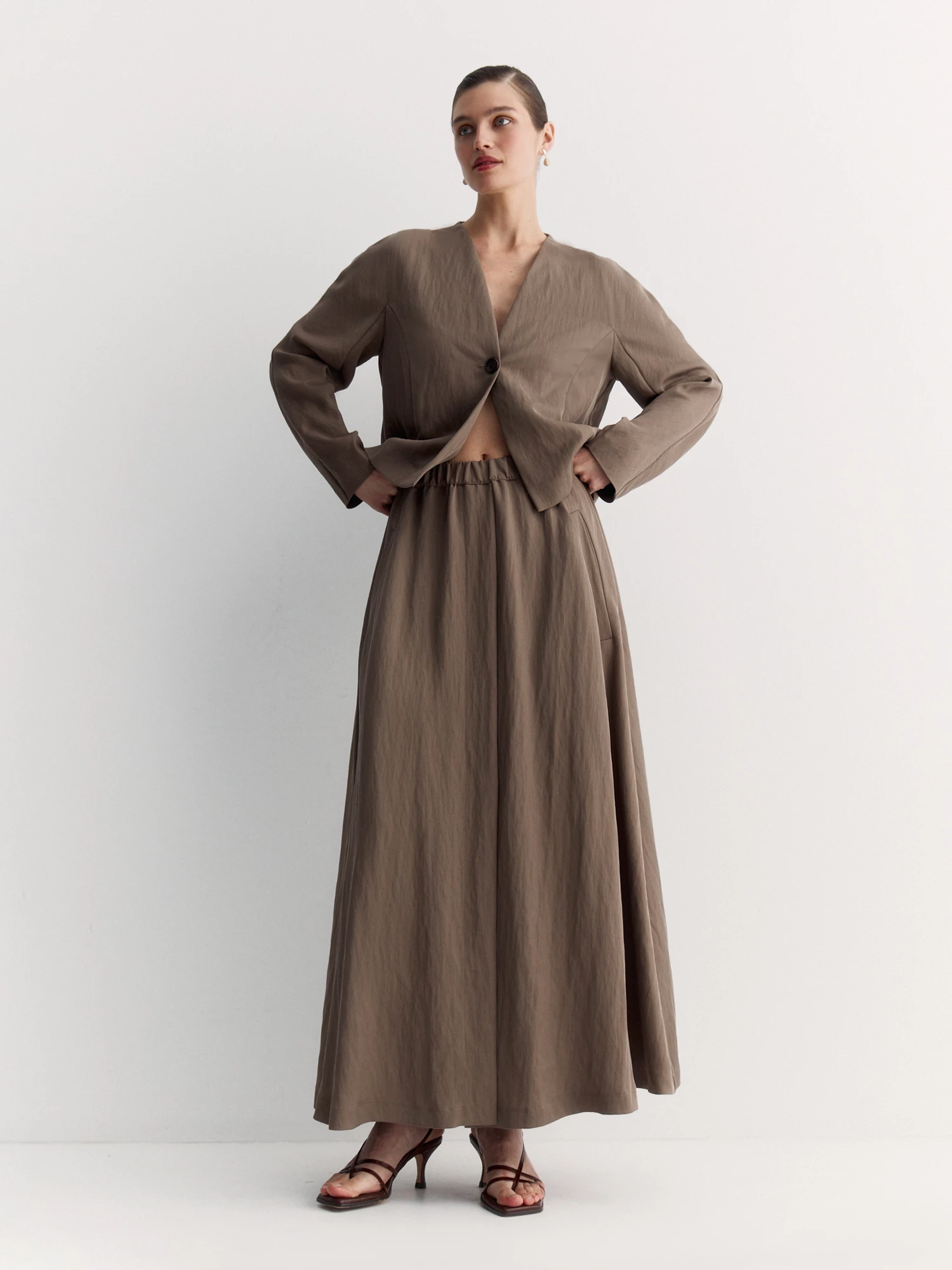 Бренд: ElisЦвет: КоричневыйСостав: Тенсел - 63%, Вискоза - 31%, Нейлон - 6%Артикул: TR0715Размер на модели: 44Коллекция: ЭНЕРГИЯ СВЕТА