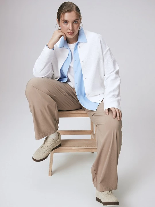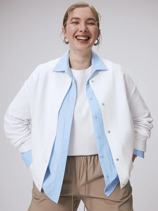 Модель-бестселлер, выполненная из премиальной турецкой ткани с уникальным переплетением интерлок, представляет собой идеальное сочетание стиля и комфорта. Эта ткань обладает привлекательным эффектом крэш, что придаёт изделию интересный визуальный акцент. Благодаря особенностям переплетения интерлок, полотно получается двусторонним, формоустойчивым и прочным, что делает его идеальным для повседневной носки. Хлопок, как известный натуральный материал, гарантирует приятные тактильные ощущения и подходит для людей с чувствительной кожей. Созданный бомбер имеет традиционный подвяз по горловине, который выполнен на японской плосковязальной машине Shima Seiki. Этот подвяз изготовлен из итальянской пряжи на основе модифицированной вискозы, что добавляет изделию дополнительную элегантность и стиль. Удобная застежка на белые кнопки в тон и функциональные карманы с листочками делают модель практичной и стильной. Втачной длинный рукав бомбера имеет комфортную ширину, что позволяет легко сочетать его с джемперами любого объема. Это делает модель универсальной и подходящей для различных стилей и образов. Классический белый цвет бомбера отлично подходит для данной модели, позволяя ей логично дополнить образ в любом стиле и расцветке. Такая куртка станет отличным выбором для создания как повседневных, так и более нарядных образов, добавляя в них нотку свежести и современности.