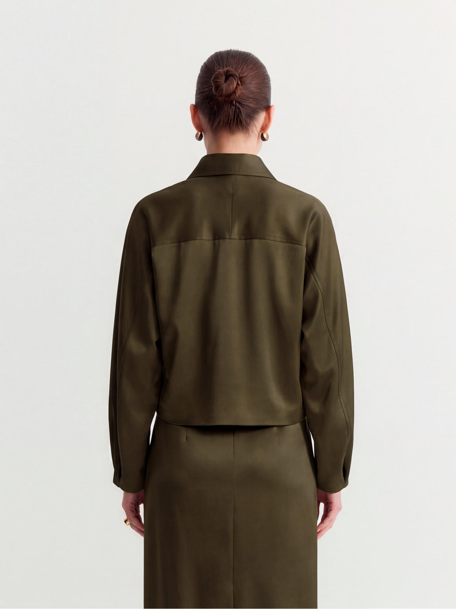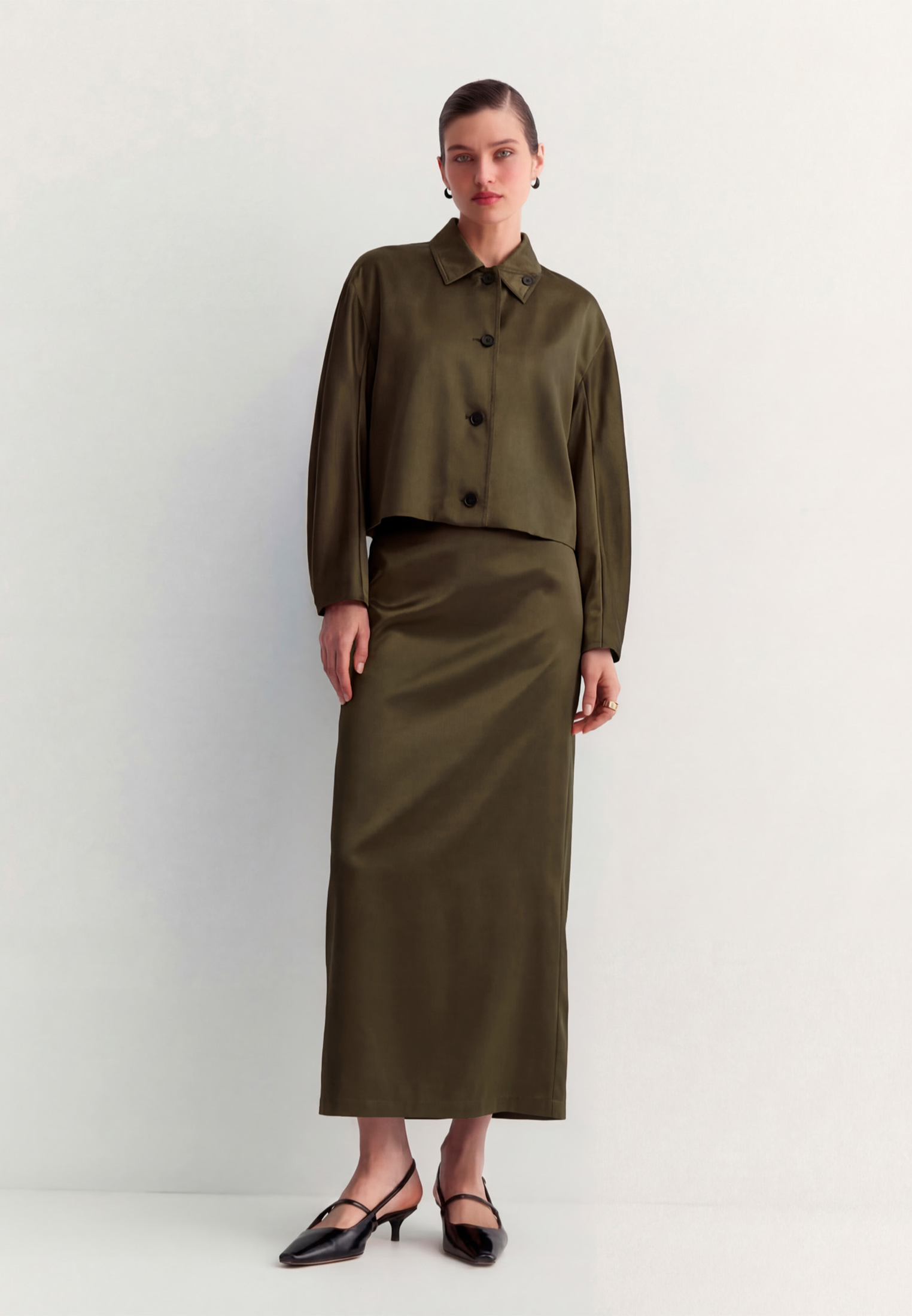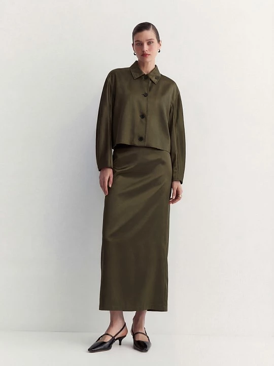 Выполнили пиджак в благородном оливковом оттенке, в дополнение создали юбку SK0630.