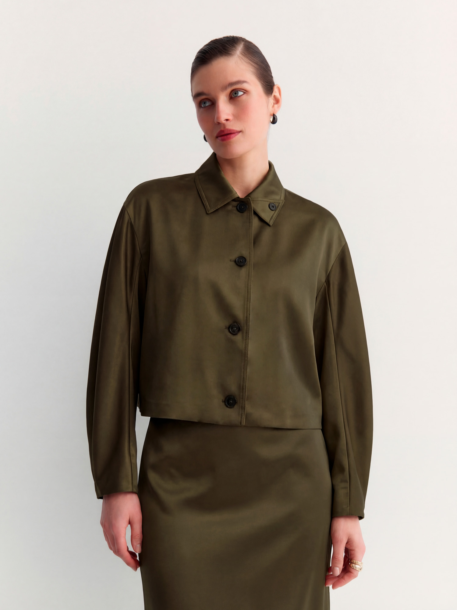 Облегченный укороченный пиджак с атласным блеском – идеальный вариант для стильных образов в тёплое время года. Сшит из лёгкой вискозной ткани с атласным переливом, которая приятна к телу и не добавляет лишнего объёма.