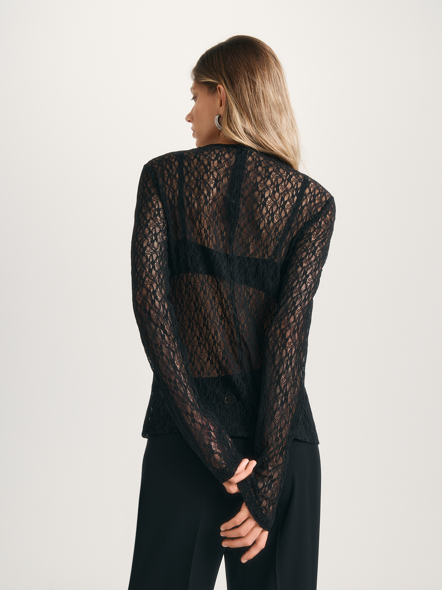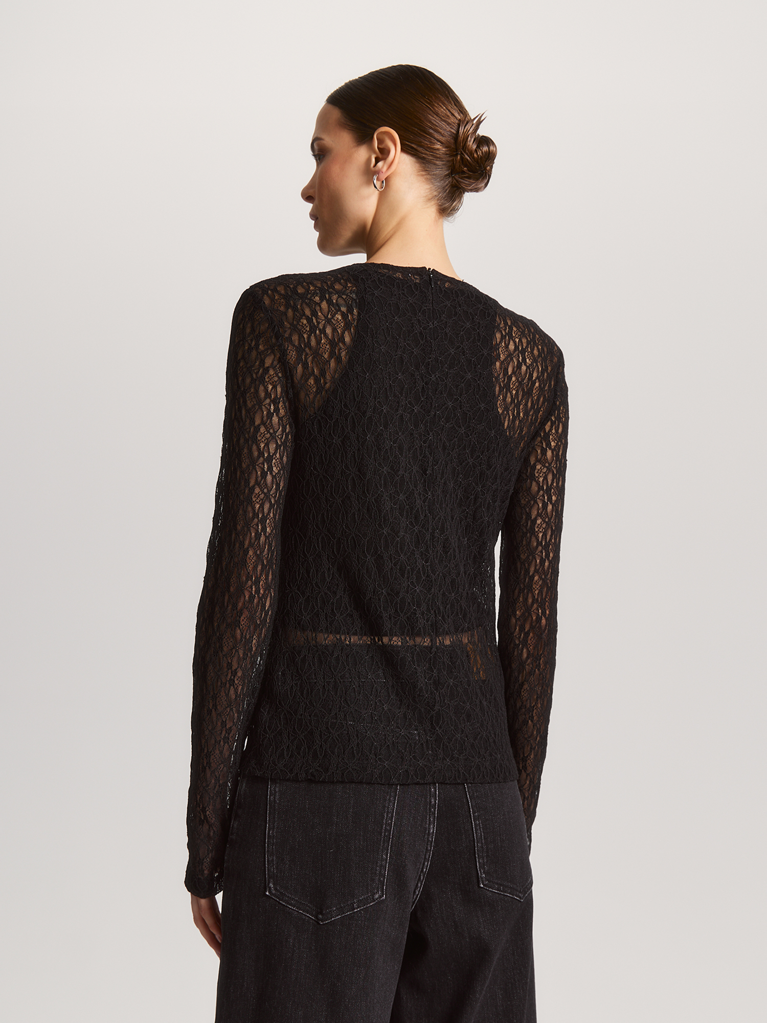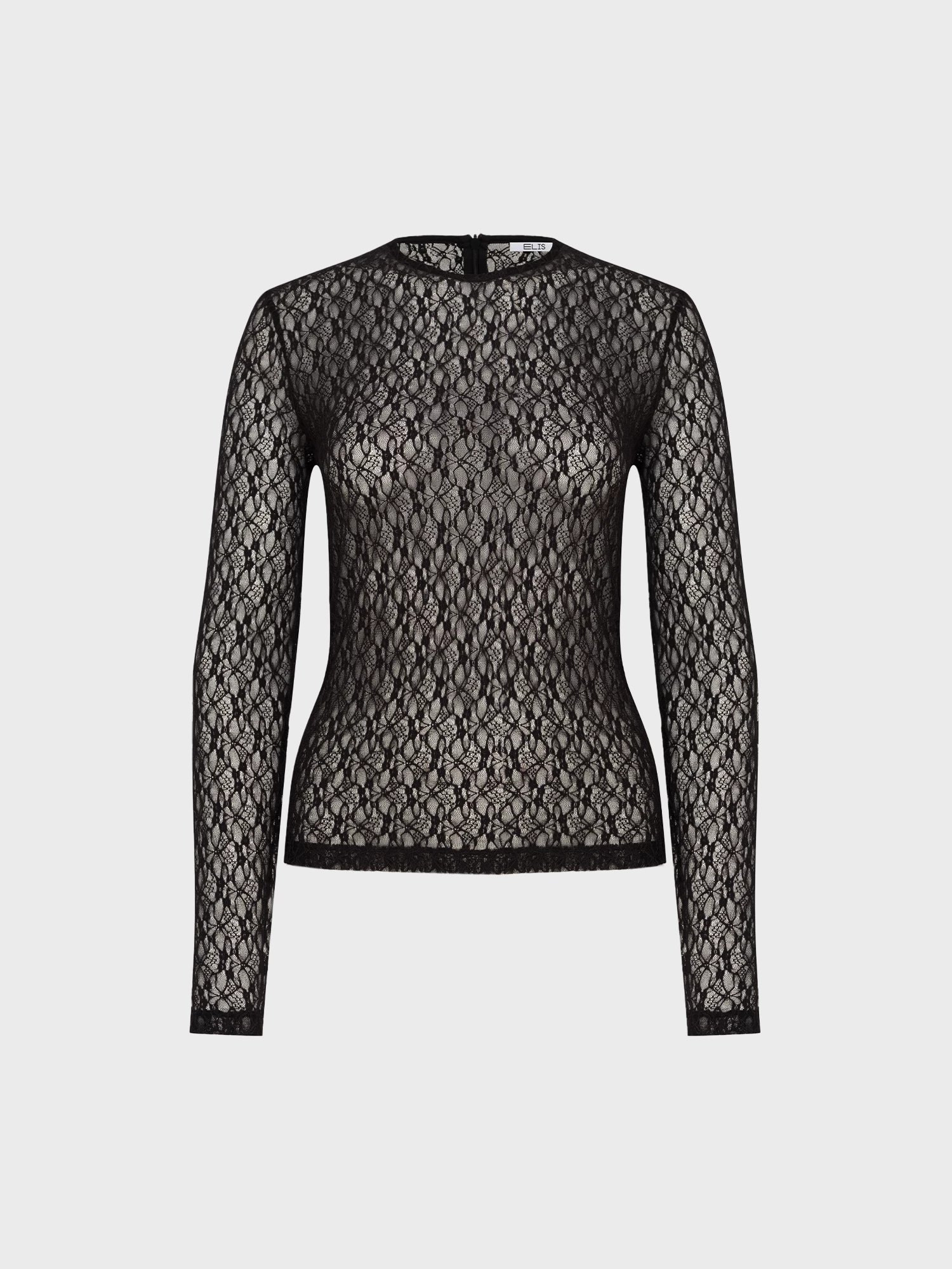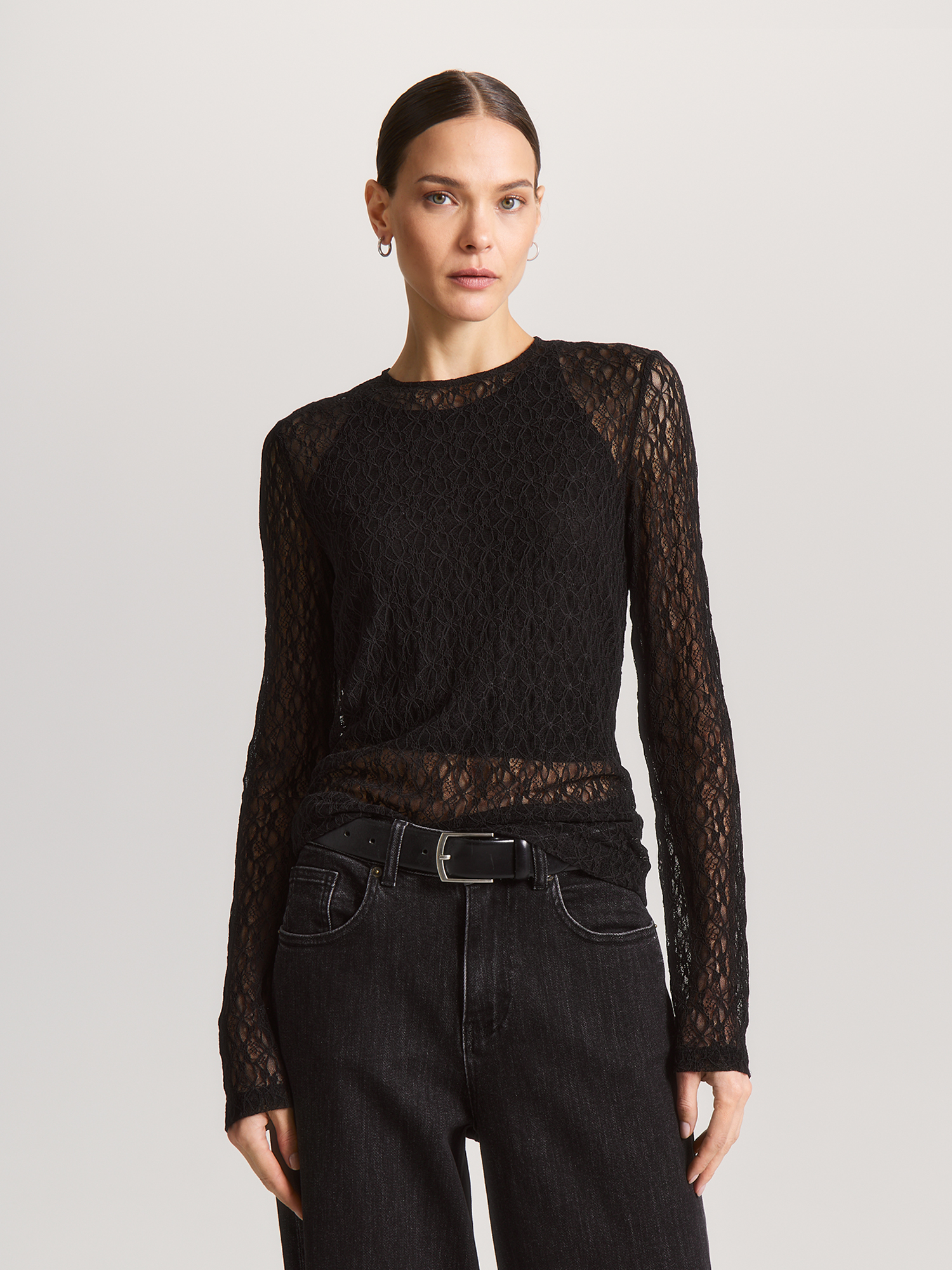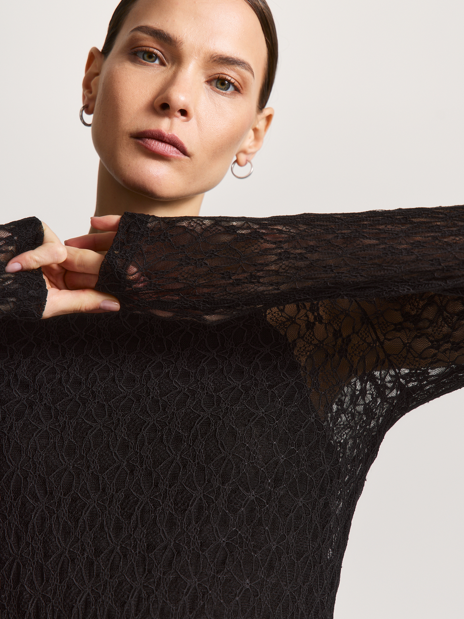Облегающий лонгслив с круглым вырезом и длинными втачными рукавами выполнен из инновационного эластичного кружева. Такое полотно мягко тянется, подчеркивает только достоинства фигуры и сохраняет форму при правильном уходе.