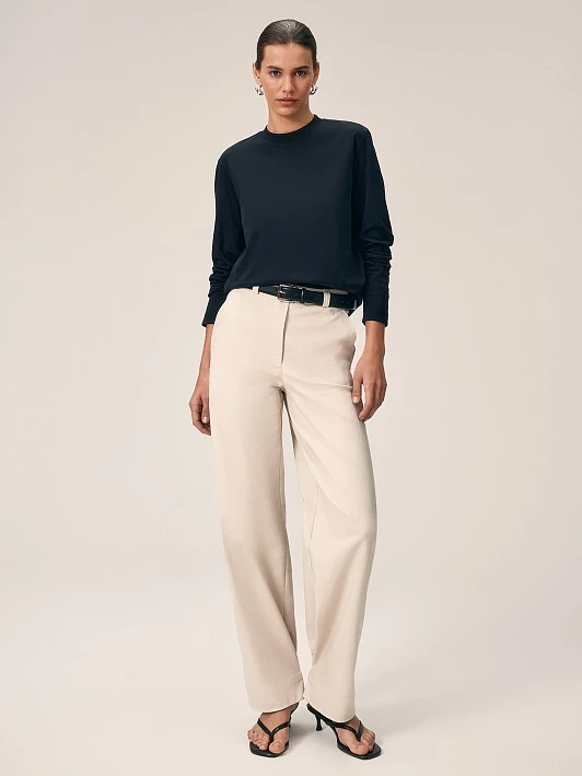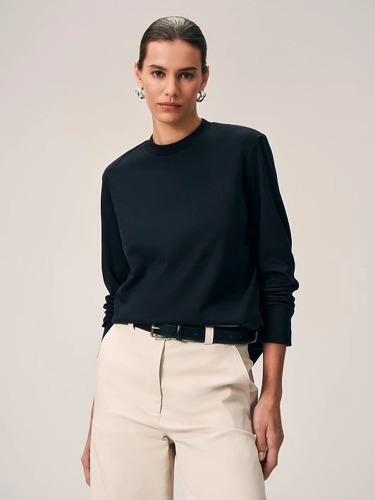 Базовый лонгслив с отрезной полустойкой, длинным рукавом и слегка спущенным плечом. Привлекает внимание брендированная металлическая нашивка. Выбрали для нашей футболки с длинным рукавом и небольшим вырезом качественный дышащий мерсеризованный хлопок, он почти не ощущается на теле. Классический черный универсален в сочетаниях, лонгслив можно носить в офис, школу, на прогулки и встречи с друзьями.