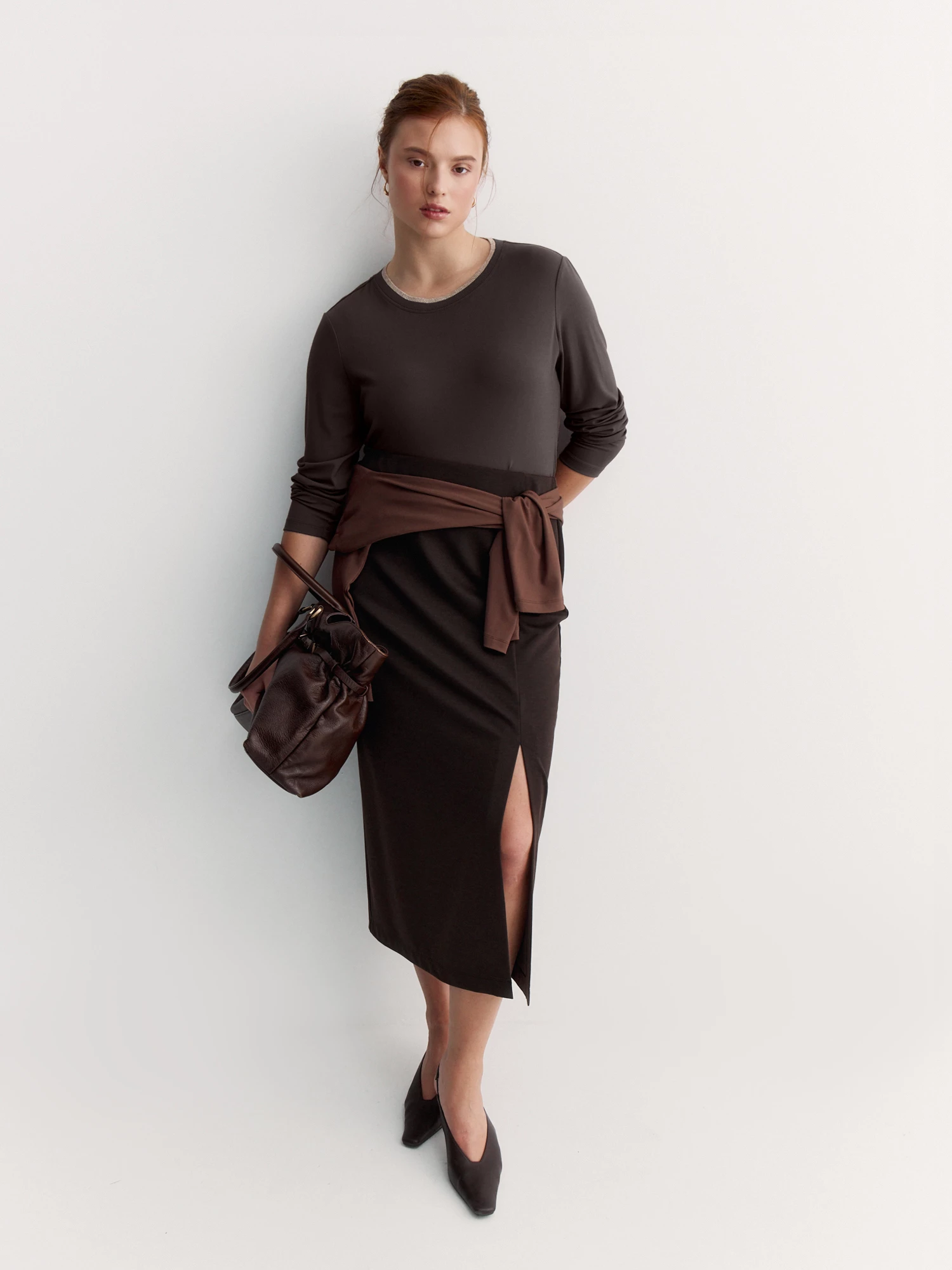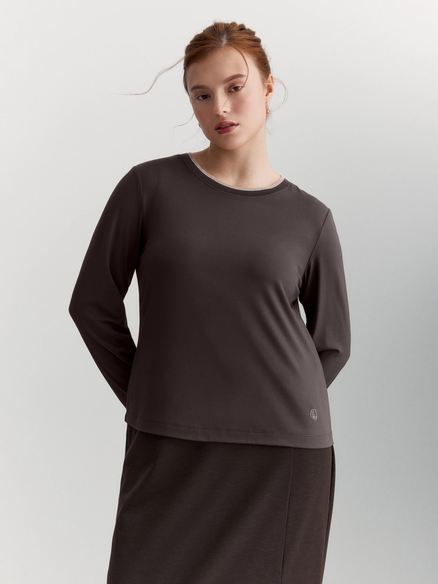 Лонгслив в природном коричневом оттенке – универсальная база для любого образа. Он отлично сочетается с джинсами, брюками из нашей коллекции или под пиджак – будет уместен и в повседневной носке, и в более строгом луке.