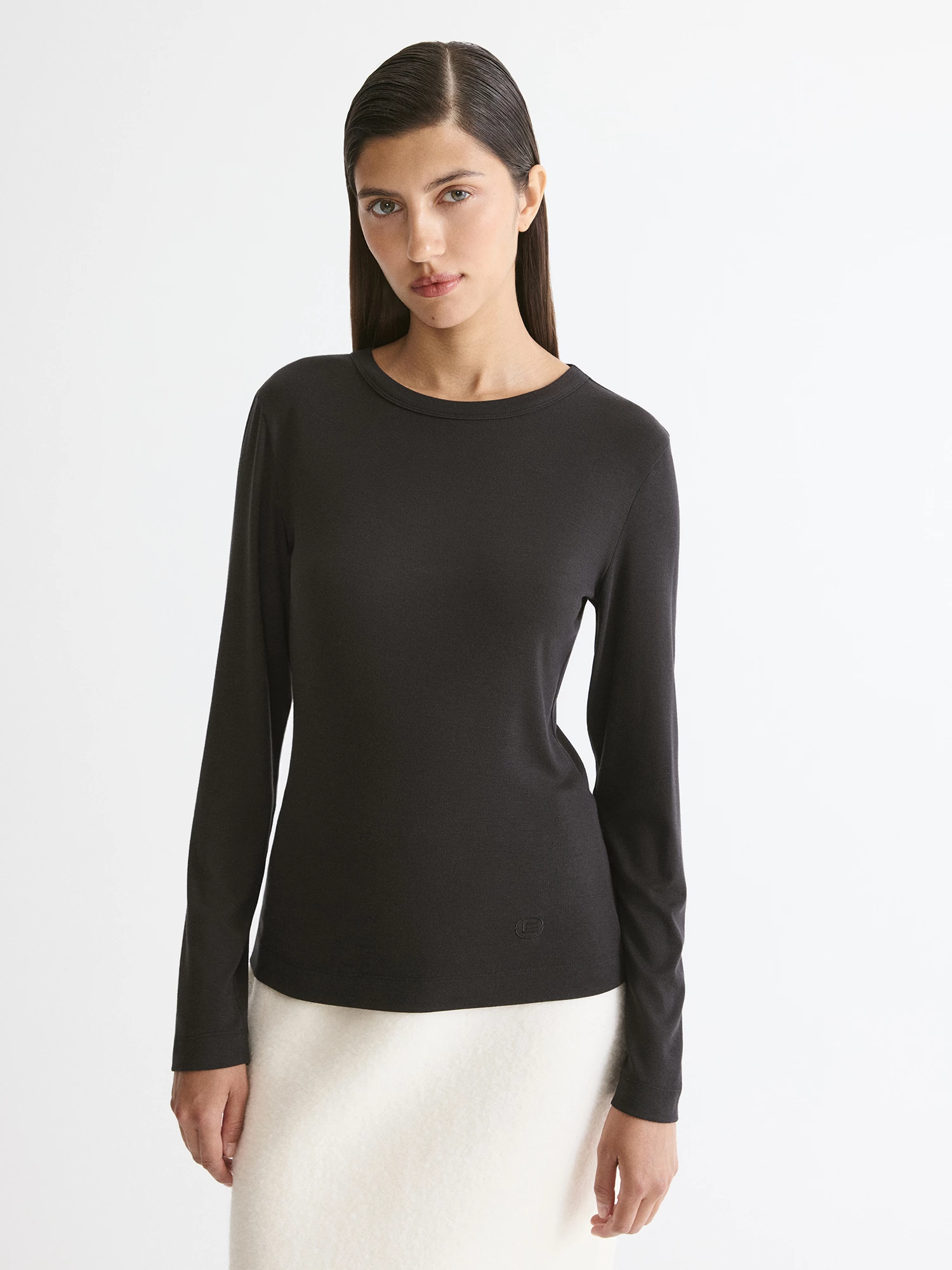 Лонгслив в базовом черном будет прекрасным дополнением к джинсам и брюкам из коллекции, а также под пиджак.