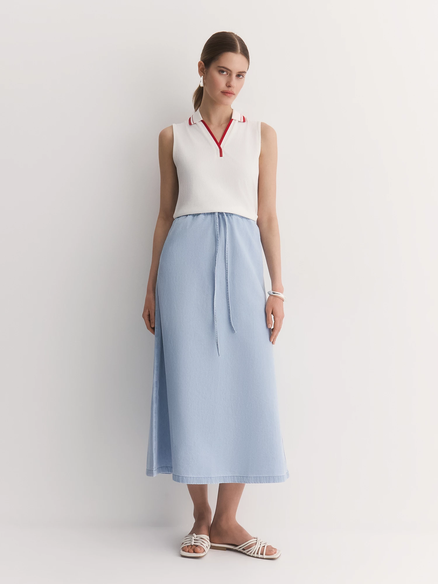 Собетание белого фактурного трикотажа и красного канта делает образ динамичным и свежим.