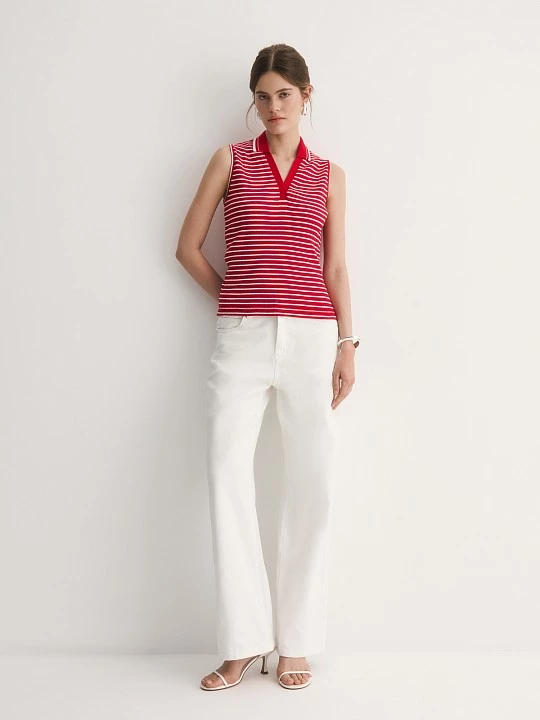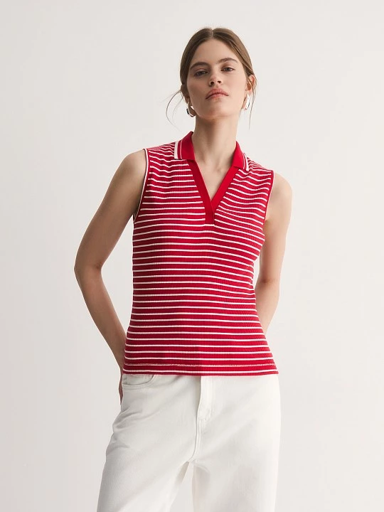Полосатый топ-поло без рукавов – свежая интерпретация классики. Сшитый из фактурного хлопкового трикотажа, он мягкий, дышащий и приятный к телу, обеспечивает комфорт весь день.