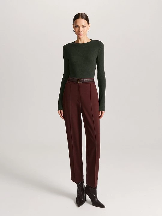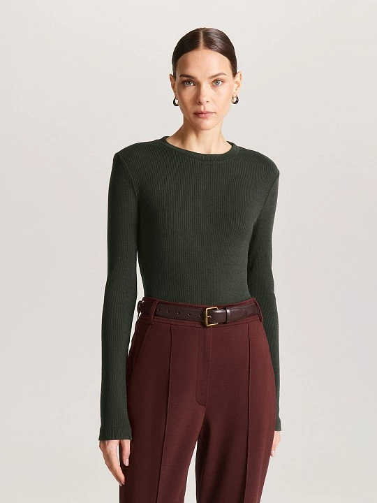 Модель приталенная, с аккуратным круглым вырезом и длинным втачным рукавом. Насыщенный, очень темный оливковый идеально сочетает лонгслив с юбкой SK0569K.