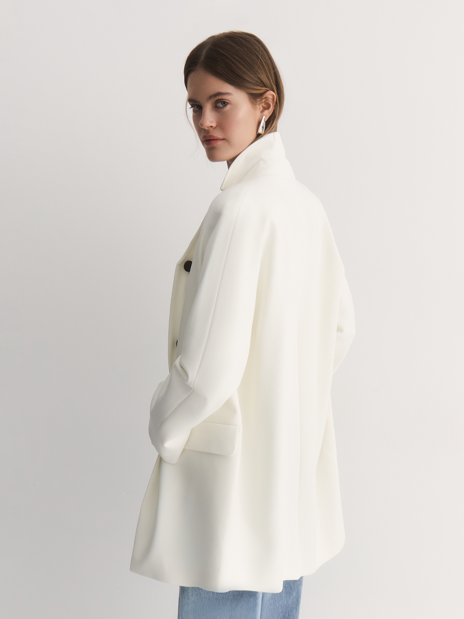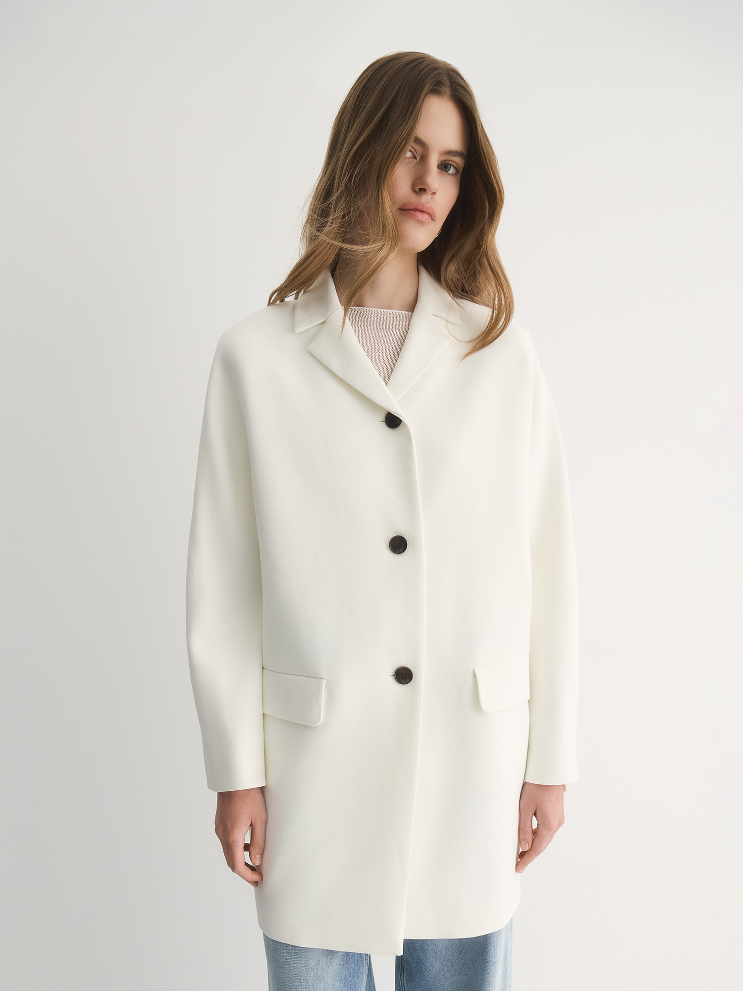 Благодаря лаконичному крою пальто сливочного оттенка, мы получили модель, демонстрирующую комфортную посадку на каждом типе фигуры. Дизайн с застежкой на пуговицы контрастного цвета дополнен небольшим классическим английским воротником и цельнокроеным рукавом. Лишенное вытачек, пальто прекрасно сбалансировано за счет функциональных прорезных карманов с клапанами. Пальто из прочной, долговечной и тактильно приятной вискозной ткани на полной подкладке хорошо держит тепло за счет плотности основной ткани и воздушной прослойки между ней и подкладочным полотном. Такая модель отлично вписывается в весенний гардероб, а благодаря кремово-сливочному оттенку, она подойдет как верхний слой для вечернего выхода.