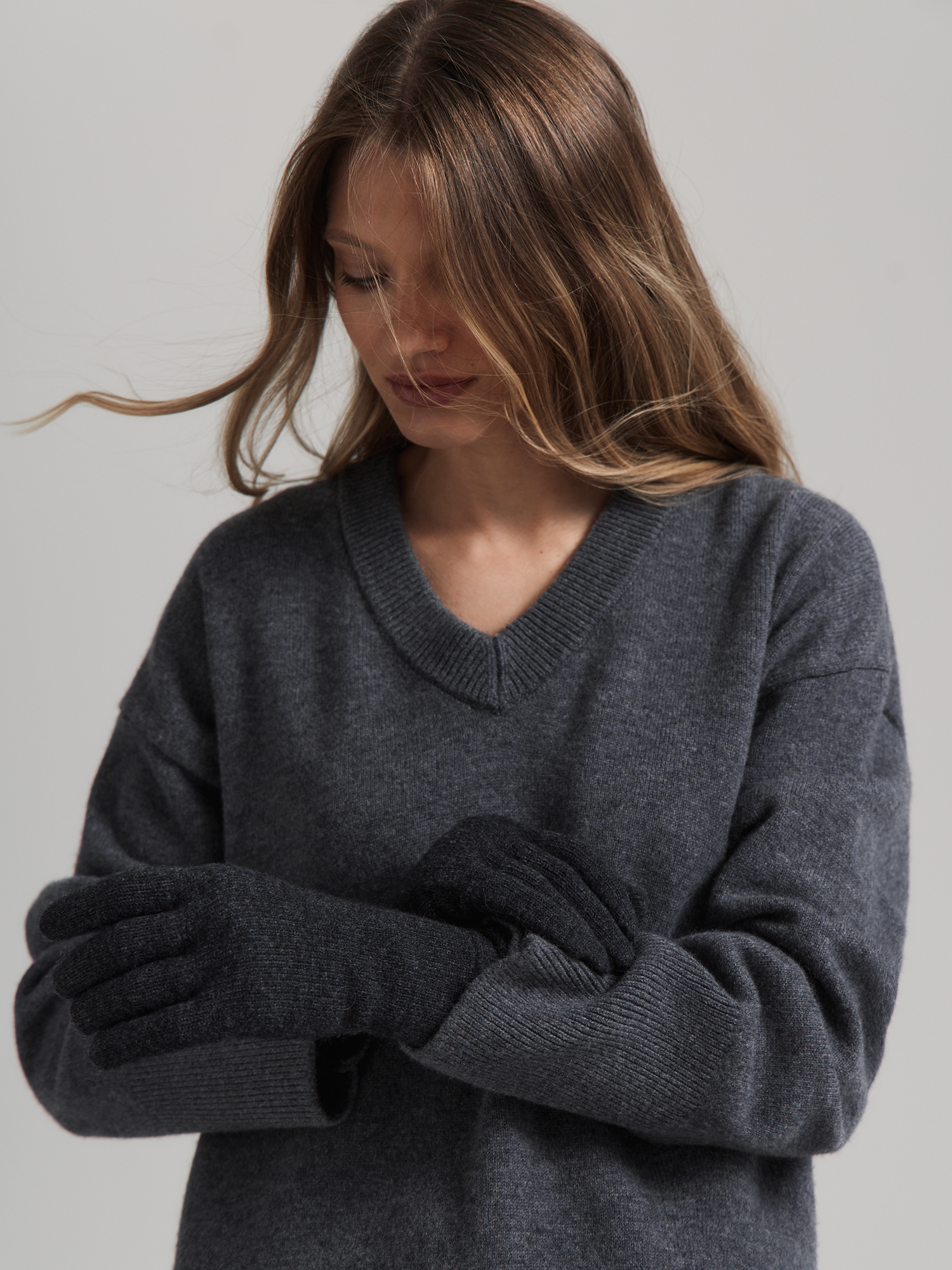 Шерсть мериноса очень прочная, с тонким волосом и невероятно теплая. Такой состав идеально сочетается с осенними и зимними пальто и пуховиками, а функциональный дизайн позволяет дополнять перчатками в серьезном темно-сером разные образы — от спортивных до элегантных.