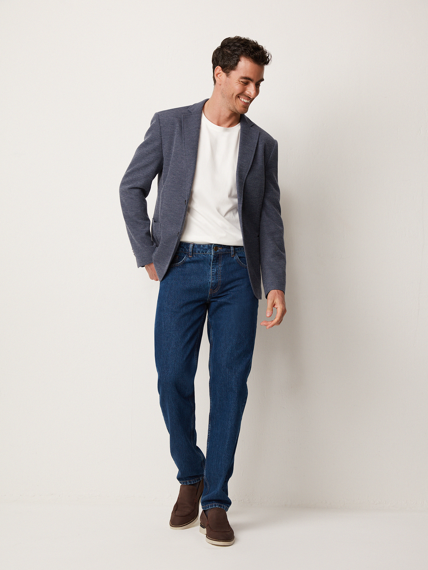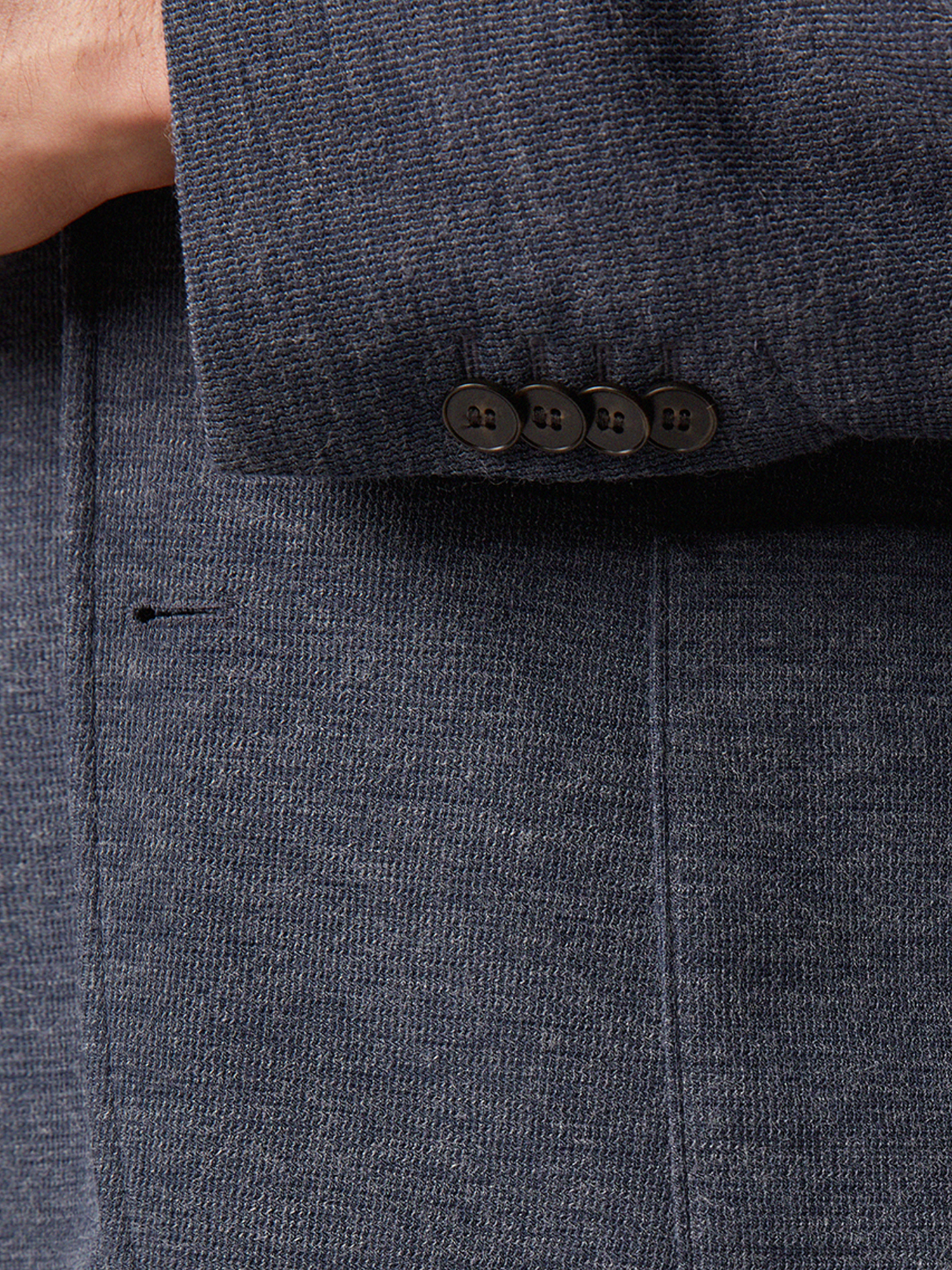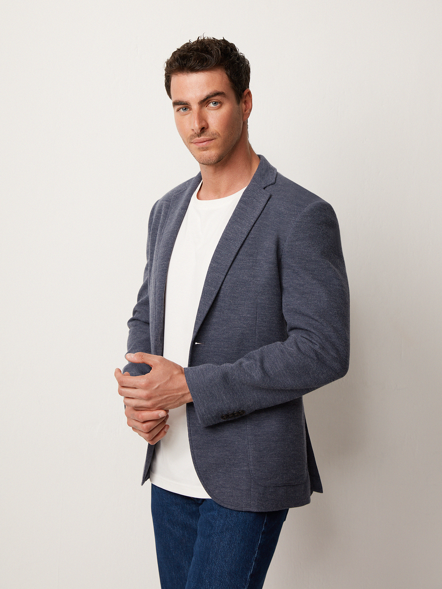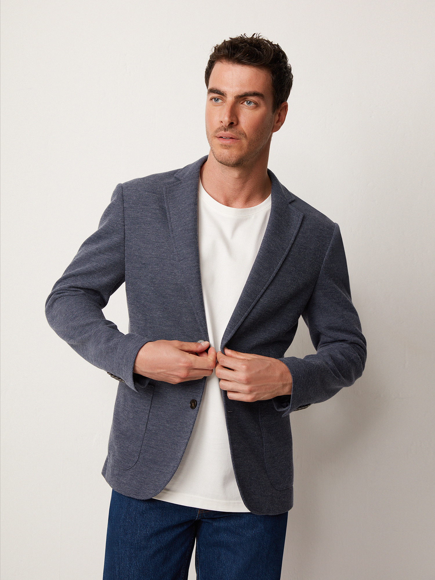 Базовый пиджак универсального синего меланжевого оттенка. Выполнен из плотного комфортного трикотажа. Модель полуприлегающего силуэта, со скруглёнными полами, отложным воротником с лацканами, длинным втачным рукавом, однобортной застёжкой на пуговицы и скруглёнными накладными карманами. Лаконичный пиджак дополнит как деловой образ, так и лук в стиле кэжуал.