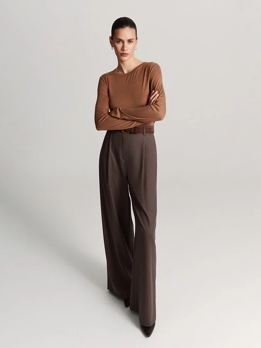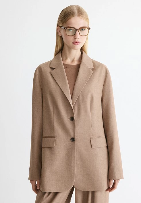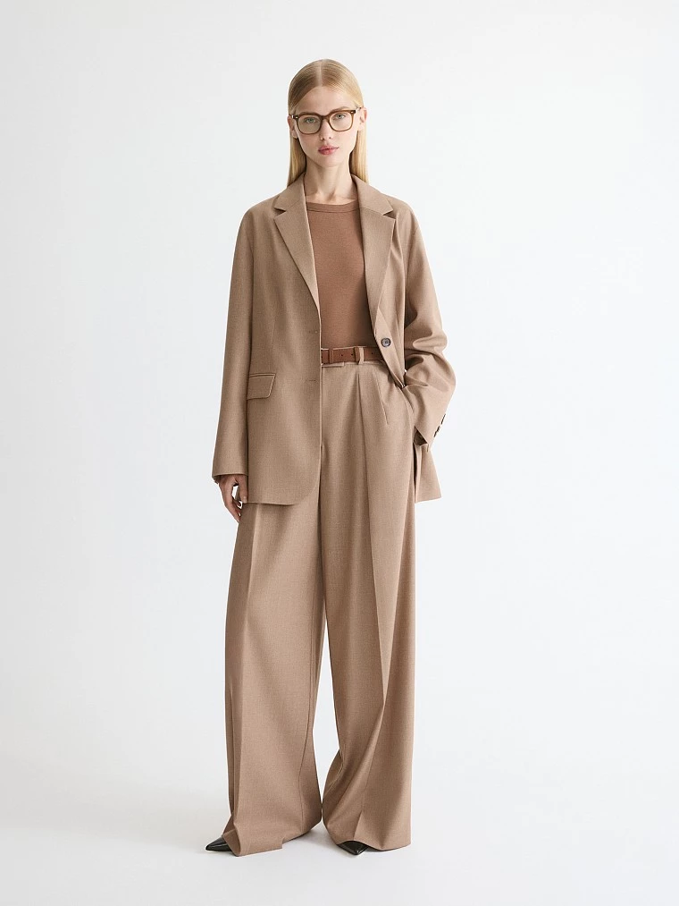 Однобортный пиджак в оттенке кэмел - маст-хэв демисезонного гардероба. Прямой силуэт, достаточная длина и мягкое неформованное плечо создают эффект оверсайз, комфортный и актуальный.