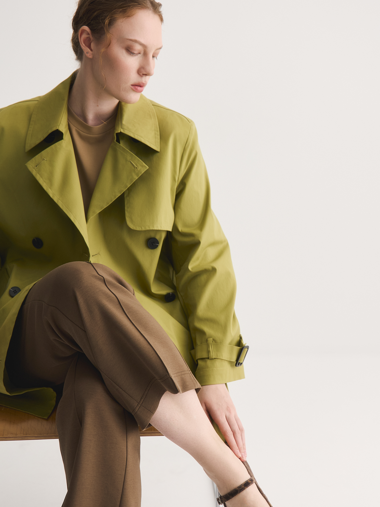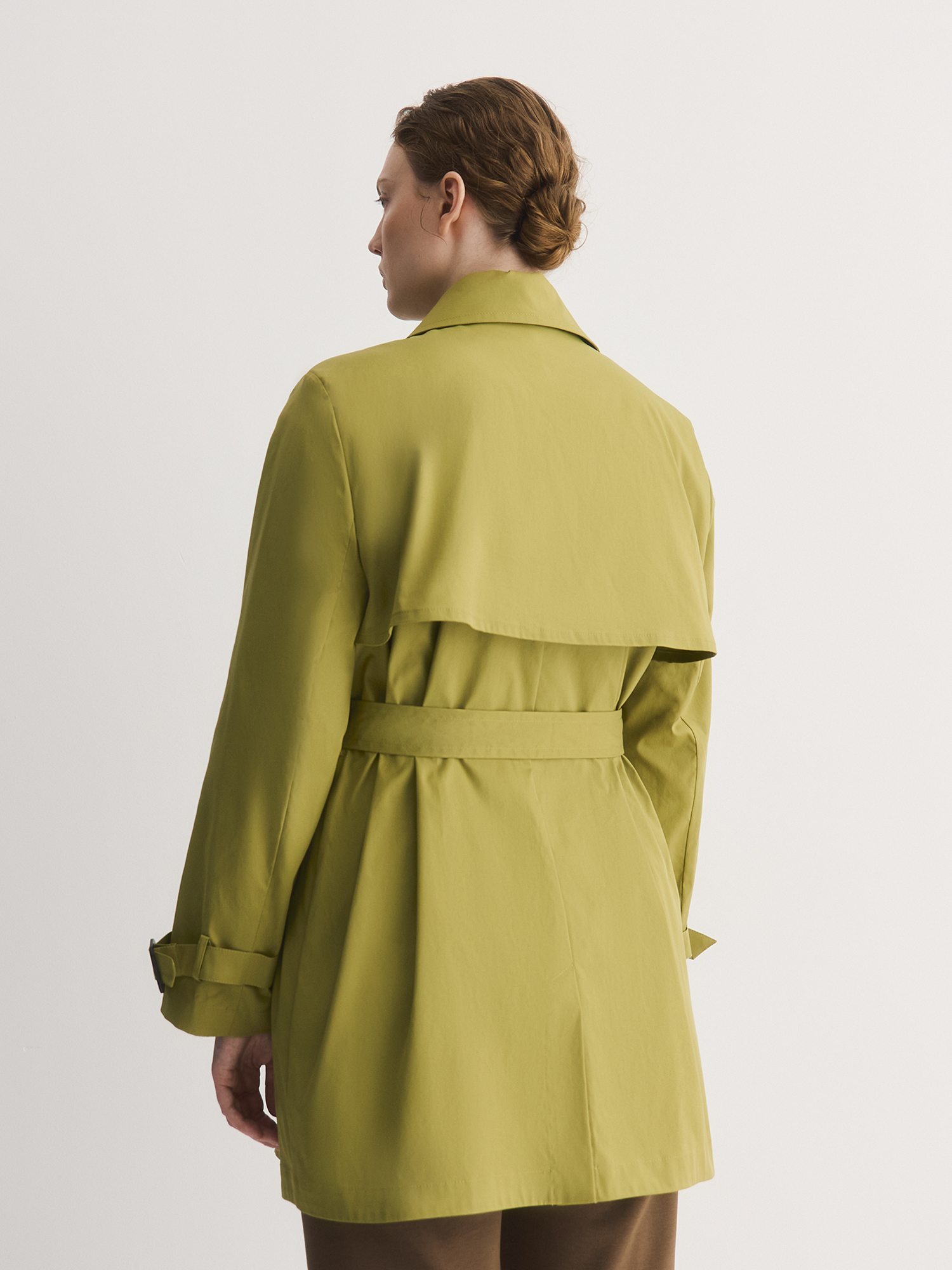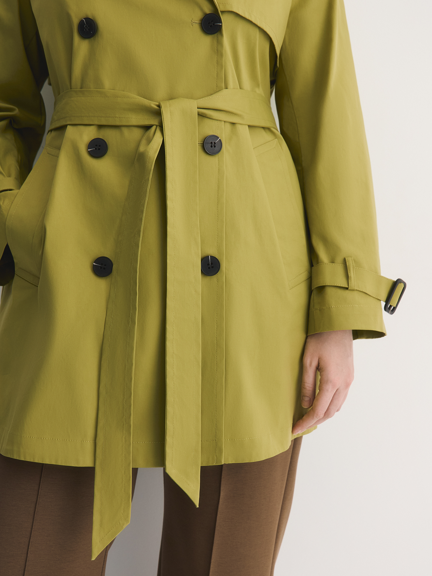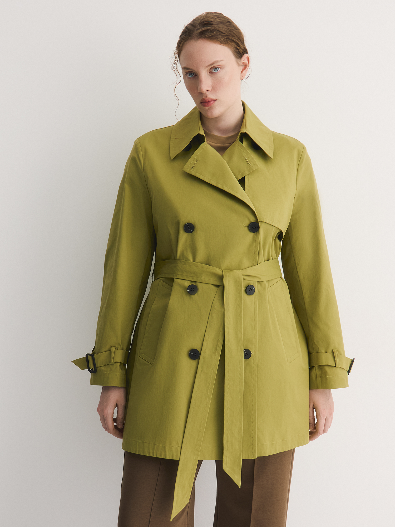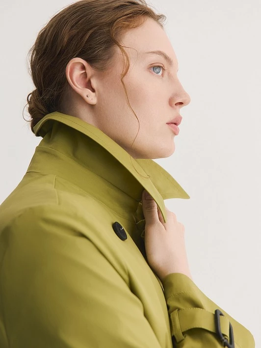 Цвет модели — эффектный оттенок «идеальная груша», привносит в гардероб яркие и живые краски. Насыщенный грушевый тон добавляет свежести и яркости, что делает плащ отличным выбором для демисезонного гардероба.