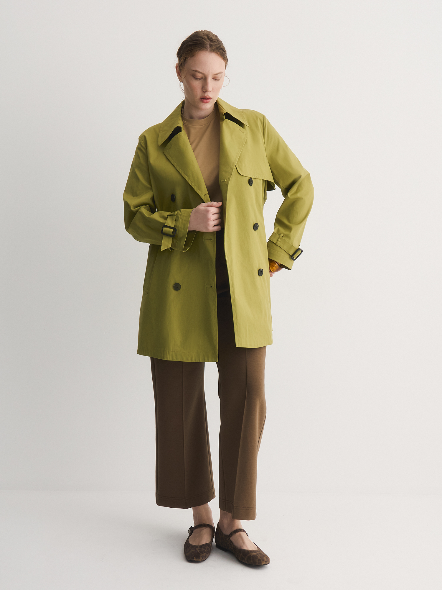 Двубортная укороченная модель плаща выполнена с изысканной застежкой на пуговицы контрастного цвета, что придаёт ей оригинальный акцент и стильный вид. Плотное хлопковое полотно, использованное в производстве плаща, прекрасно держит форму и эффективно защищает от ветра благодаря прочным поливолокнам в составе материала. Это обеспечивает долговечность и надёжность изделия, что является ключевым аспектом качества.