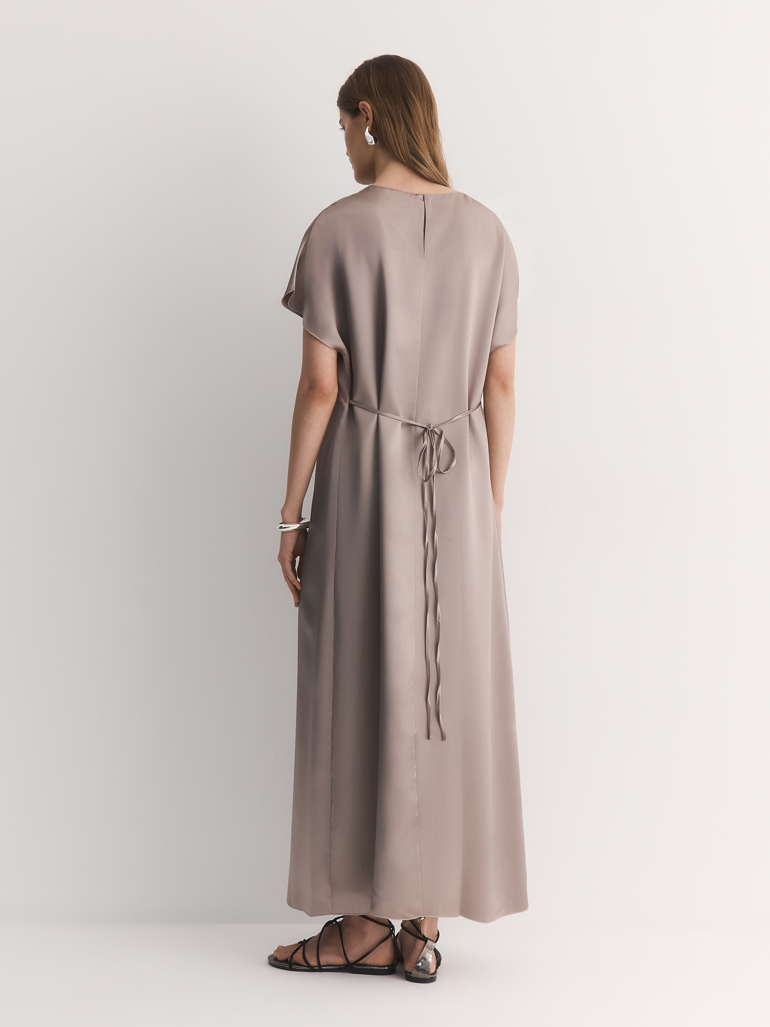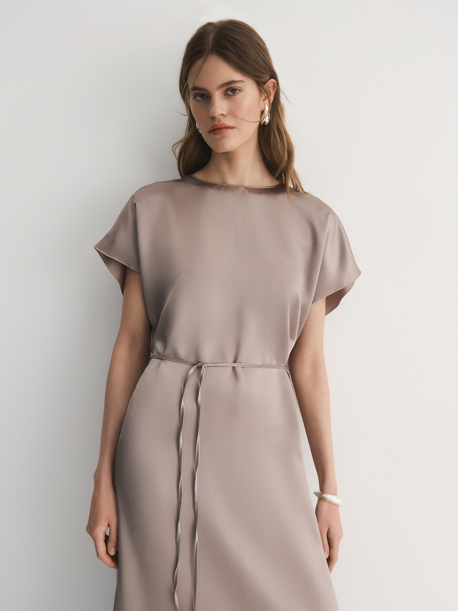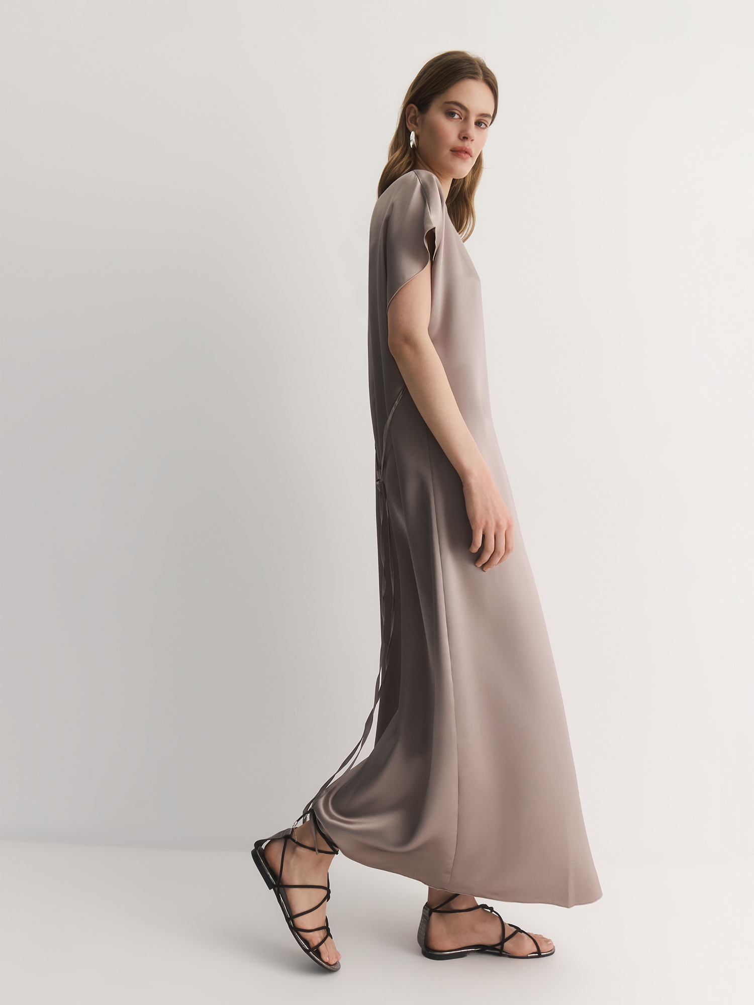 Модель длины миди с круглым вырезом и коротким цельнокроеным рукавом — это идеальное сочетание элегантности и комфорта. Отсутствие вытачек придает платью свободный и непринужденный силуэт, что делает его подходящим для различных случаев, от повседневных прогулок до более формальных мероприятий. Возможность подчеркнуть талию тонким поясом добавляет платью женственности и позволяет создать привлекательный силуэт, акцентируя внимание на фигуре. Застежка сзади на пуговицу из ракушки и воздушную петлю служит деликатным акцентом, придавая модели изысканный вид. Этот элемент не только функционален, но и добавляет нотку утонченности, подчеркивая внимание к деталям в дизайне. Платье изготовлено из 100% ацетата — ткани, которая напоминает натуральный шелк. Ацетат, получаемый из древесной целлюлозы, обладает приятным атласным блеском и легкостью, что делает его идеальным для создания эффектных нарядов. Ткань хорошо драпируется, создавая плавные линии и подчеркивая женственность. Кроме того, ацетат обладает хорошей воздухопроницаемостью, что обеспечивает комфорт в носке в любое время года, позволяя коже дышать. Серый атмосферный — это нежный и универсальный оттенок, который легко комбинируется с различными аксессуарами и предметами гардероба. Платье станет отличным дополнением к любому образу, будь то повседневный стиль с кроссовками или более нарядный вариант с туфлями и изысканными украшениями. Таким образом, модель длины миди с круглым вырезом и коротким цельнокроеным рукавом — это не просто элемент гардероба, а стильный и универсальный предмет, который позволяет создать множество образов.