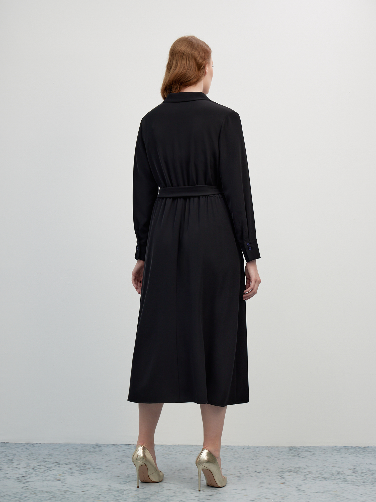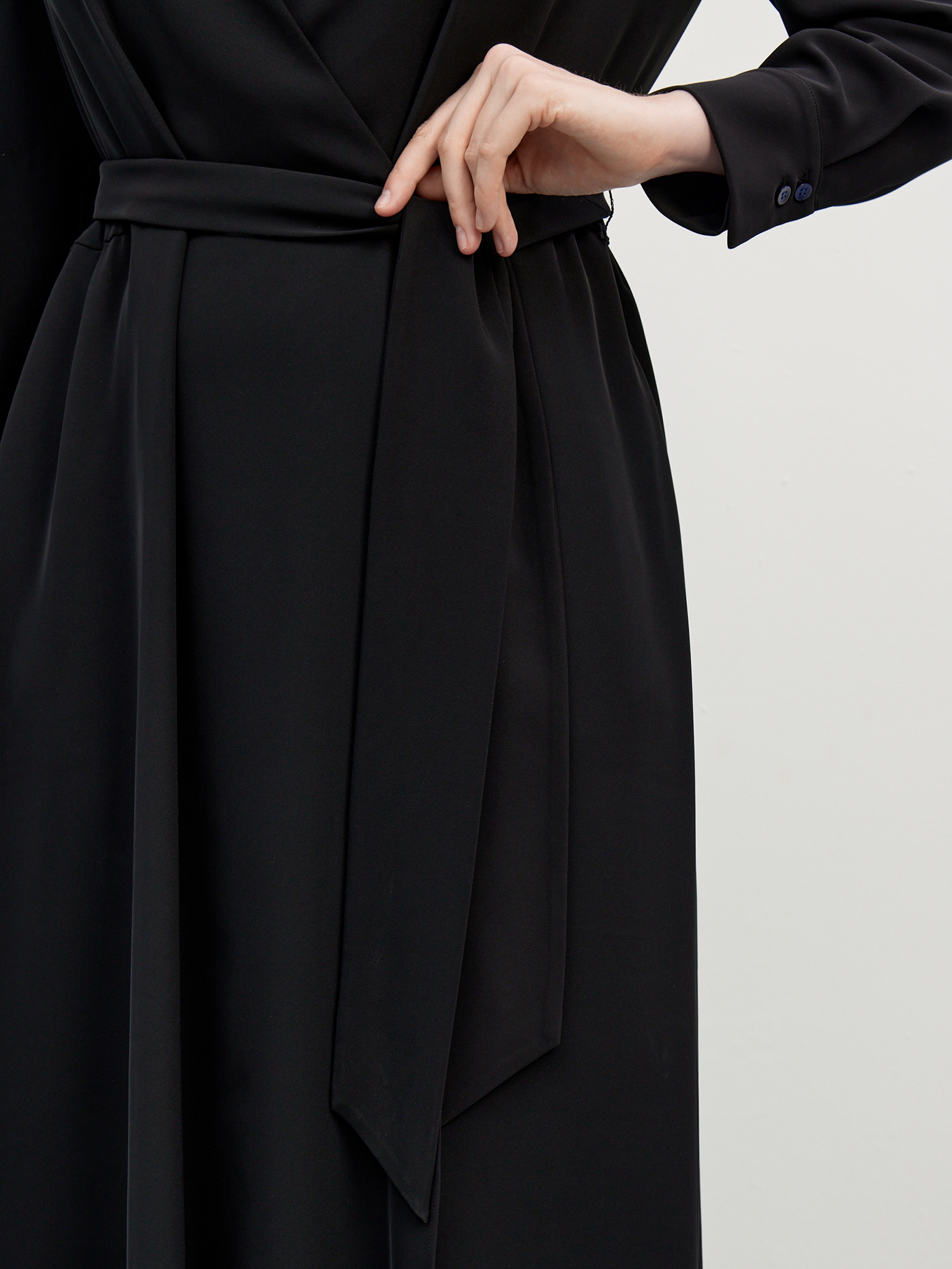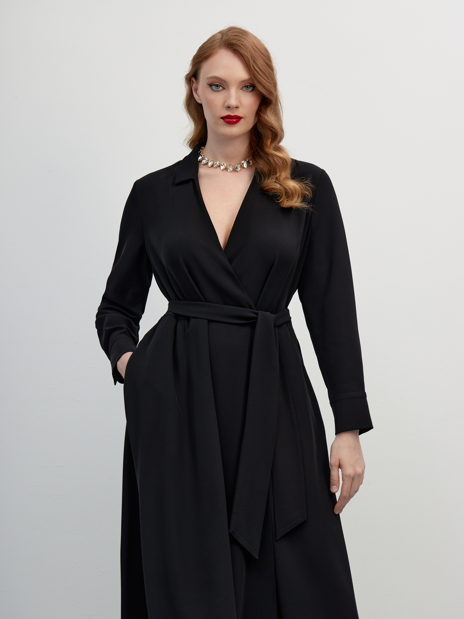 Платье-миди на запах с глубоким V-образным декольте и с широким поясом-лентой, помогающим создать женственный образ и акцентировать внимание на талии. Свободные рукава дополнили складкой у широкой манжеты с аккуратными металлическими пуговицами. Тонкий гладкий текстиль мягко прилегает к телу и не сковывает движений.