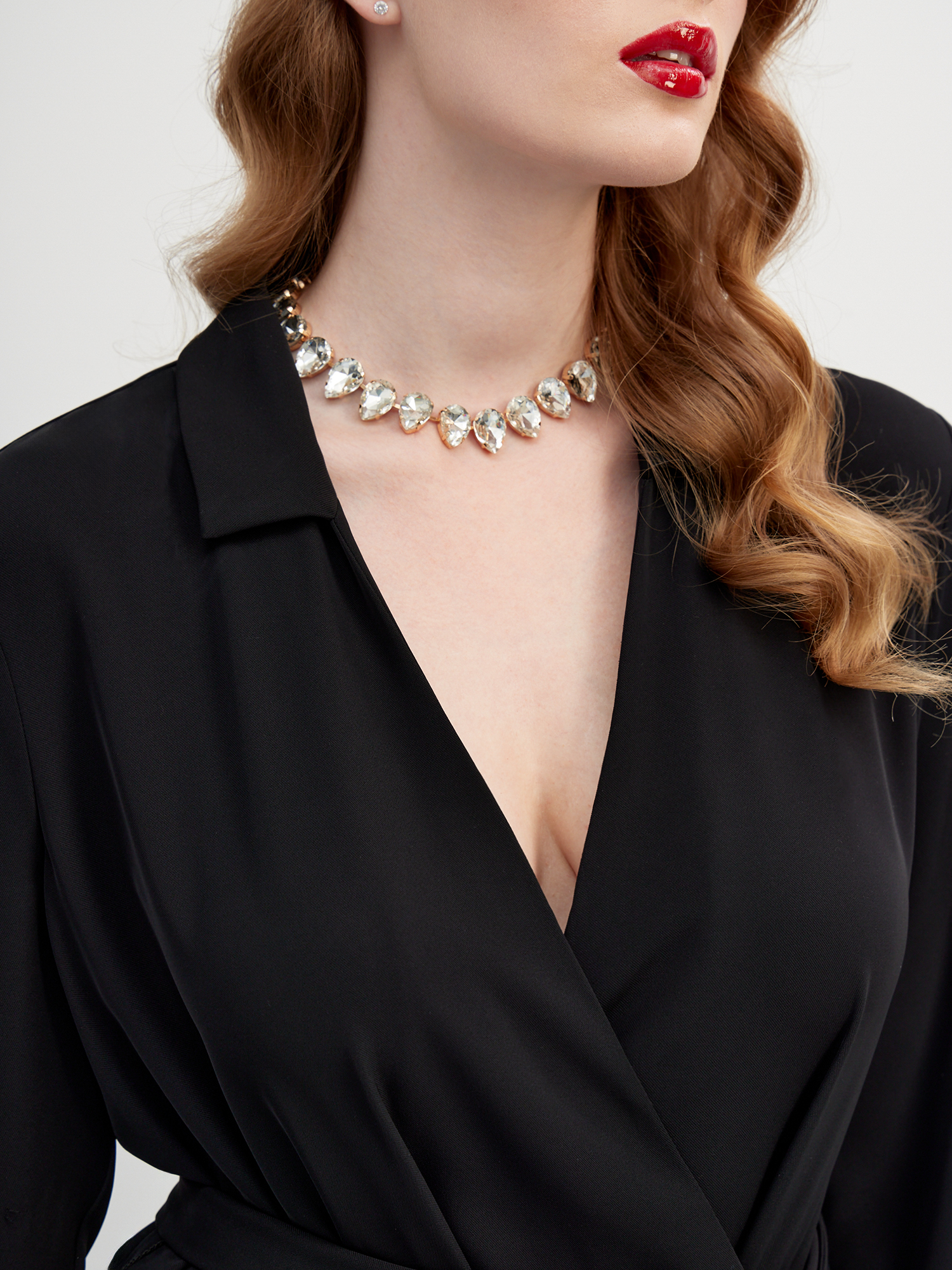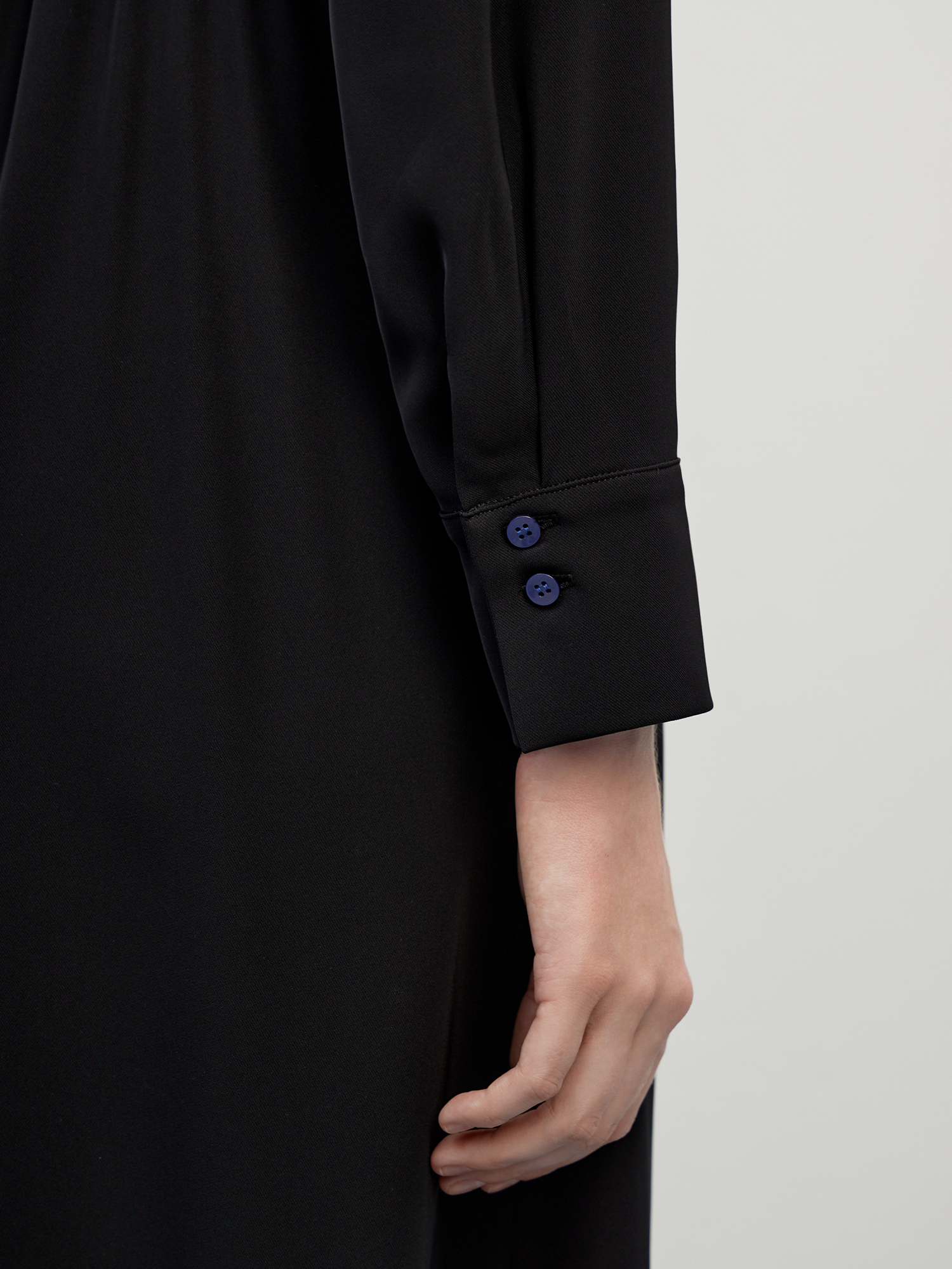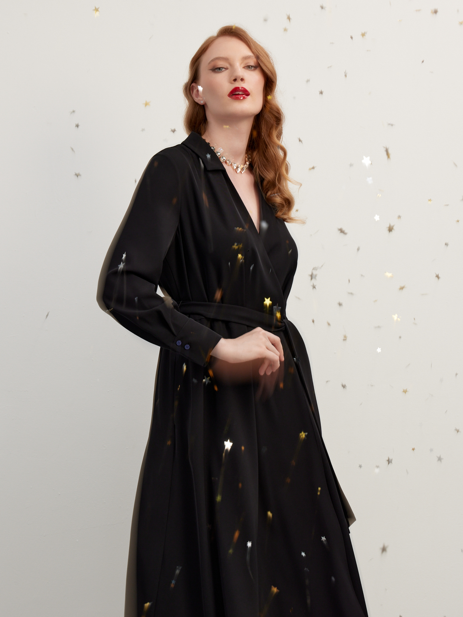 Платье-миди на запах с глубоким V-образным декольте и с широким поясом-лентой, помогающим создать женственный образ и акцентировать внимание на талии. Свободные рукава дополнили складкой у широкой манжеты с аккуратными металлическими пуговицами. Тонкий гладкий текстиль мягко прилегает к телу и не сковывает движений.