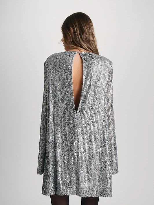 Платье с пайетками - отличный вариант для выхода в свет коктейльного уровня. Модель с небольшим вырезом на спине и глубоким вертикальным на спине. Рукав длинный, втачной, расклешенный книзу, в поддержку общего силуэта платья. Поскольку основная ткань сетчатая, модель выполнена полностью на светлой подкладке, исключение - рукава, их оставили без подкладки, таким образом добавив изделию легкости. Пайеточное полотно, выбранное для платья, представляет собой трикотажную сетку из высокотехнологичного полиэстера со спандексом, расшитую пайетками. Такая сетка эластична, проста в эксплуатации (нужна лишь ручная стирка, утюжка не требуется) и долговечна. Платье в акцентном серебристом хорошо дополнит гардероб и будет востребовано как вечернее, нарядное, новогоднее. Если добавить в образ короткий жакет, пиджак, кардиган, свитер - можно отправиться в офис или на прогулку. Кроме того, такое платье можно носить как тунику.