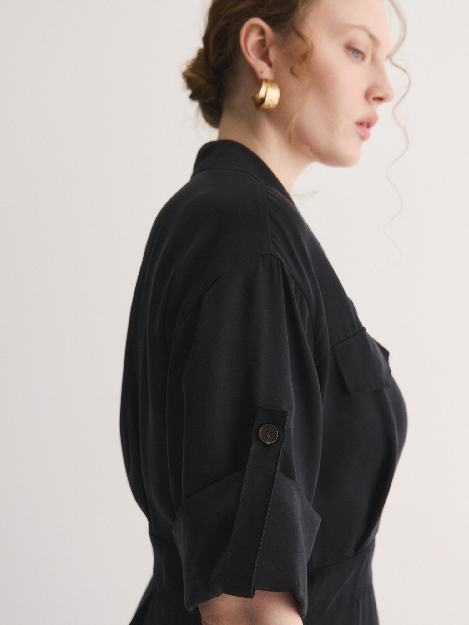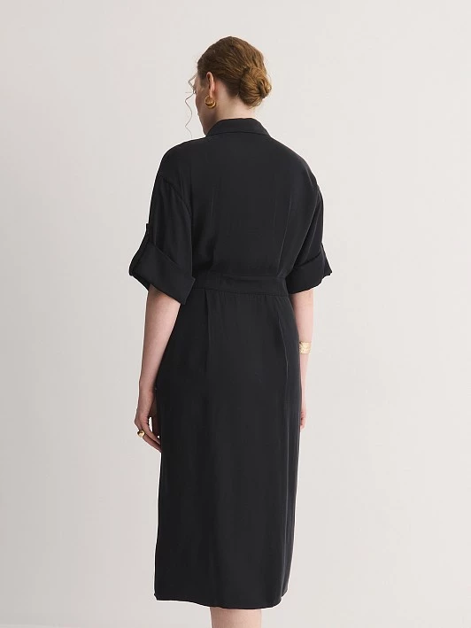 Платье длины миди, выполненное из шелковистого тенсела, представляет собой идеальное сочетание стиля и комфорта. Этот материал практически не ощущается на теле, что обеспечивает максимальный комфорт в течение всего дня.