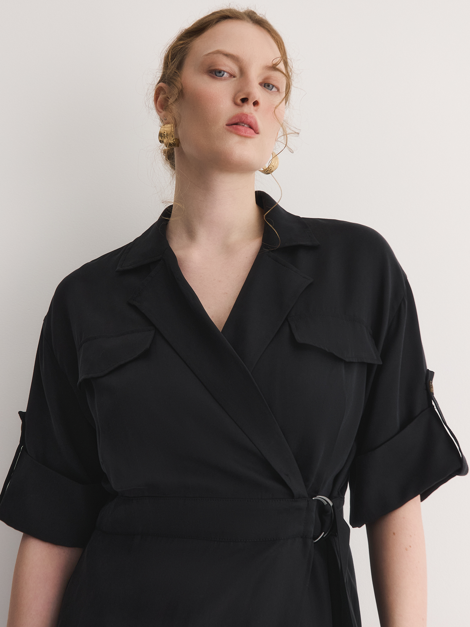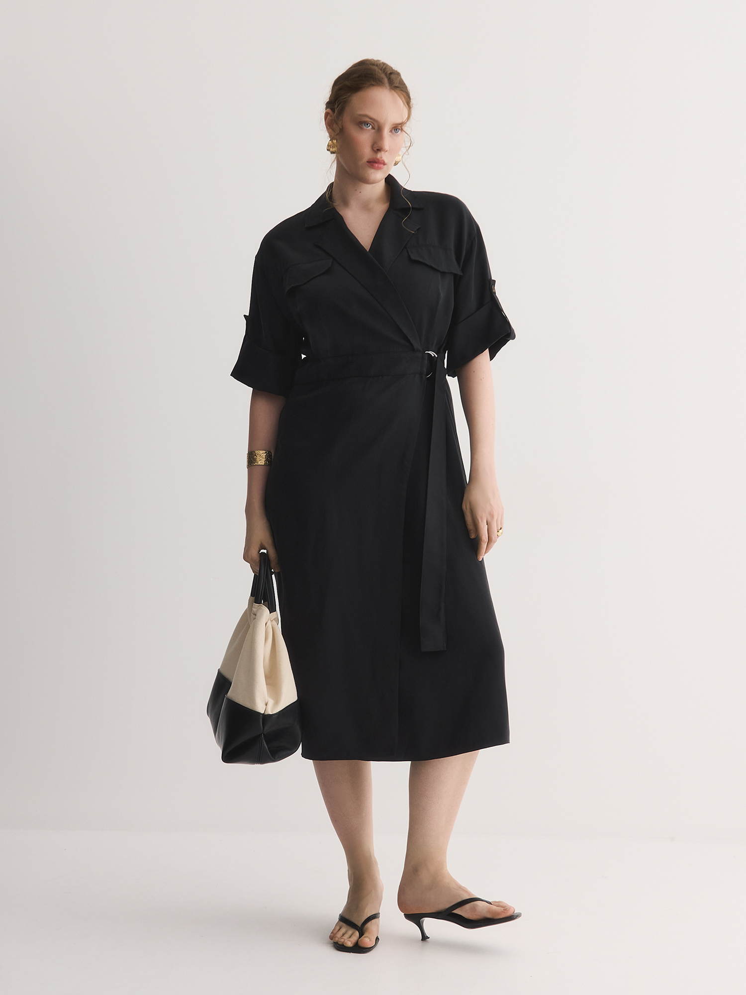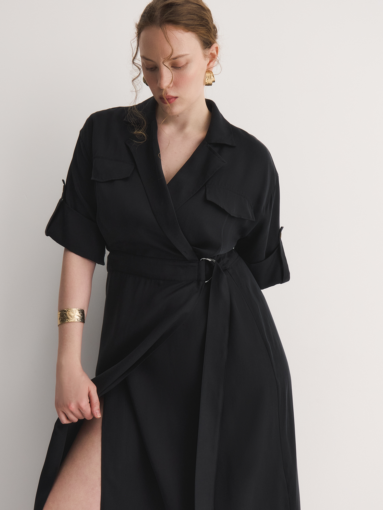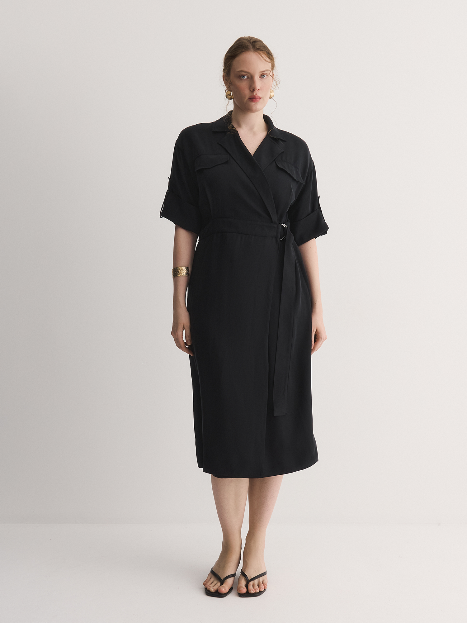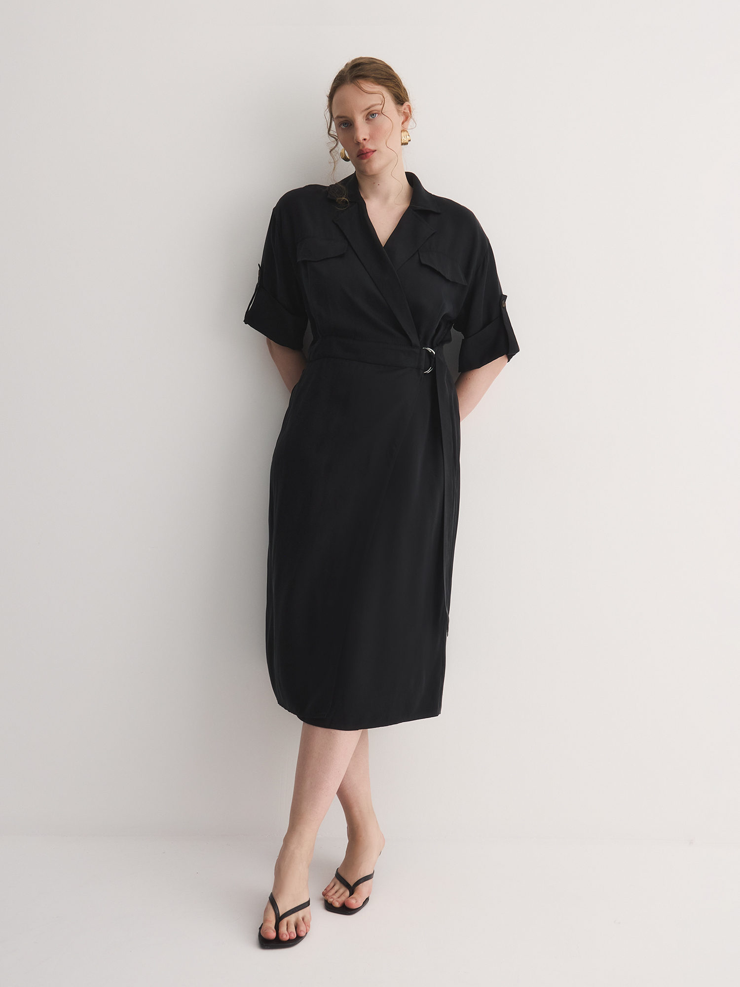 Приталенный силуэт платья с поясом подчеркивает фигуру, создавая элегантный и женственный образ, он акцентирует талию, добавляя изысканности и утонченности. ЗапАх, который стал одной из ключевых особенностей дизайна, отражает стремление современных дизайнеров к асимметрии, что делает платье актуальным в этом сезоне. Такой элемент не только привлекает внимание, но и добавляет динамичности в общий образ. Имитация косых карманов с клапанами придает модели стильный и практичный вид, позволяя отнести платье к повседневному стилю. Это делает его универсальным выбором для различных случаев — от офисных встреч до ежедневных выходов. Паты на рукавах являются функциональным элементом, позволяющим регулировать длину рукава, что добавляет дополнительную гибкость в стилизации.