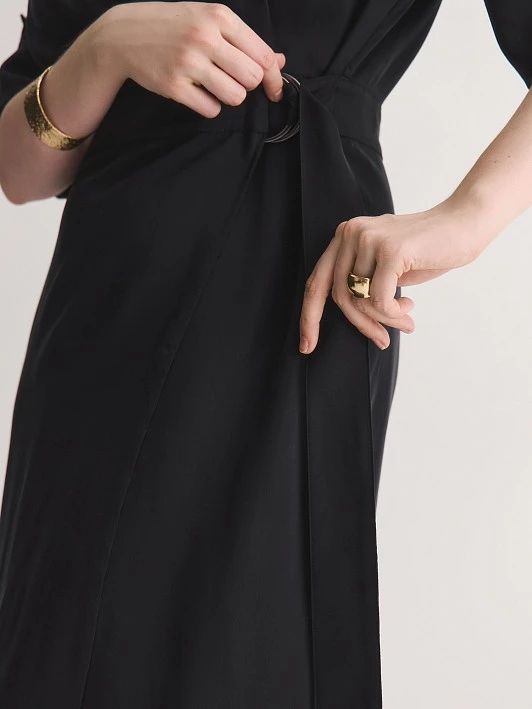 Цвет платья — таинственный черный, который притягивает внимание и создает эффектный контраст с любыми аксессуарами. Черный цвет символизирует элегантность и утонченность, а также легко комбинируется с другими оттенками, что позволяет создавать разнообразные образы.