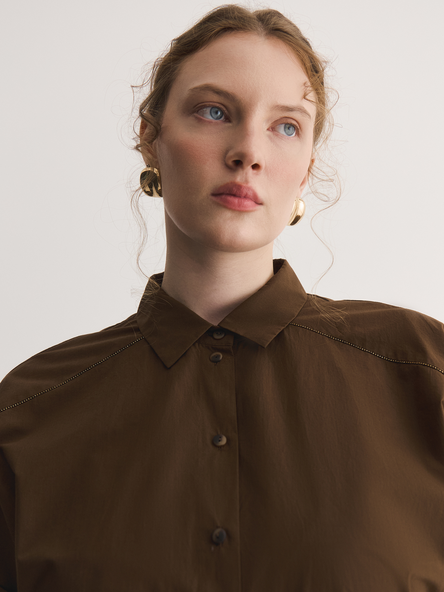 Полочка с планкой и кокеткой, цельнокроеные рукава с манжетами делают силуэт аккуратным. Тёплый молочно-шоколадный цвет выглядит уютно и универсально.