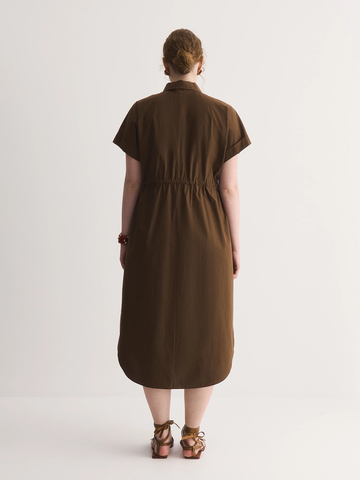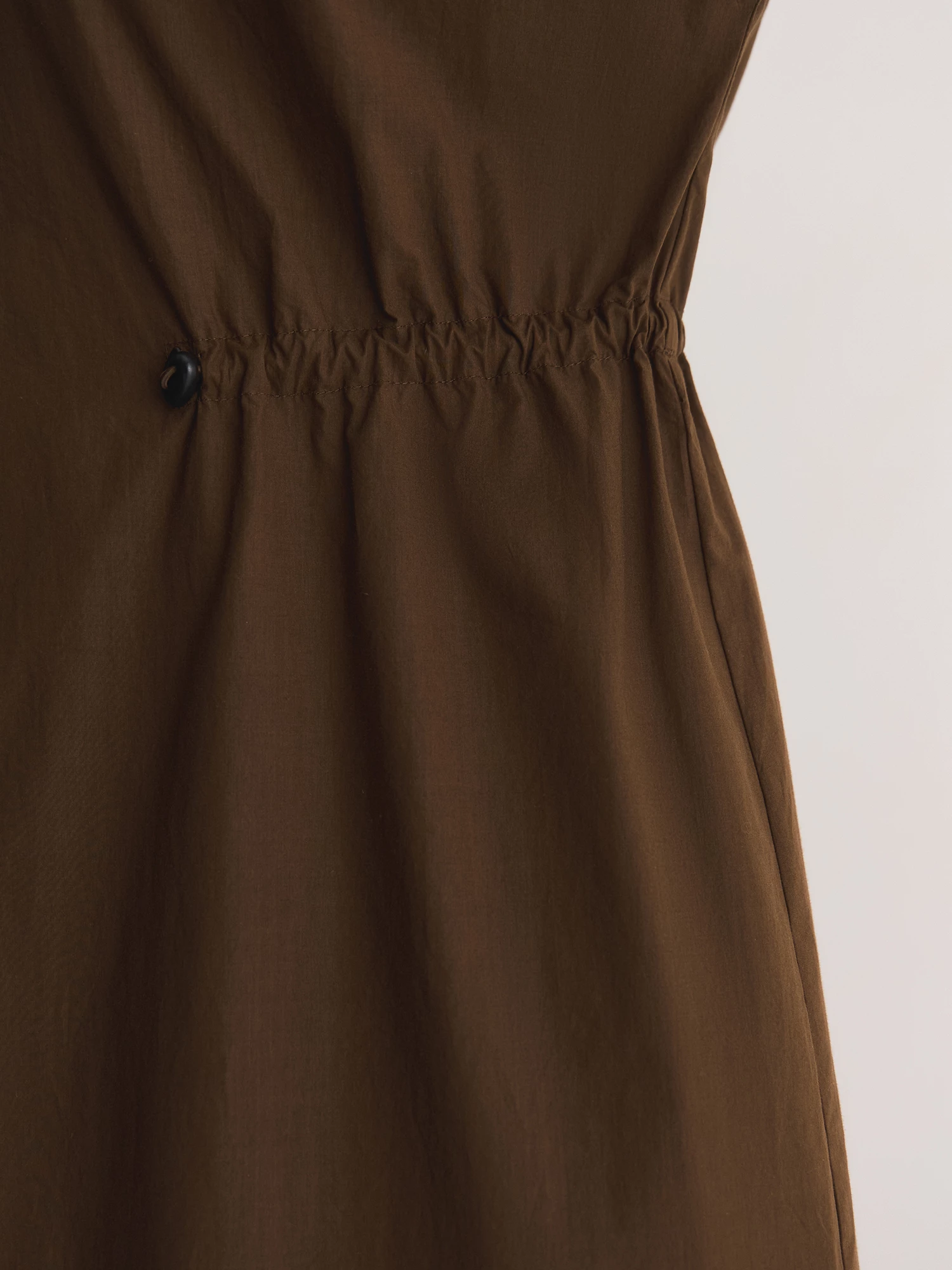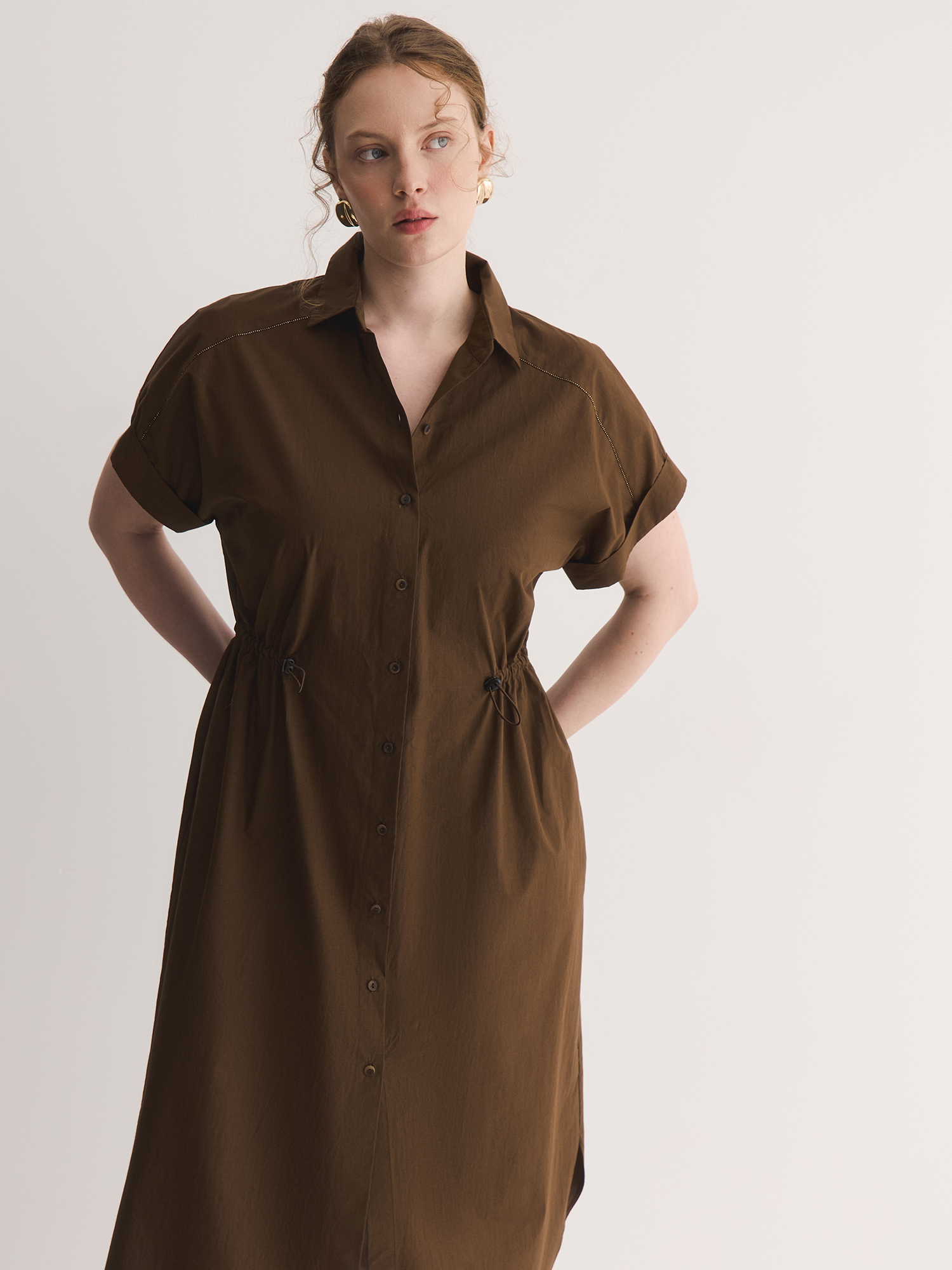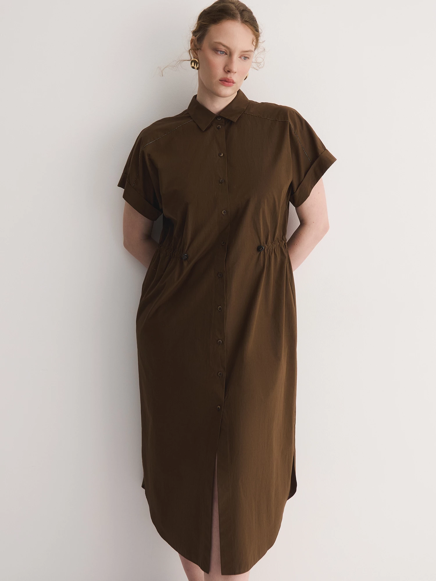 Платье из 100% хлопка сочетает в себе комфорт и продуманный крой. Кулиска с фиксаторами на талии позволяет регулировать посадку, а отложной воротник добавляет элегантности.