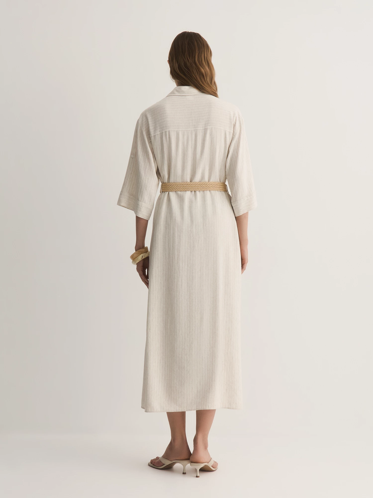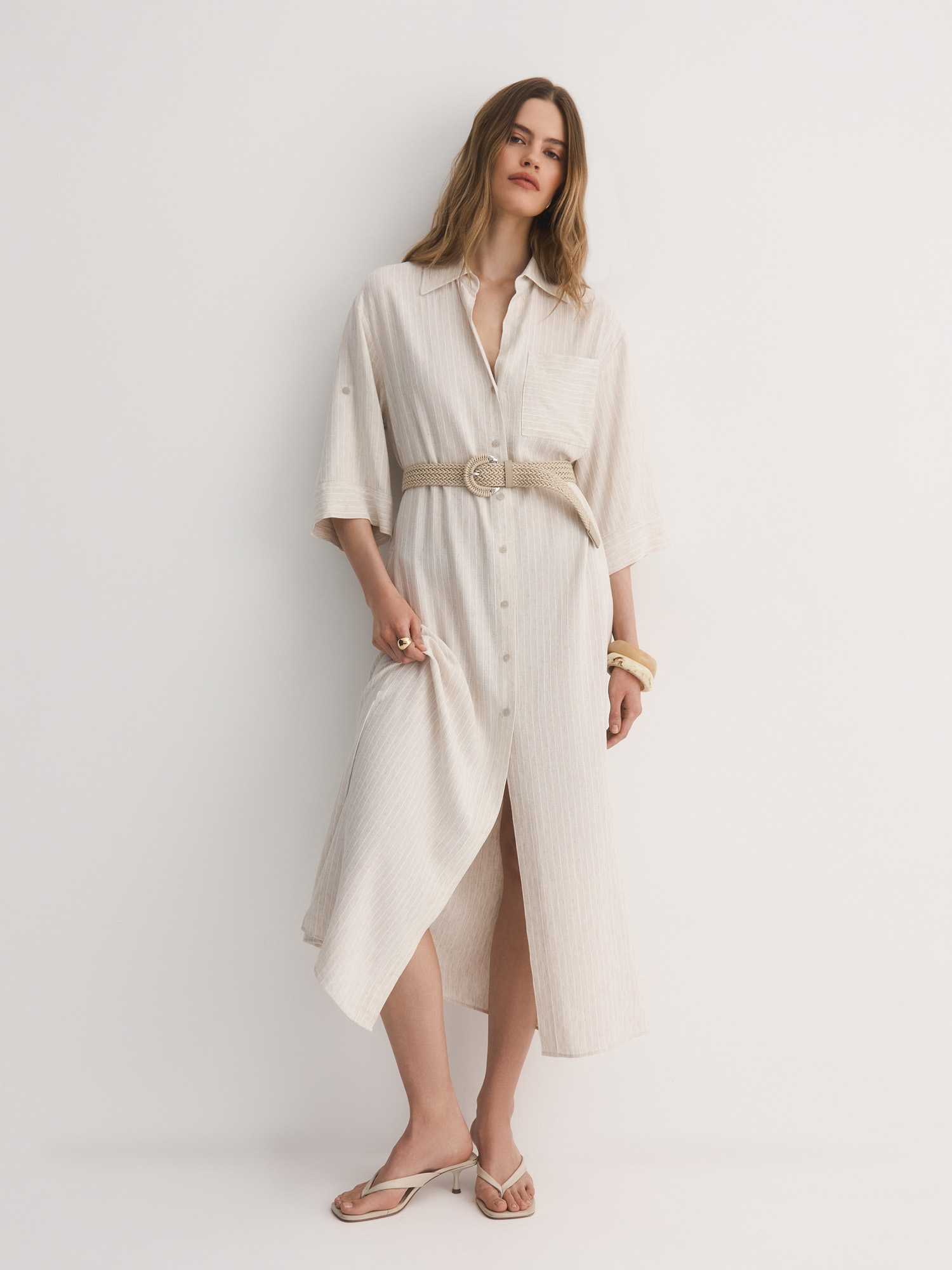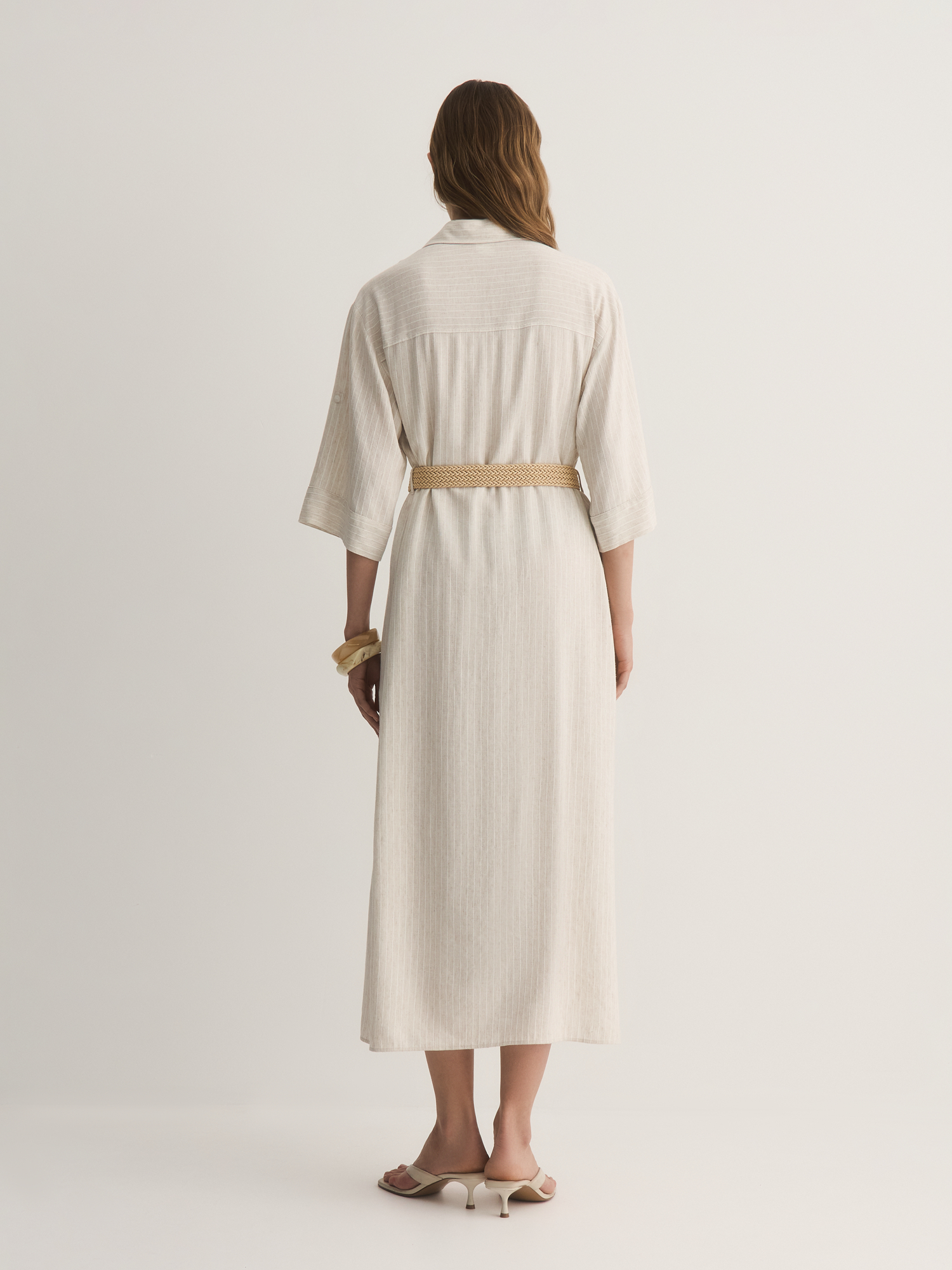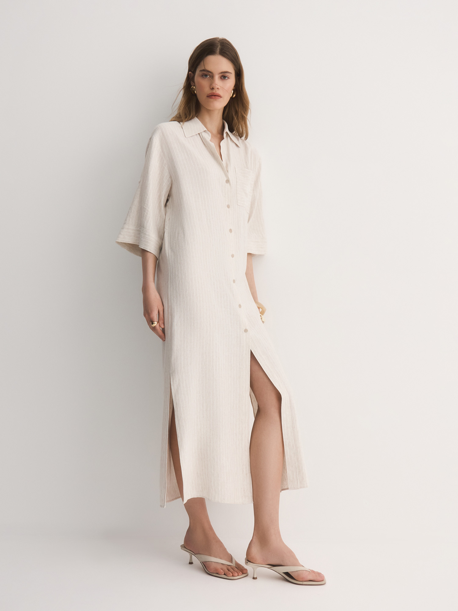 Прямое платье-рубашка – идеальный вариант для тех, кто ценит комфорт и стиль. Выбрали для модели смесовую легкую ткань с шелковистой вискозой, фактурным льном и прочным полиэстером. Нежный бежевый оттенок с тонкой светлой полоской делает его универсальным для любого случая.