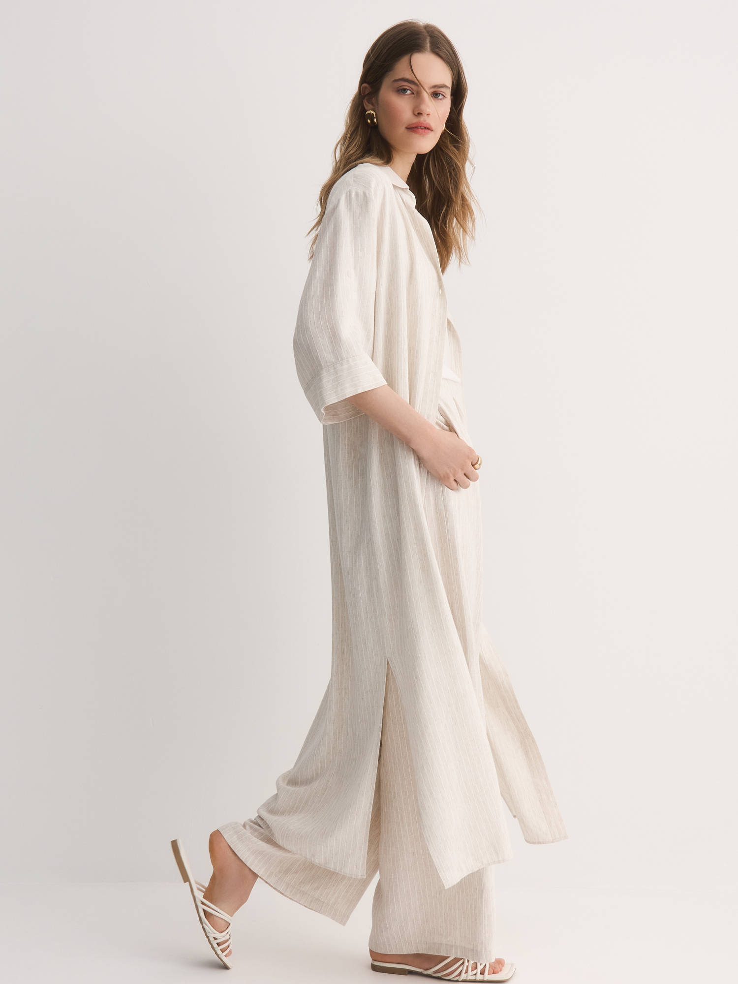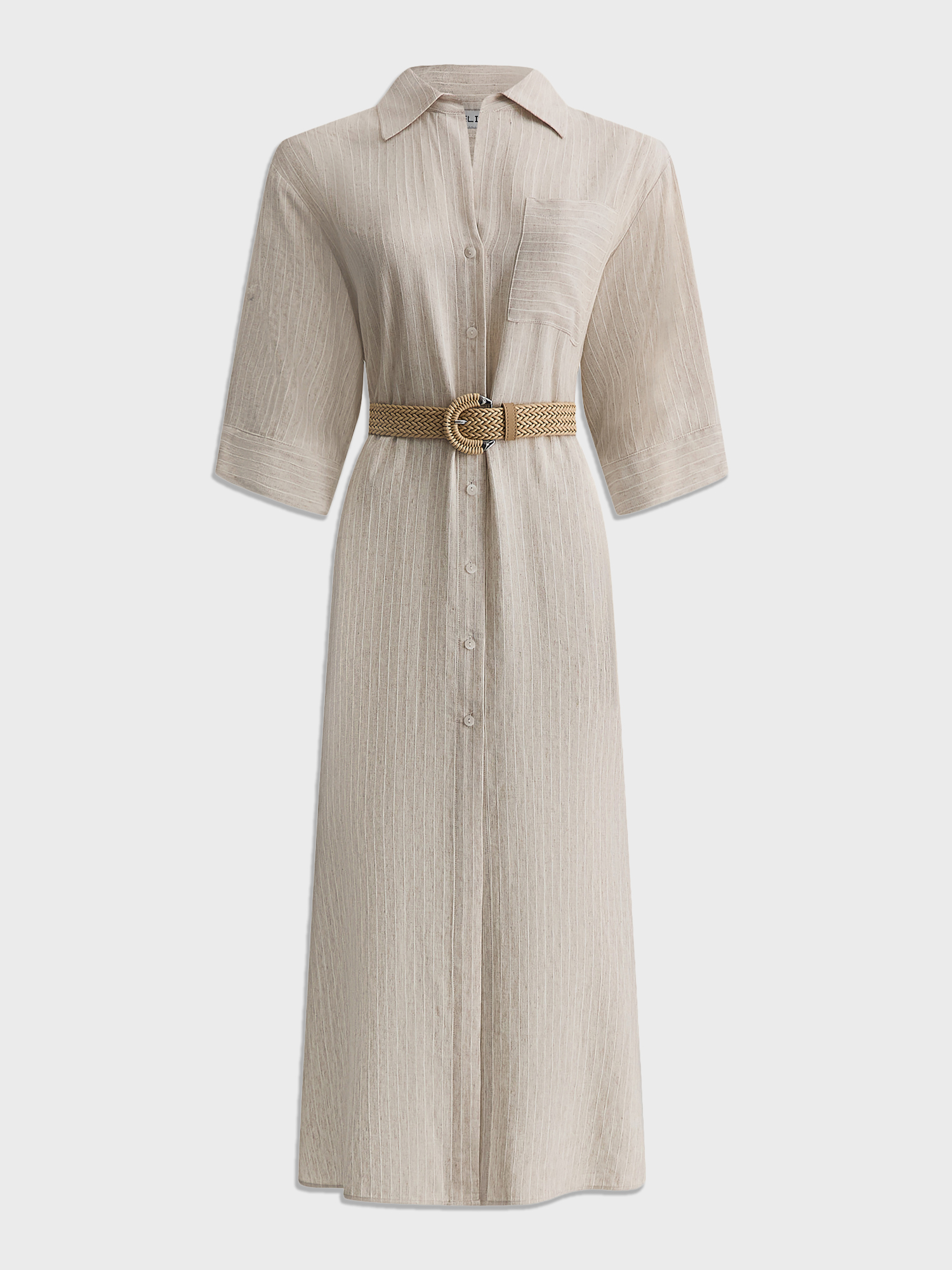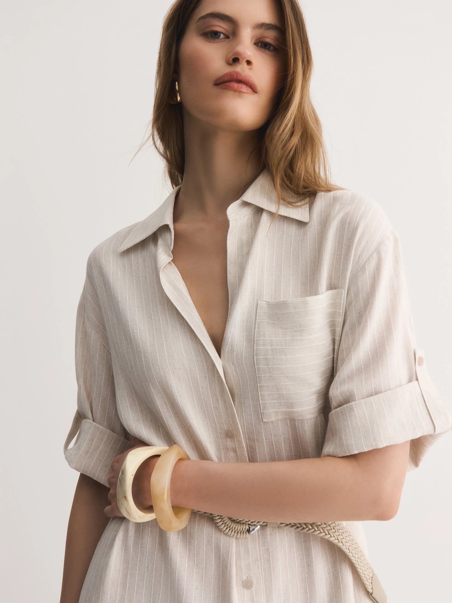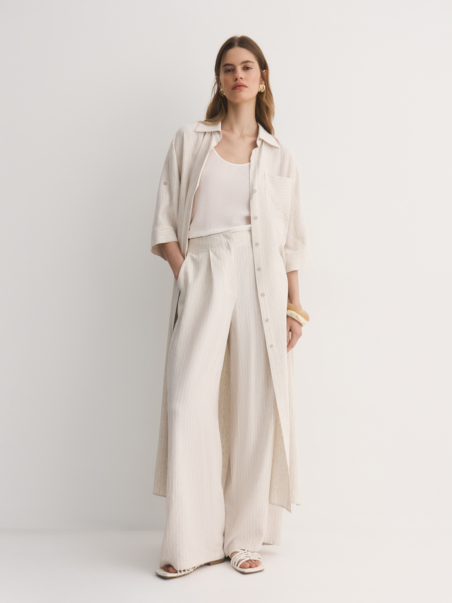 Прямое платье-рубашка – идеальный вариант для тех, кто ценит комфорт и стиль. Выбрали для модели смесовую легкую ткань с шелковистой вискозой, фактурным льном и прочным полиэстером. Нежный бежевый оттенок с тонкой светлой полоской делает его универсальным для любого случая.