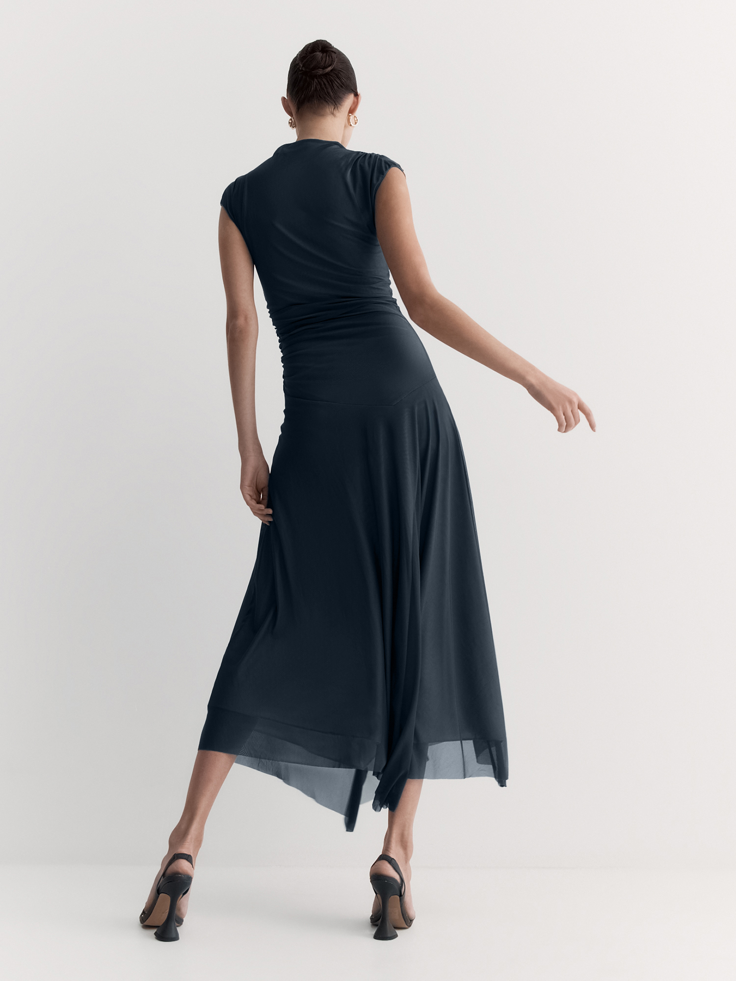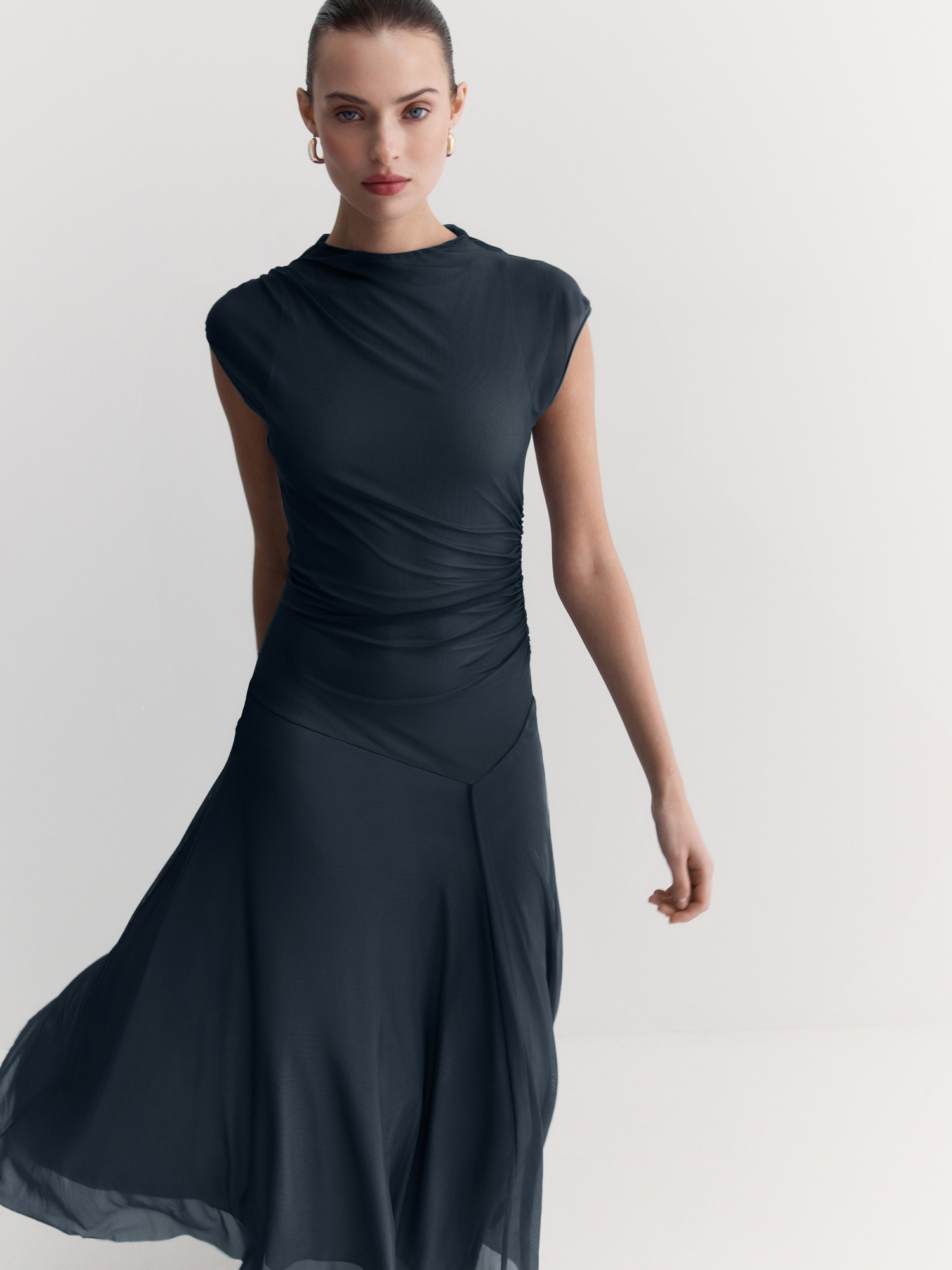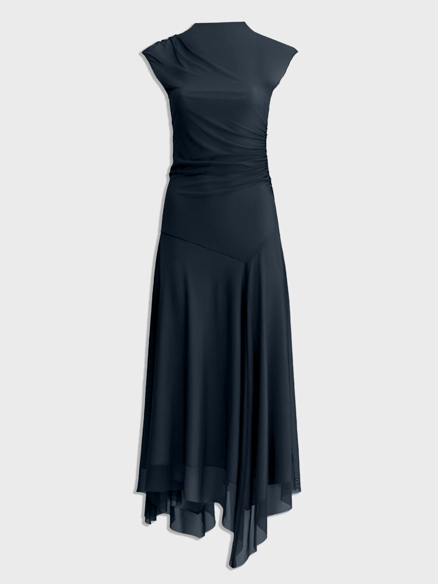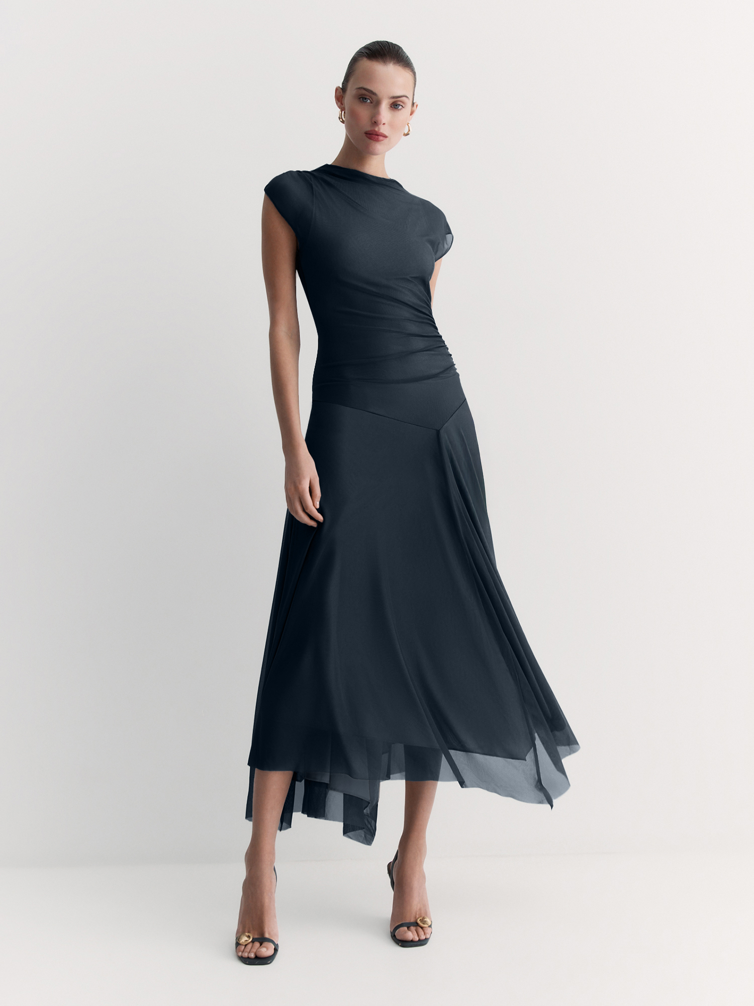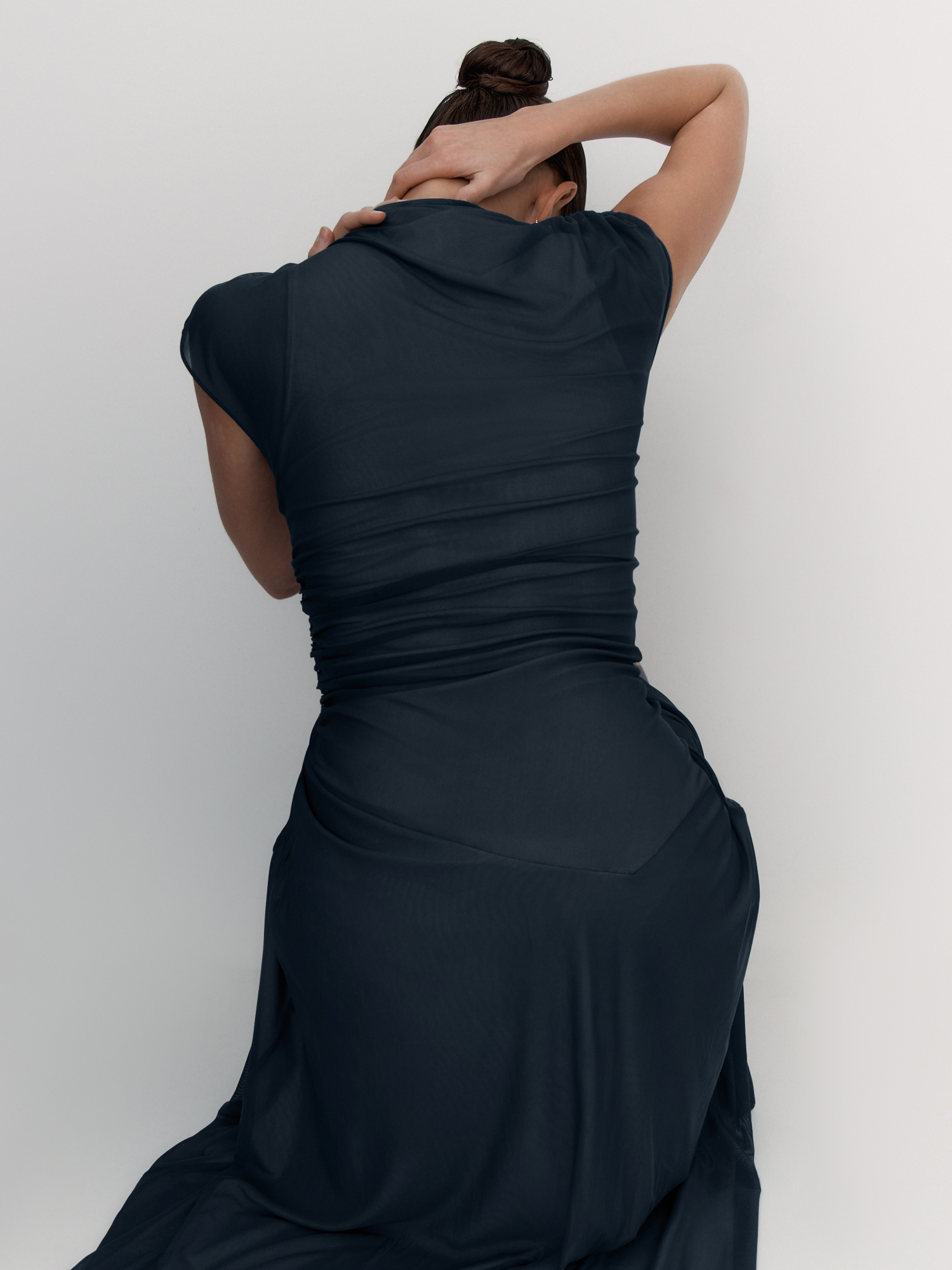 Воздушное платье с асимметрией кроя – смелый выбор для создания эффектного образа. Сшито из специальной сетки с бесшовной обработкой краев, что делает силуэт лёгким и невесомым. Звездный темно-бирюзовый цвет делает модель особенной.