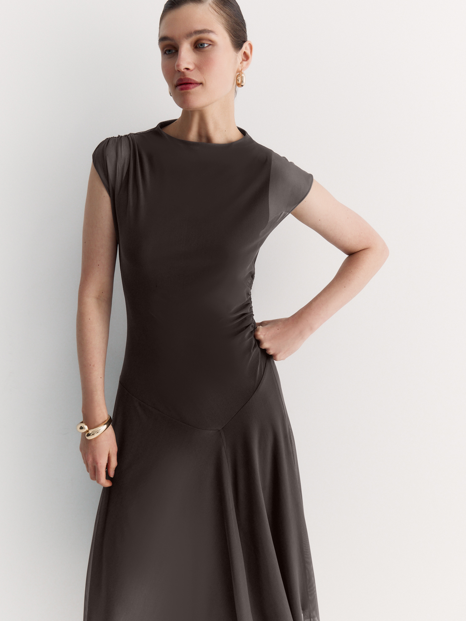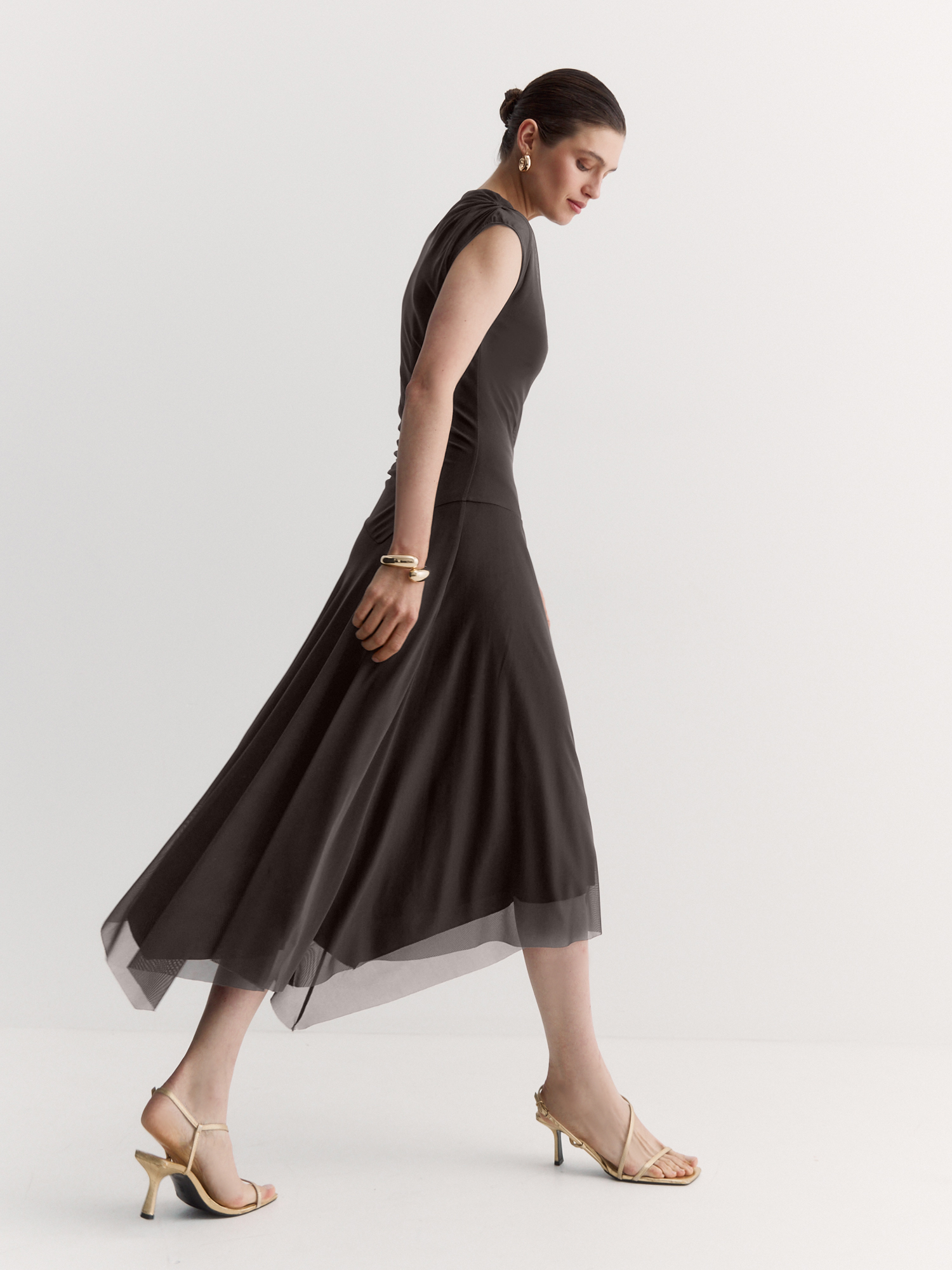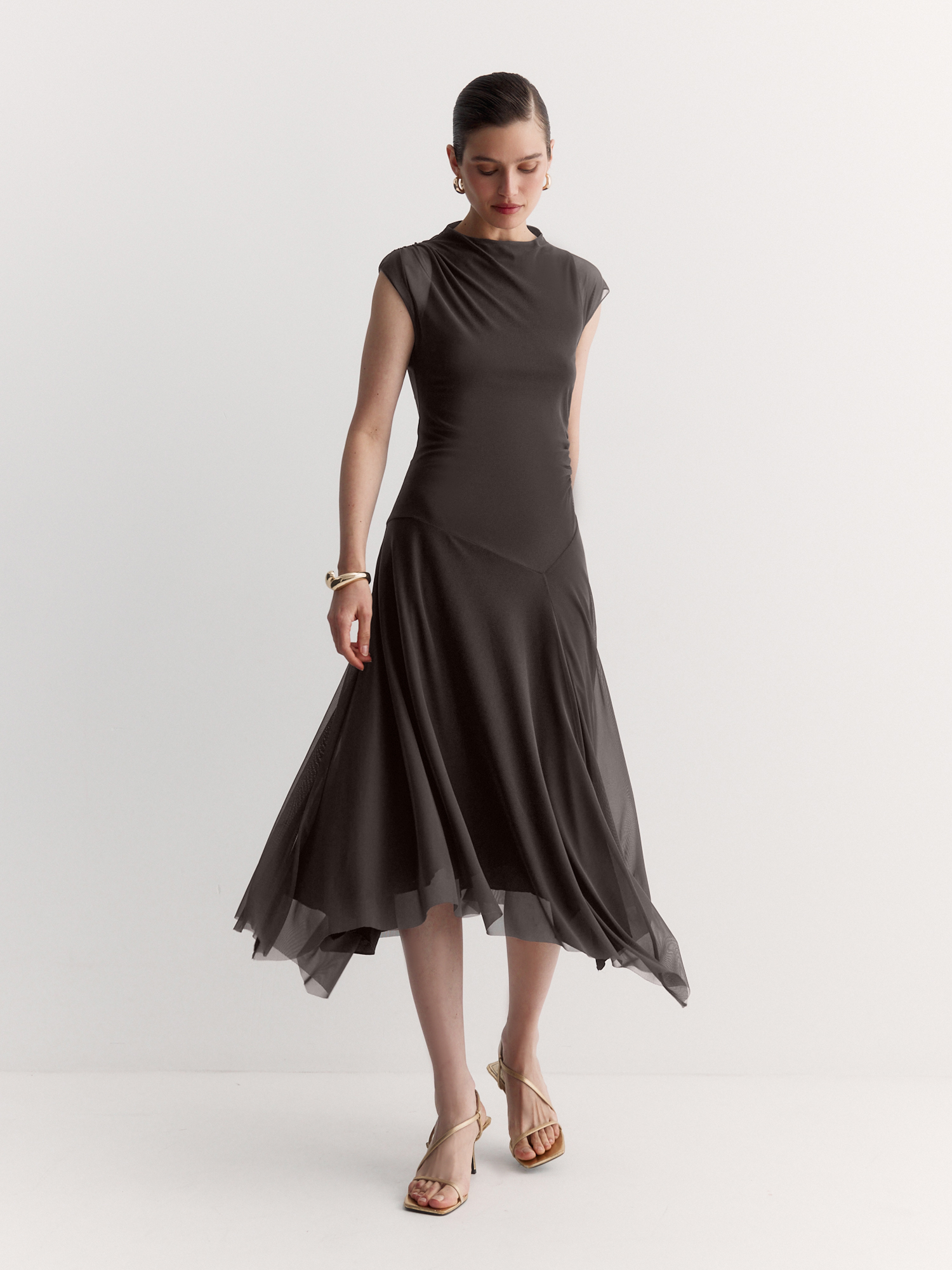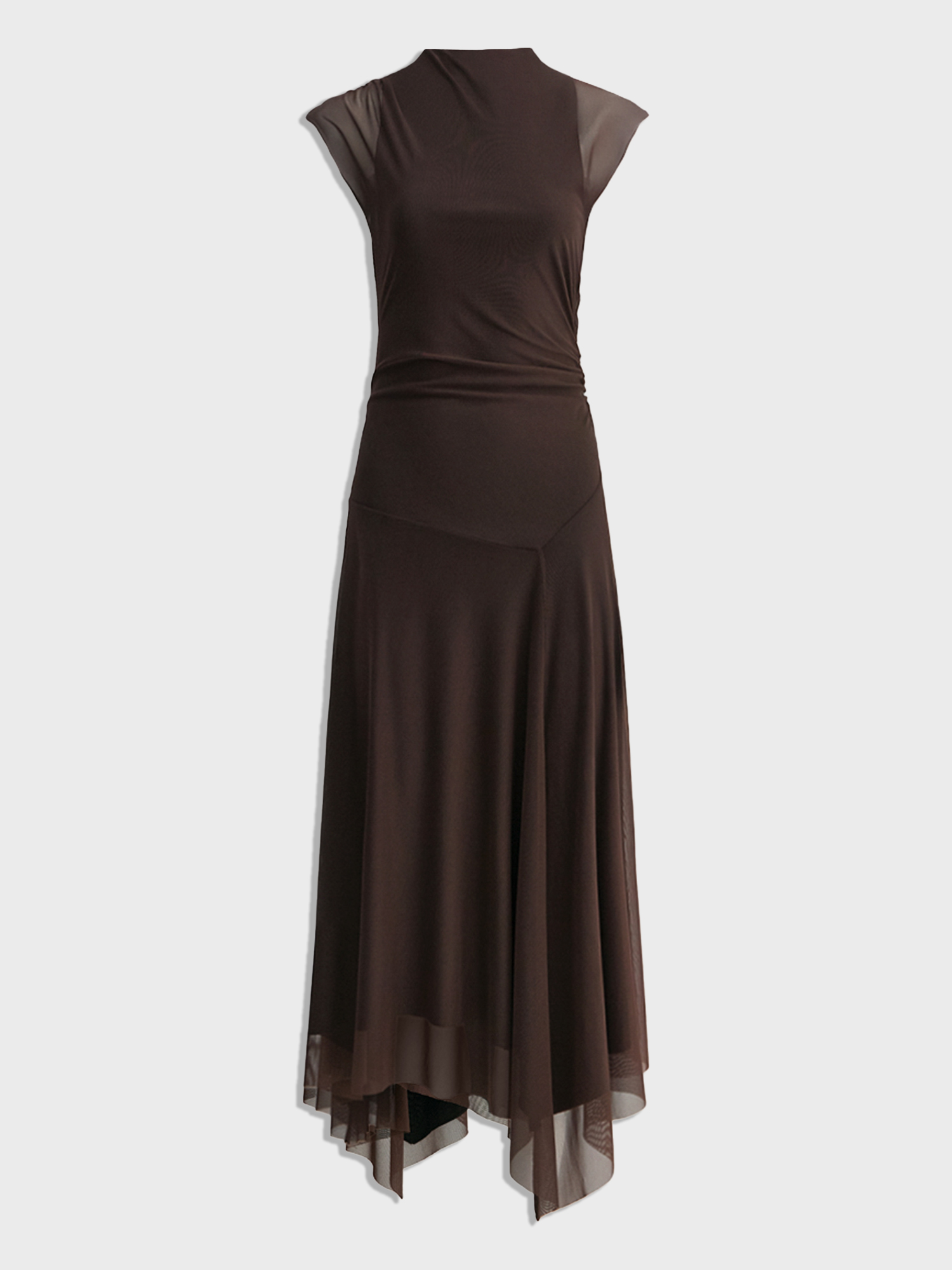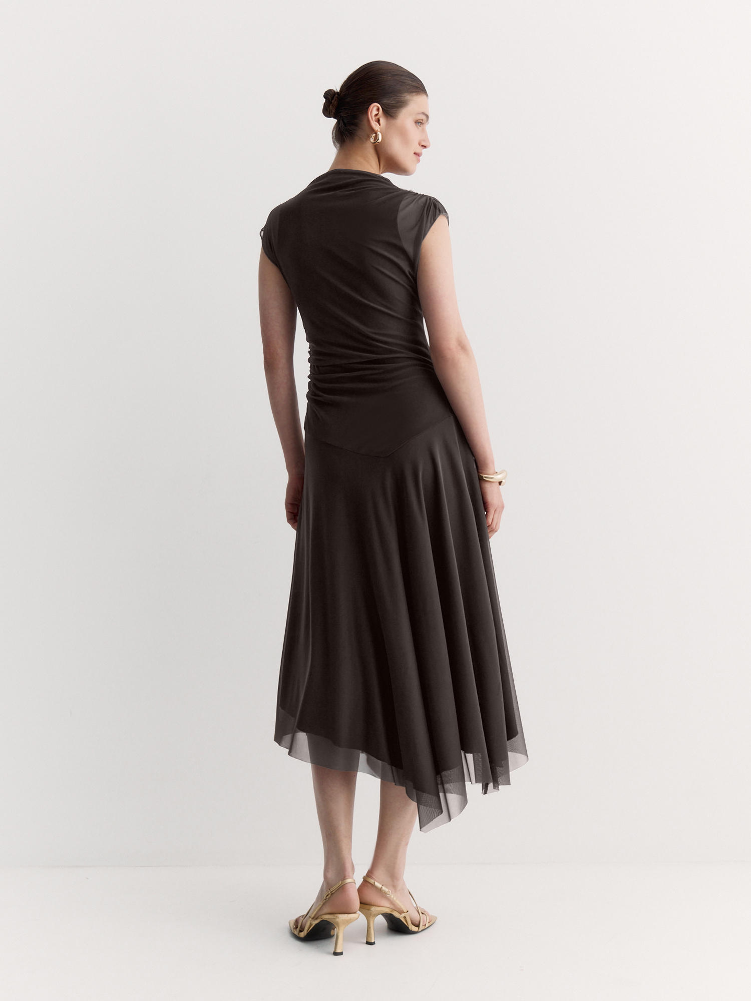 Воздушное платье с асимметрией кроя – смелый выбор для создания эффектного образа. Сшито из специальной сетки с бесшовной обработкой краев, что формирует легкий и невесомый силуэт. Вкусный шоколадный цвет делает модель востребованной в любом сезоне.