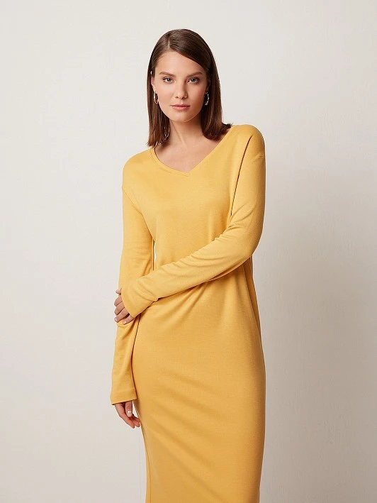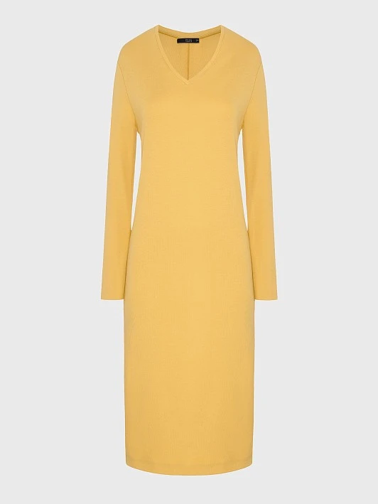 Яркое платье насыщенного жёлтого цвета. Выполнено из плотного гладкого вискозного трикотажа. Модель прямого силуэта, с V-образным вырезом горловины, чуть спущенной линией плеча и длинным втачным рукавом. Комфортный крой обеспечивает удачную посадку на любой тип фигуры. Длина изделия оптимальная - чуть ниже линии колена. Образ можно дополнить челси или лоферами.