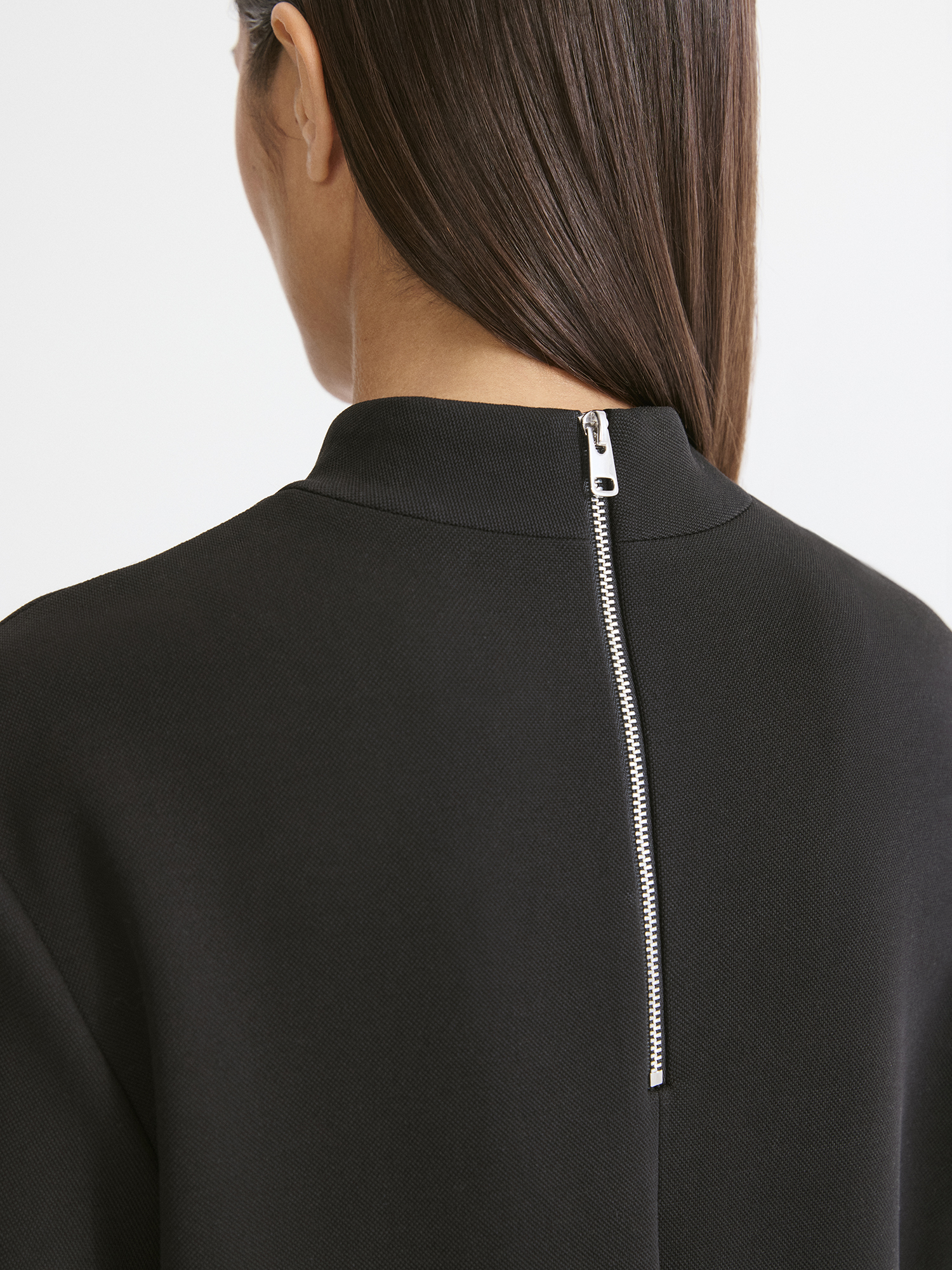 Минималистичное платье в классическом черном незаменимо в базовом гардеробе. Модель отличается отрезным воротником-стойкой, коротким втачным рукавом и аккуратным полуприлегающим силуэтом, дополнена удобной застежкой на спине на потайную молнию и разрезом для комфорта шага.