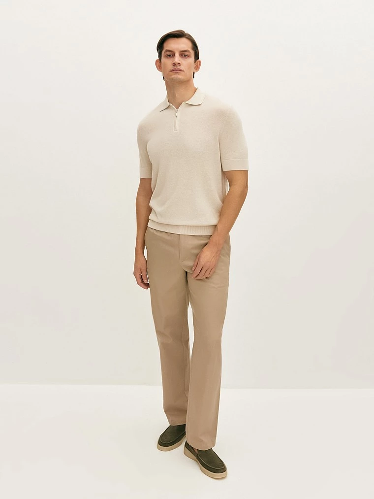 Лаконичное вязанное поло светло-бежевого оттенка прямого силуэта, выполнено из мягкой хлопковой пряжи фактурного эластичного переплетения и обладает отличной терморегуляцией. Модель с застёжкой на тесьму-молнию, коротким рукавом, манжетами, отложным воротником и мягкой резинкой по низу изделия. Вязанное поло идеально подойдет для базового гардероба современного мужчины, особенно в весенне-летний период. В сочетании с чиносами или джинсами составит стильный повседневный образ.