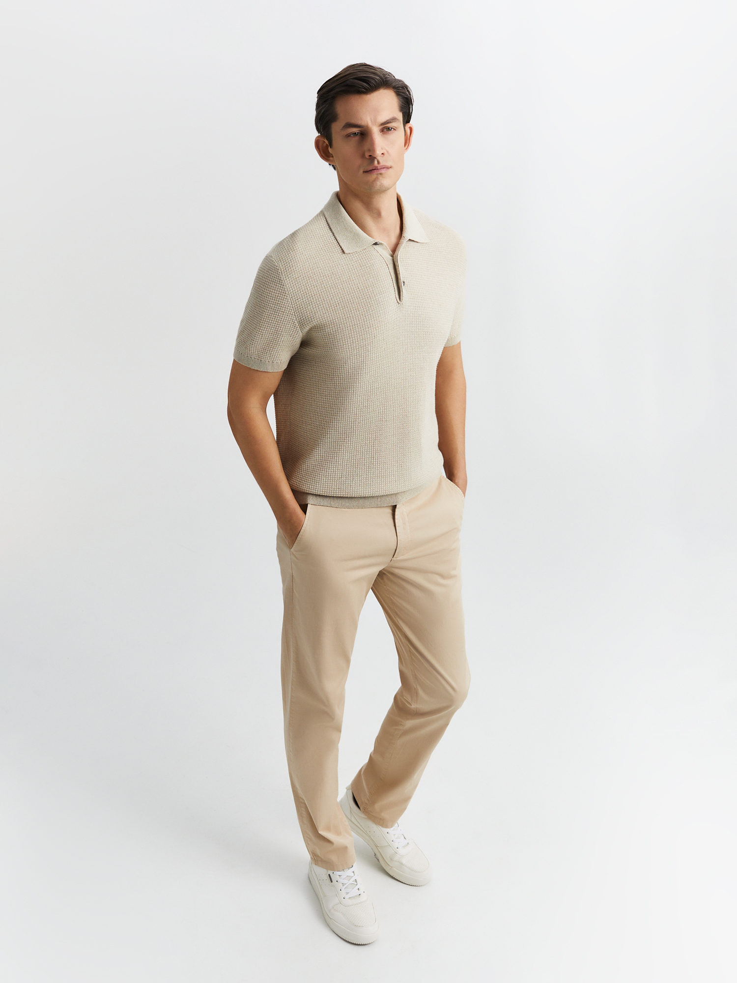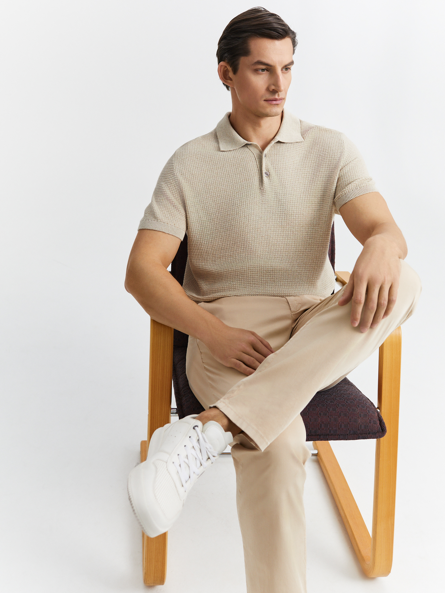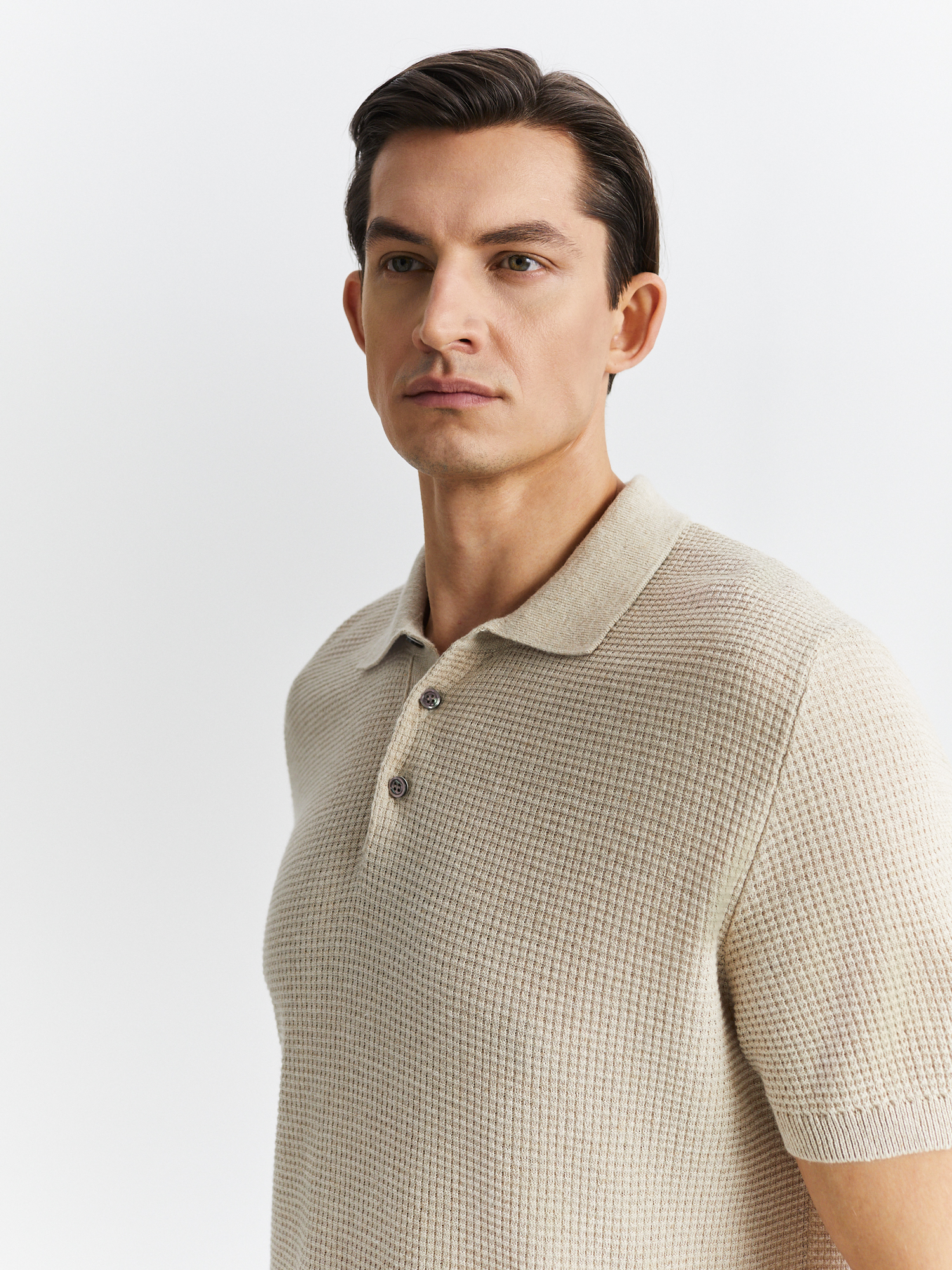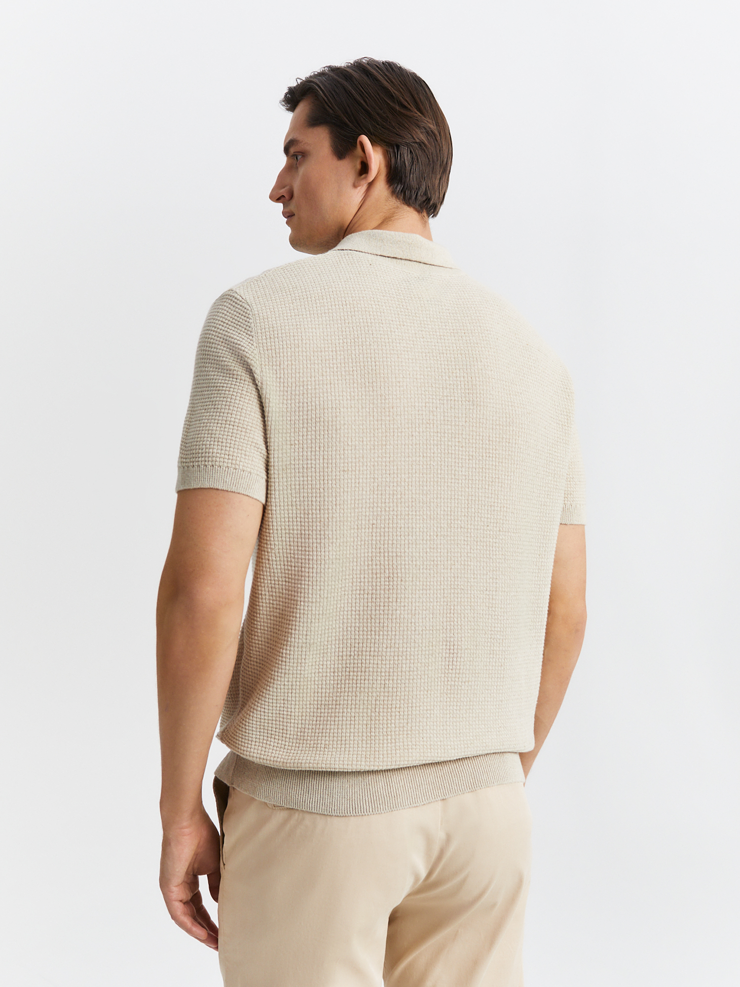 Вязаное поло прямого силуэта светло-бежевого оттенка с фактурным эластичным переплетением. Мягкая пряжа на основе льна и вискозы с добавлением переработанных полиэтровых волокон прочная и не деформируется со временем. Модель с застёжкой на три пуговицы, коротким рукавом, отложным воротником и манжетами из мягкой, приятно растяжимой резинки по низу изделия. Вязанное поло идеально подойдет для летнего гардероба и гармонично дополнит комплект с чиносами, джинсами и мягкими лоферами.