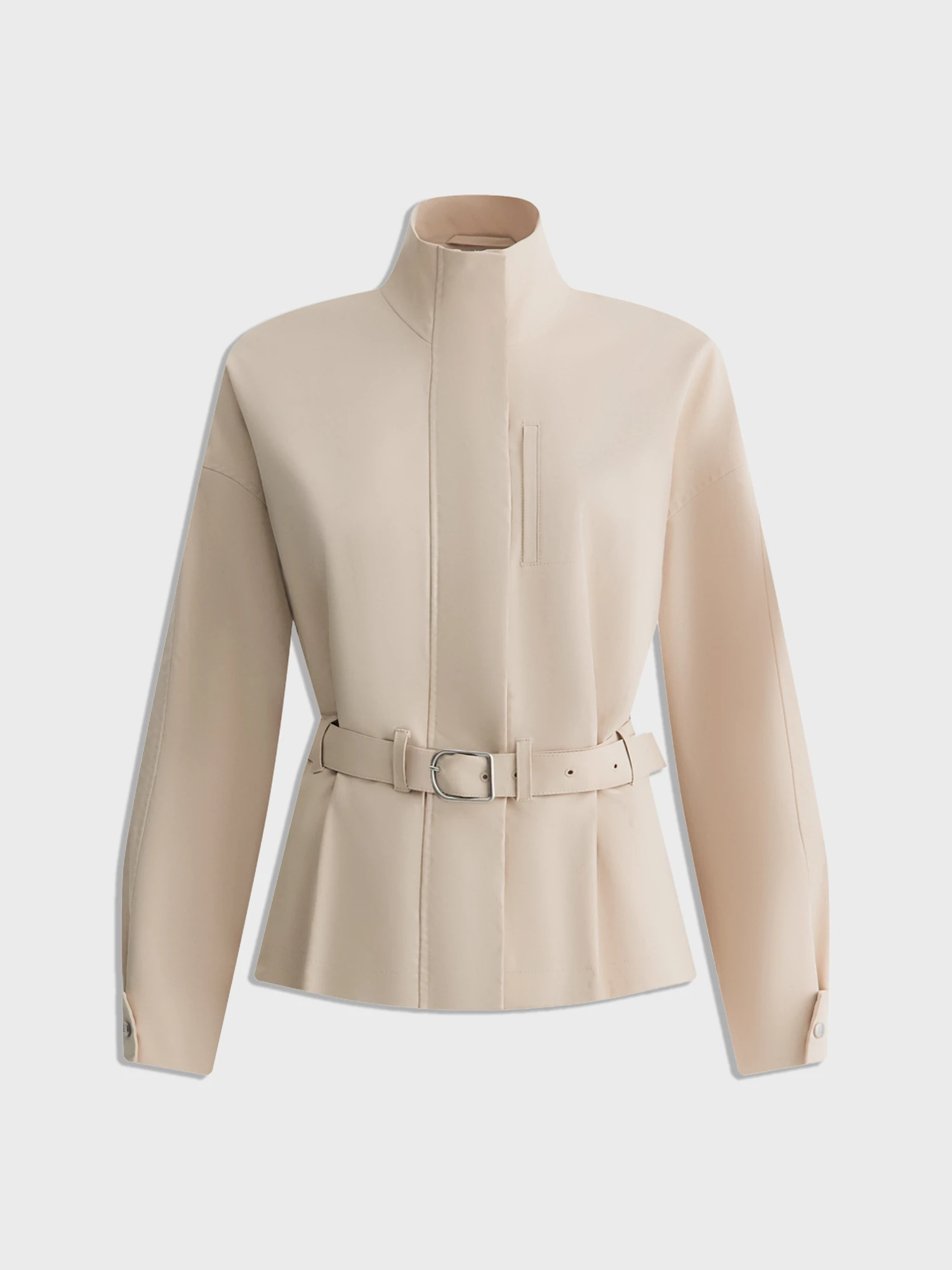 Отрезной воротник-стойка и втачные рукава со спущенным плечом создают аккуратный силуэт. Закрытая встречная складка на спине и пояс из основной ткани добавляют удобства. Декоративный нагрудный карман с листочкой и вертикальным входом в поддержку стиля.