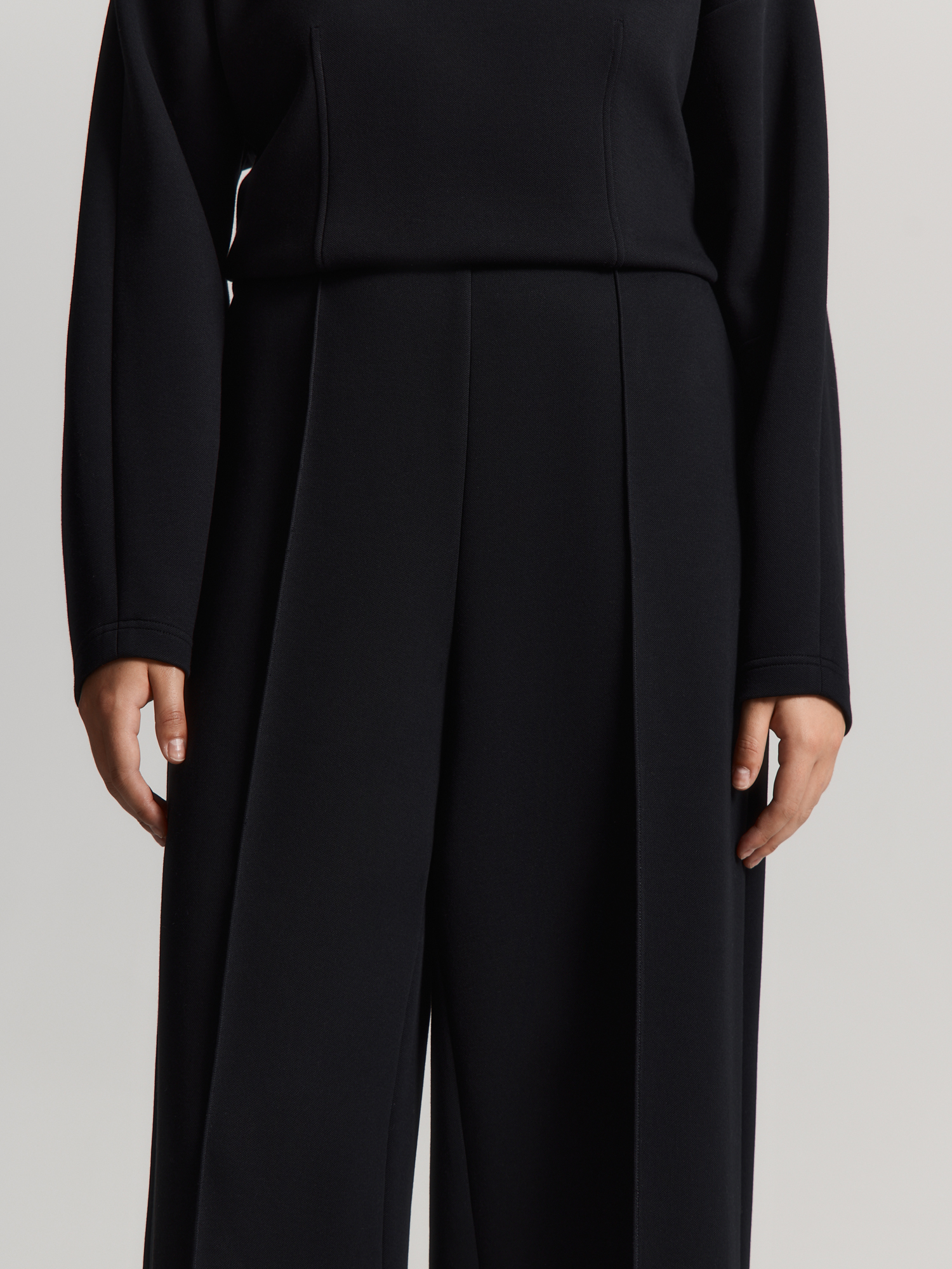 Модель корсетного типа, без притачного пояса. Застроченные стрелки добавляют брюкам чёткость и элегантность.