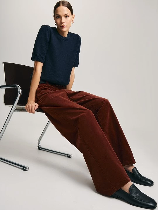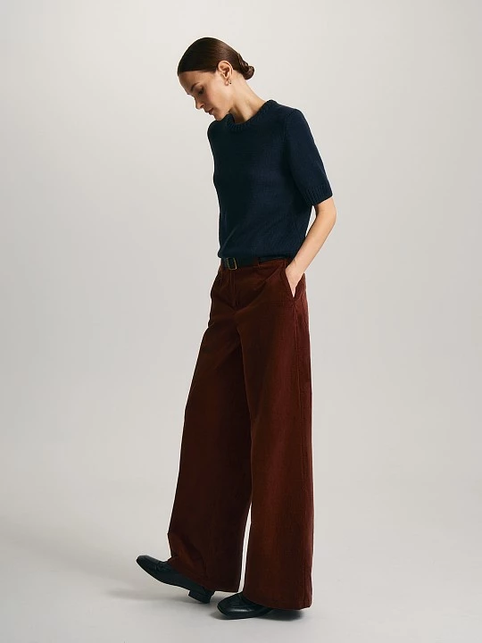 Брюки с высокой посадкой, но без притачного пояса, дополнены шлевками, позволяющими дополнительно подчеркнуть талию. Прямая модель отлично сидит на фигуре за счет вытачек и оптимальной ширины брючин. Косые боковые и задние накладные карманы функциональны и комфортны, как и традиционная застежка-гульфик на молнию и пуговицу. Для брюк выбрали качественный хлопковый вельветин с ровным мягким ворсом. Такое полотно хорошо держит тепло и заданную форму. Хлопок гиппоаллергенен, тактильно приятен и хорошо дышит. Эффектный цвет жженой карамели из осенней палитры акцентирует на себе внимание и хорошо сочетается с базовыми классическими оттенками. Брюки будут востребованы как повседневные, офисные, школьные, а также для образов в кэжуал.