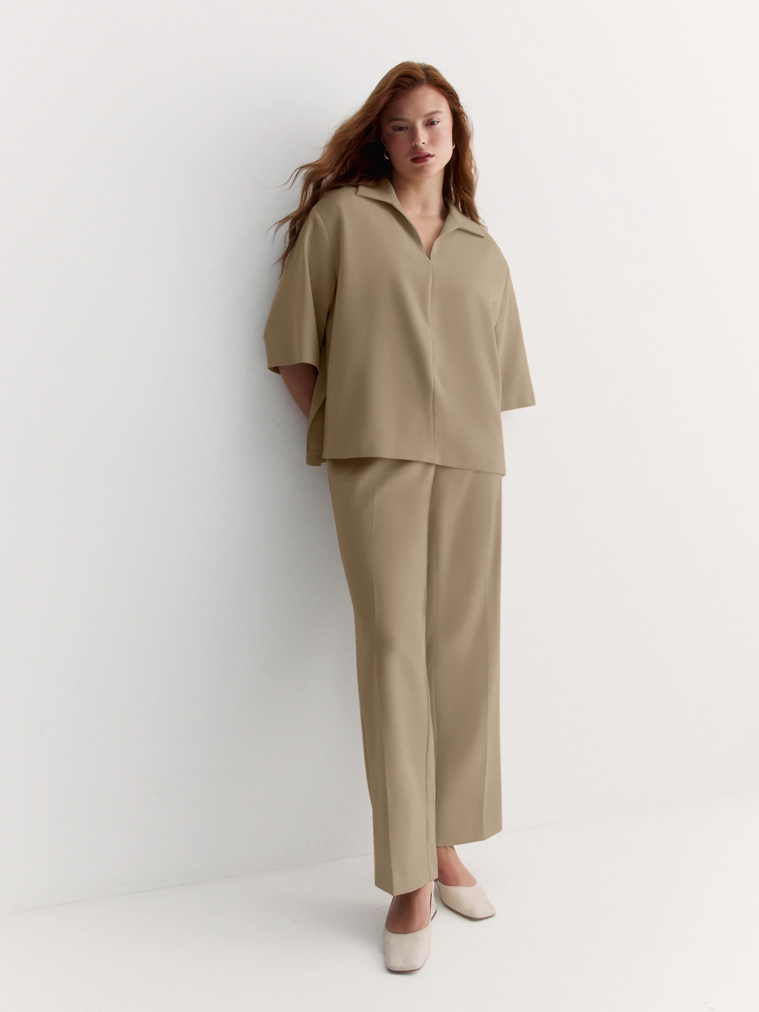 Нейтральный бежевый цвет делает эти брюки универсальными – они легко сочетаются с рубашками, блузами, свитерами, блузой BL1805. Подойдут и для офиса, и для повседневной носки. Удобные, элегантные и практичные – идеальный вариант на каждый день.