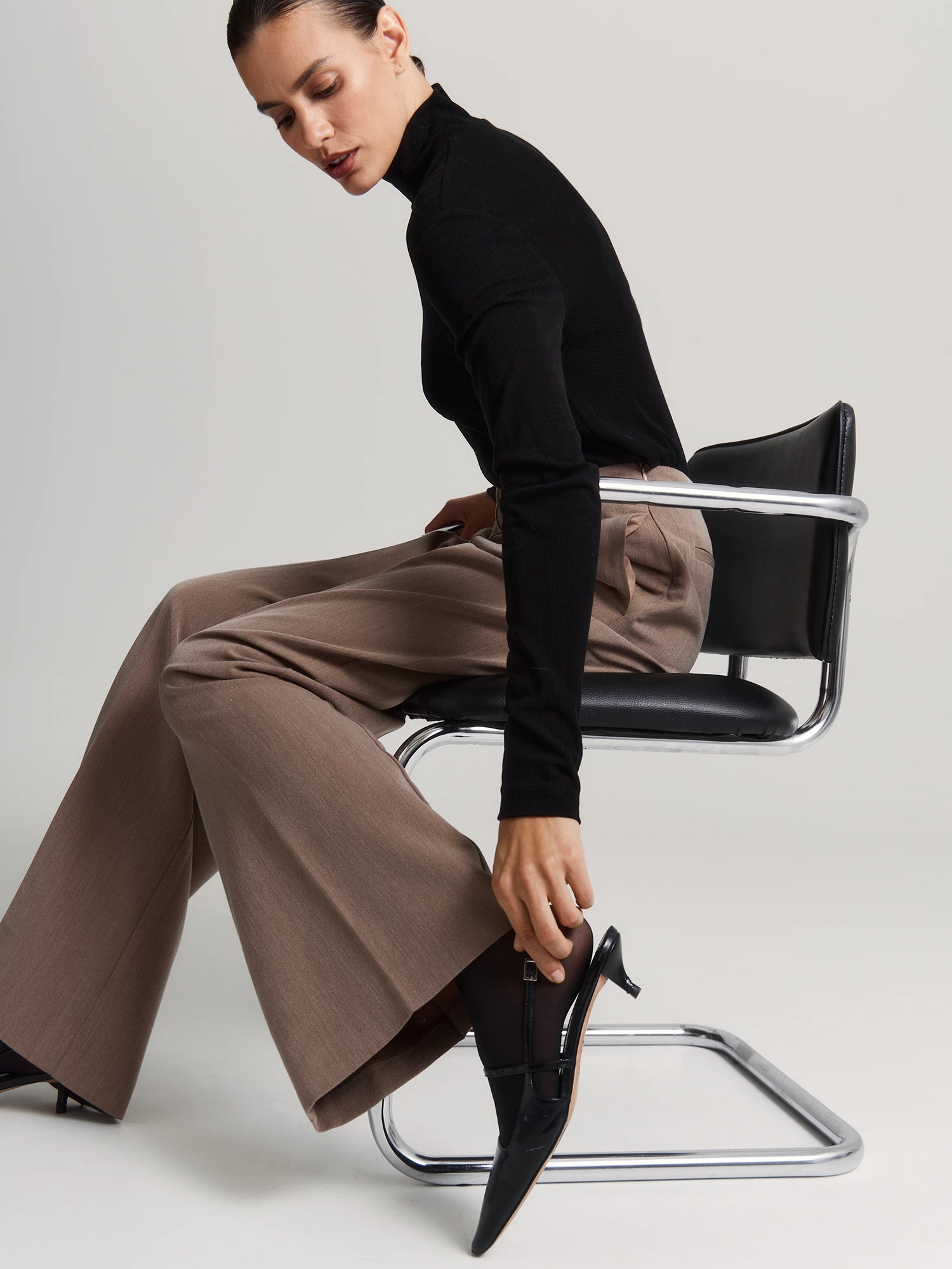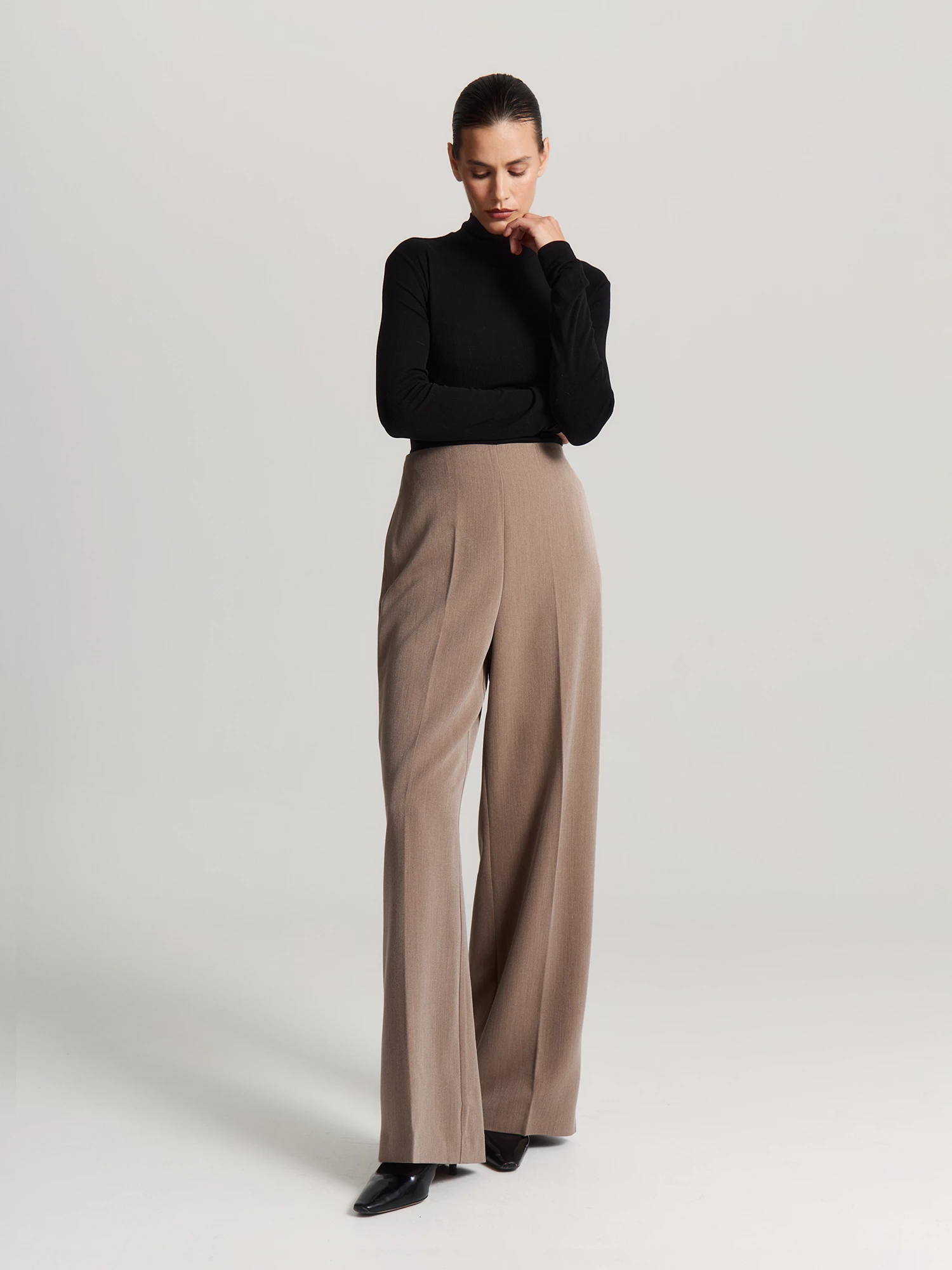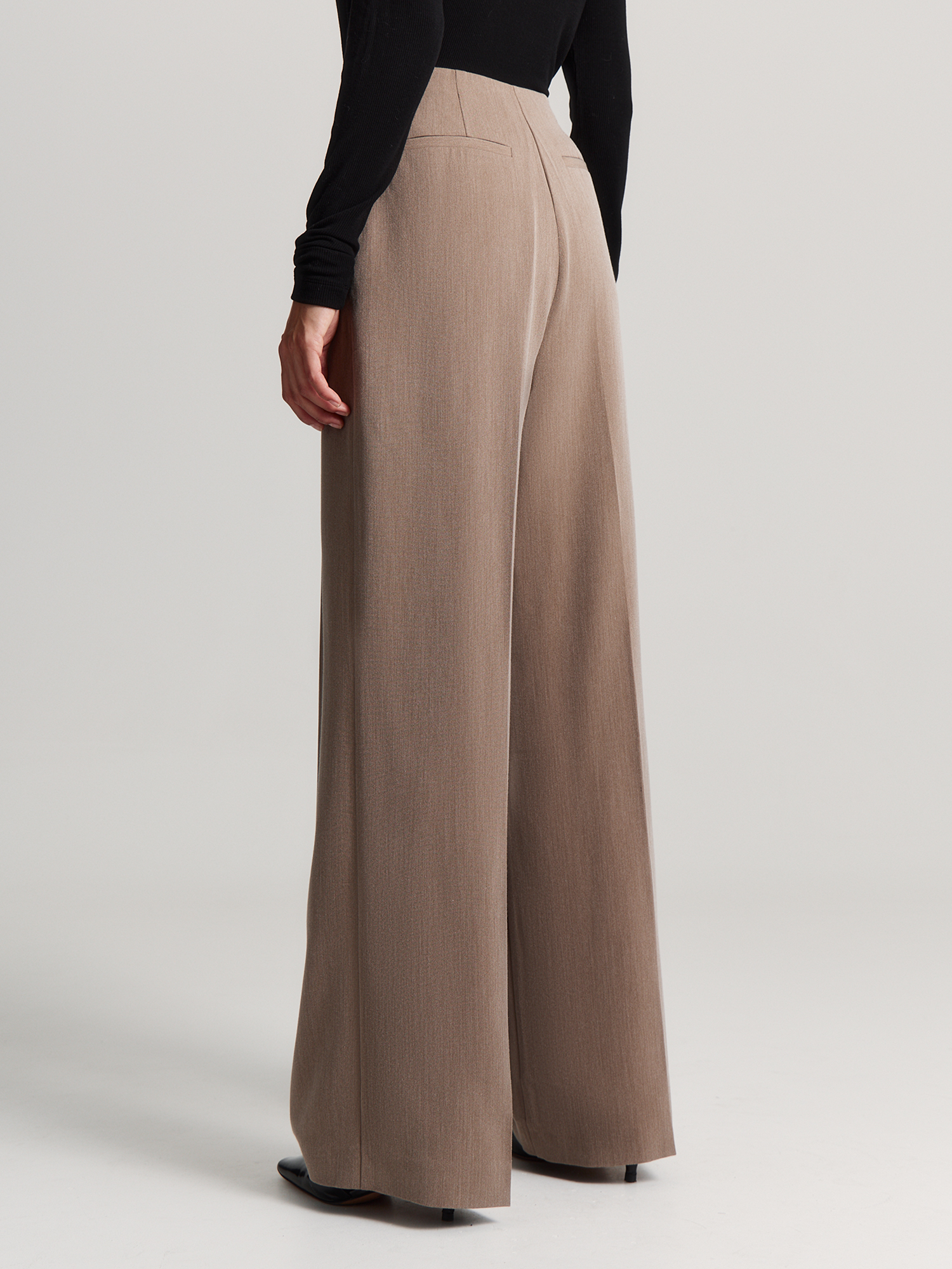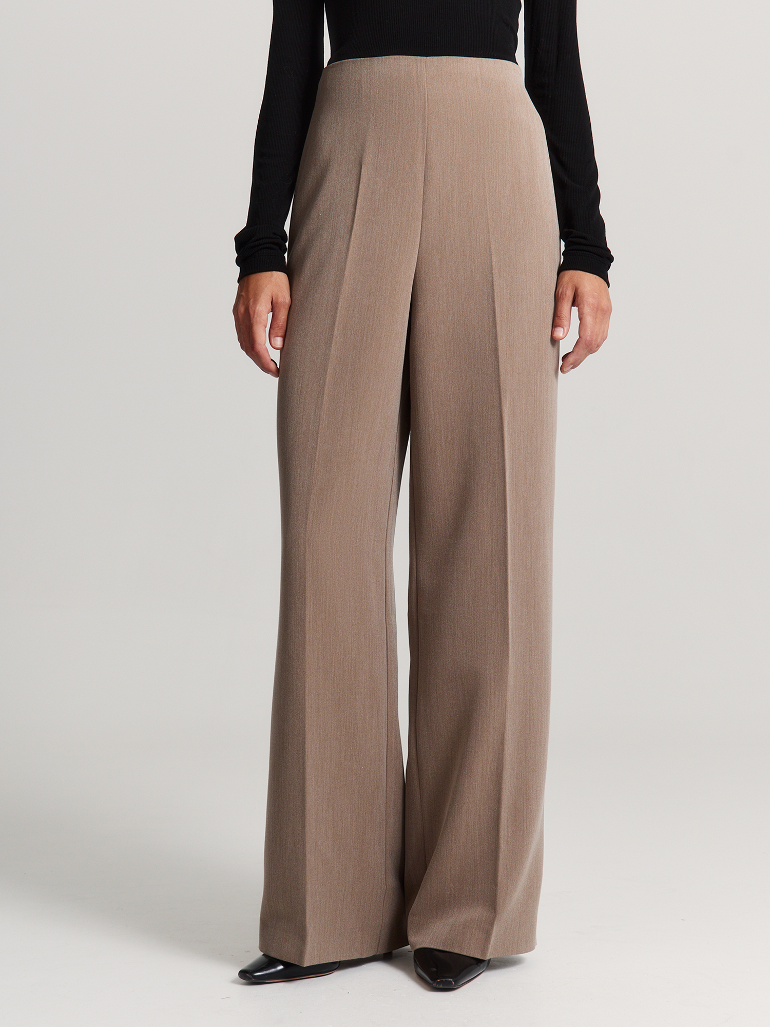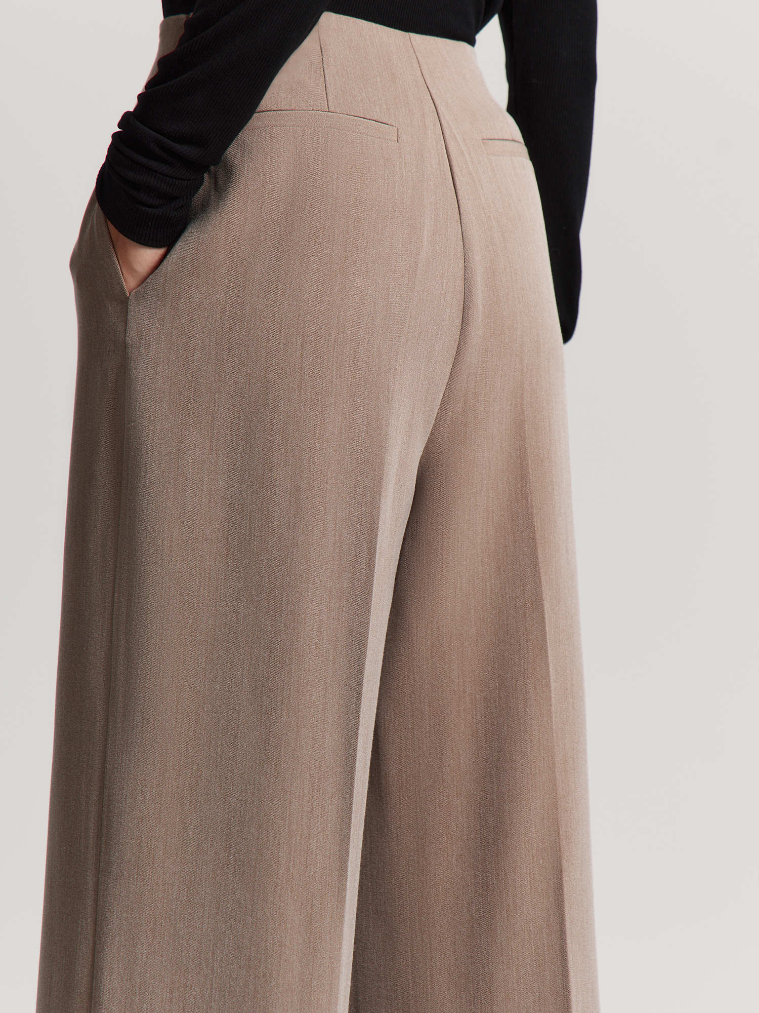 Брюки из прочной поливискозной ткани удобно сидят и практически не мнутся. Высокая талия с вытачками и без притачного пояса подчеркивает достоинства фигуры, а потайная молния сбоку обеспечивает комфортную посадку по бедрам.