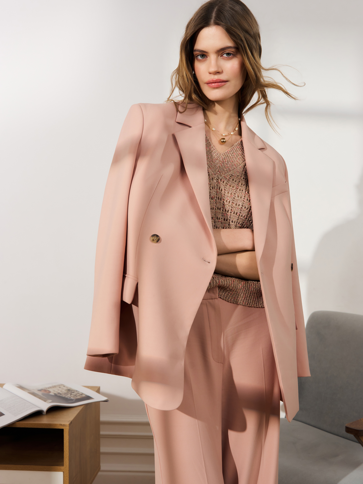Брюки идеально сочетаются с перестегивающимся жакетом JC0206.