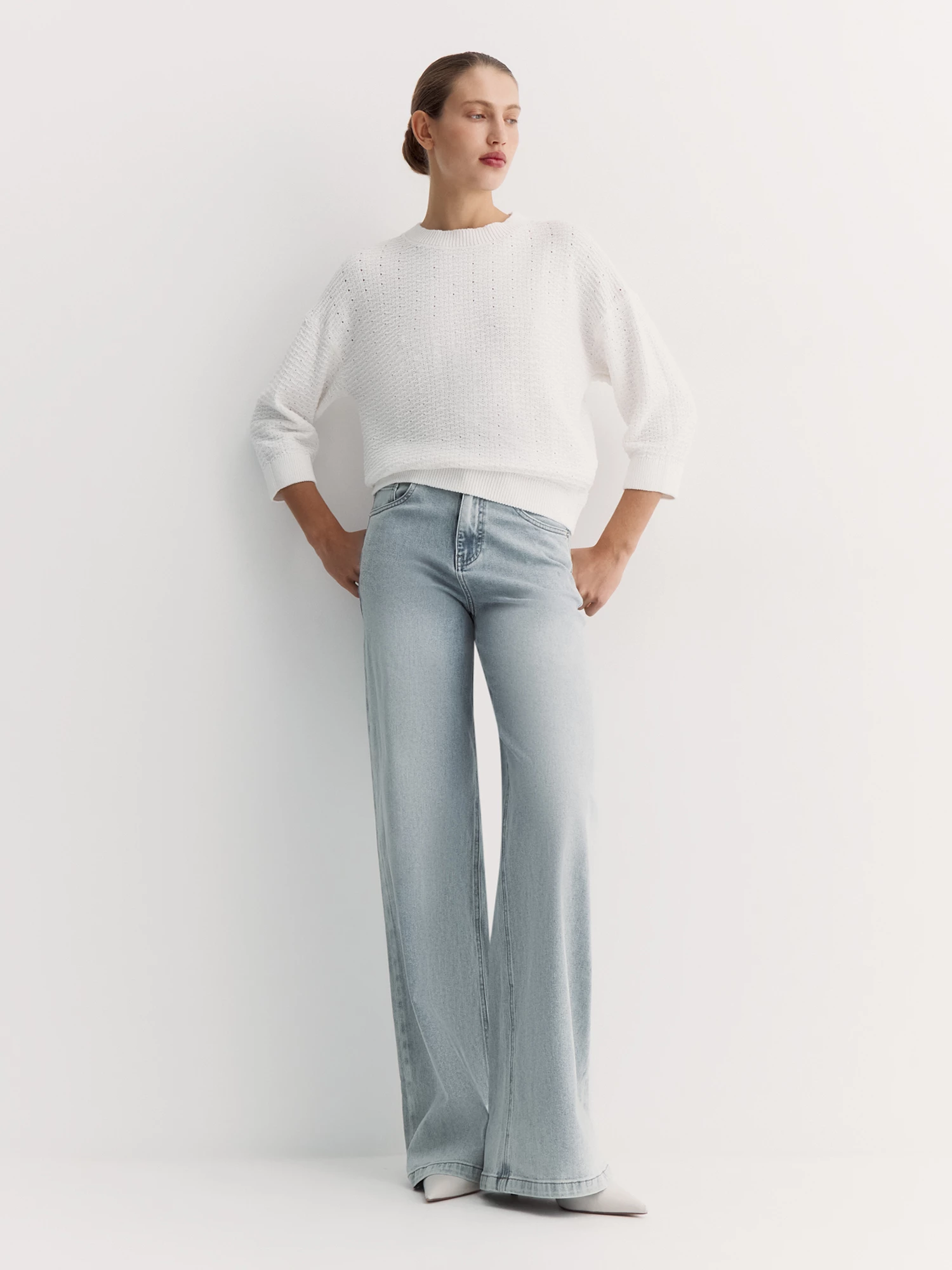 Широкие прямые джинсы relaxed fit - одна из составляющих базового гардероба. Высокая удобная посадка, застежка на молнию и болт, пять традиционных карманов и плоская кокетка - идеальная модель для повседневной носки и офисного кэжуала.